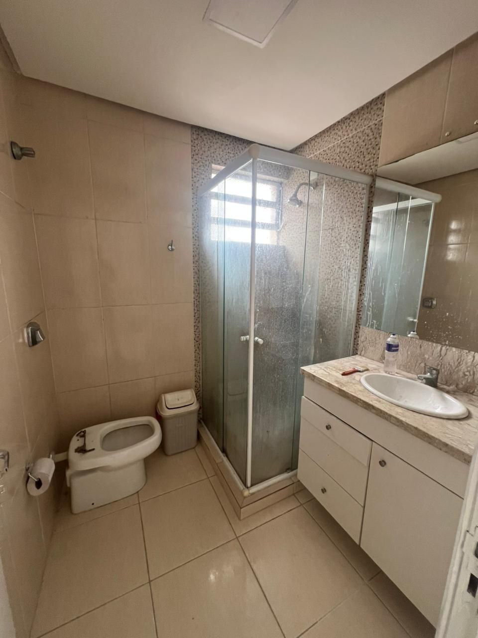 Banheiro completo com gabinete em granito e box de vidro