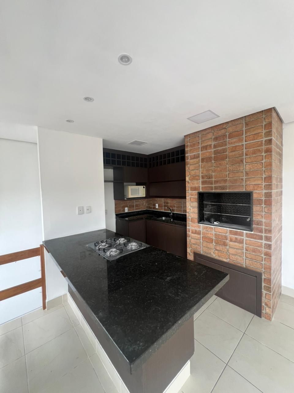 Cozinha mobiliada, com ilha em granito, cooktop, forno embutido, micro-ondas e churrasqueira