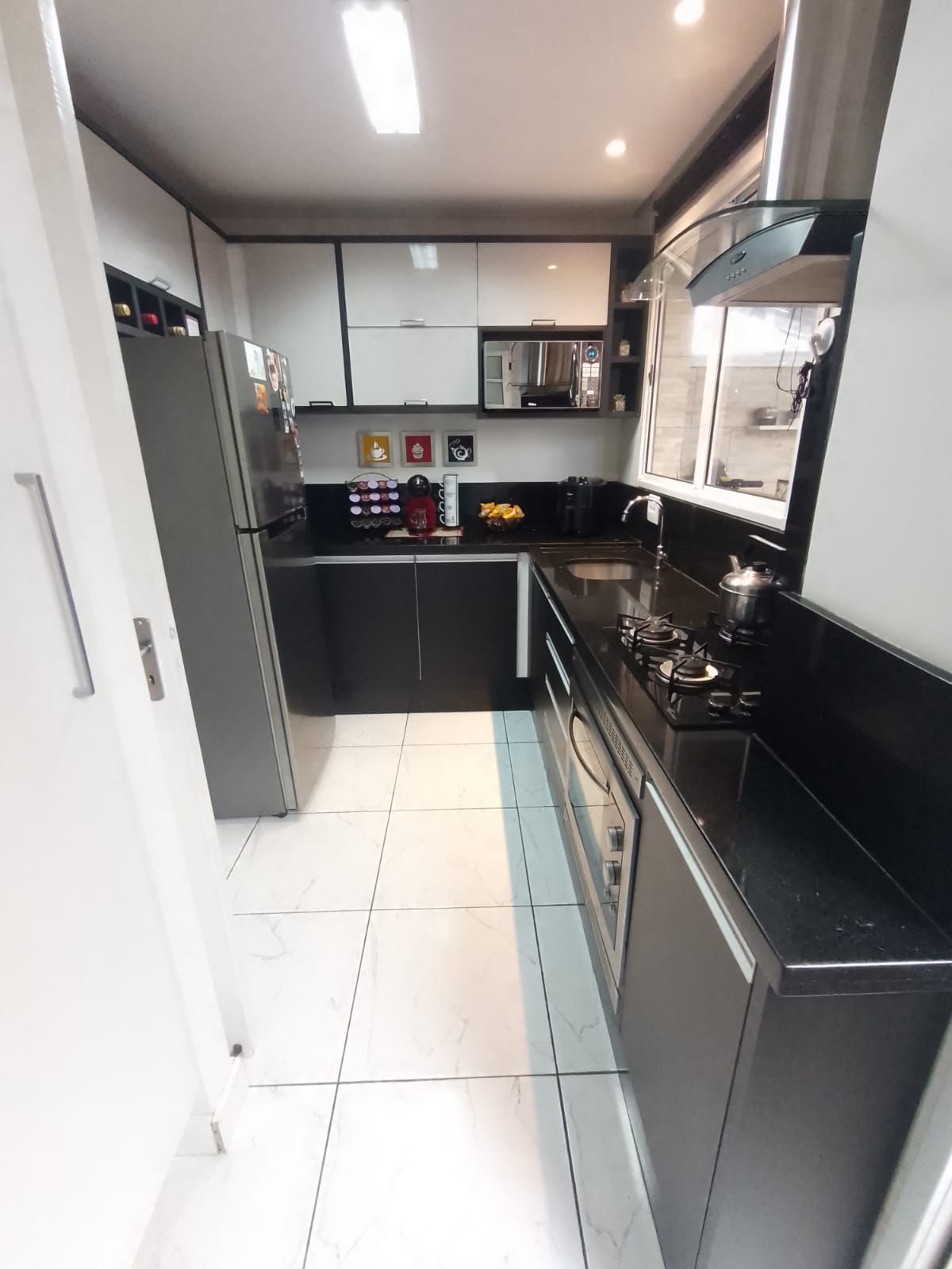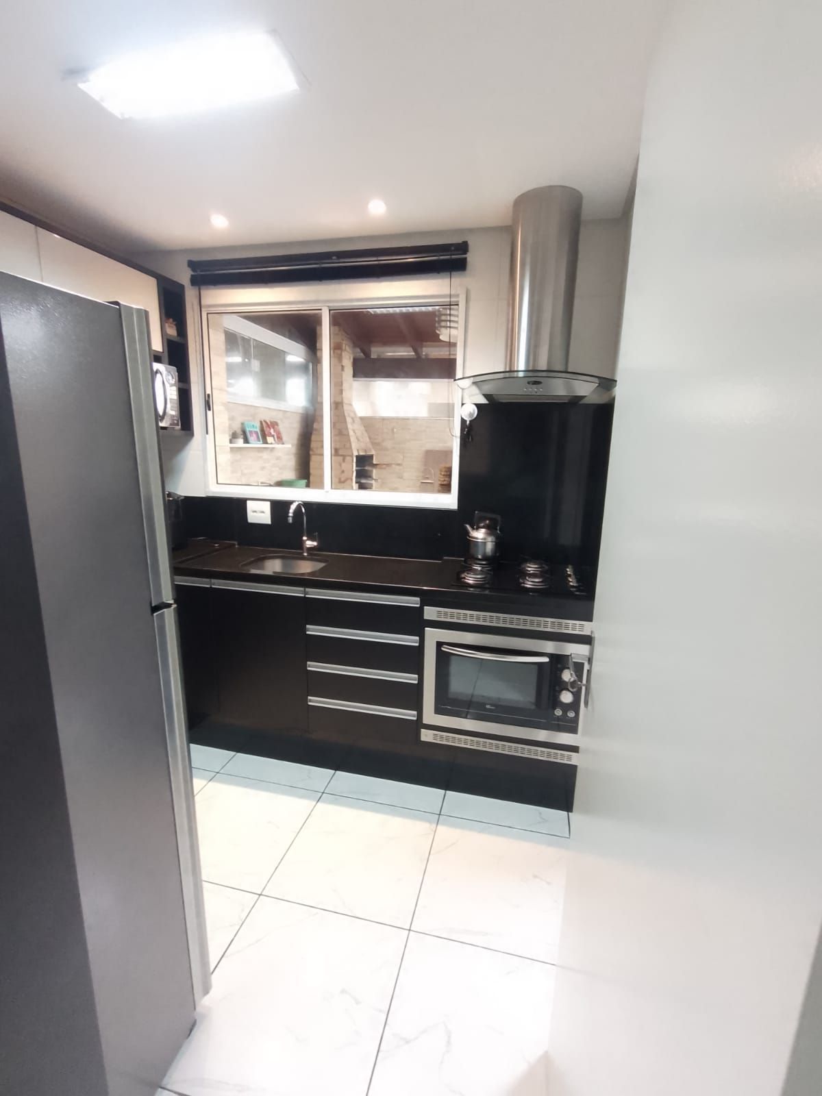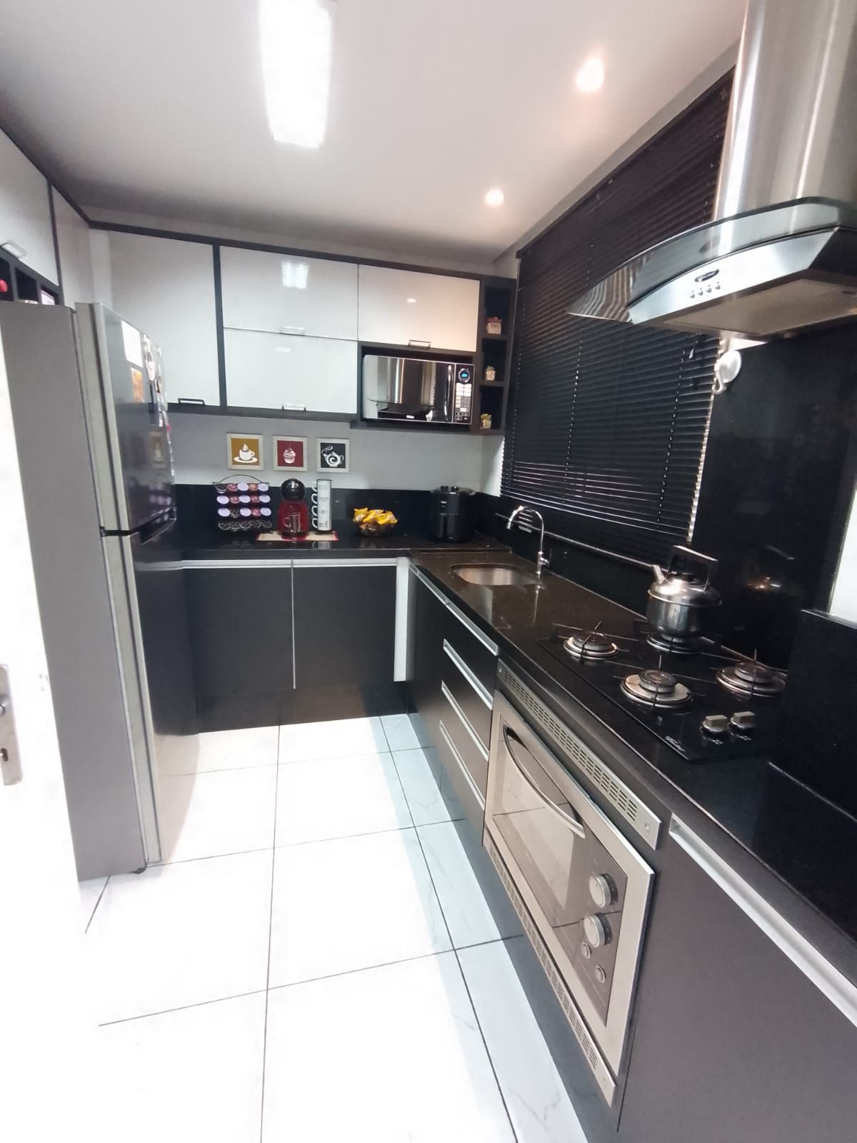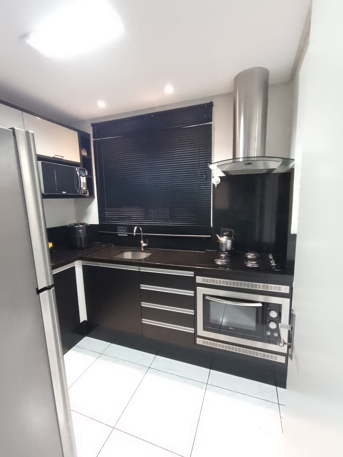 Móveis planejados sob medida, forno elétrico embutido, coifa, Cooktop e cortina persiana preta;