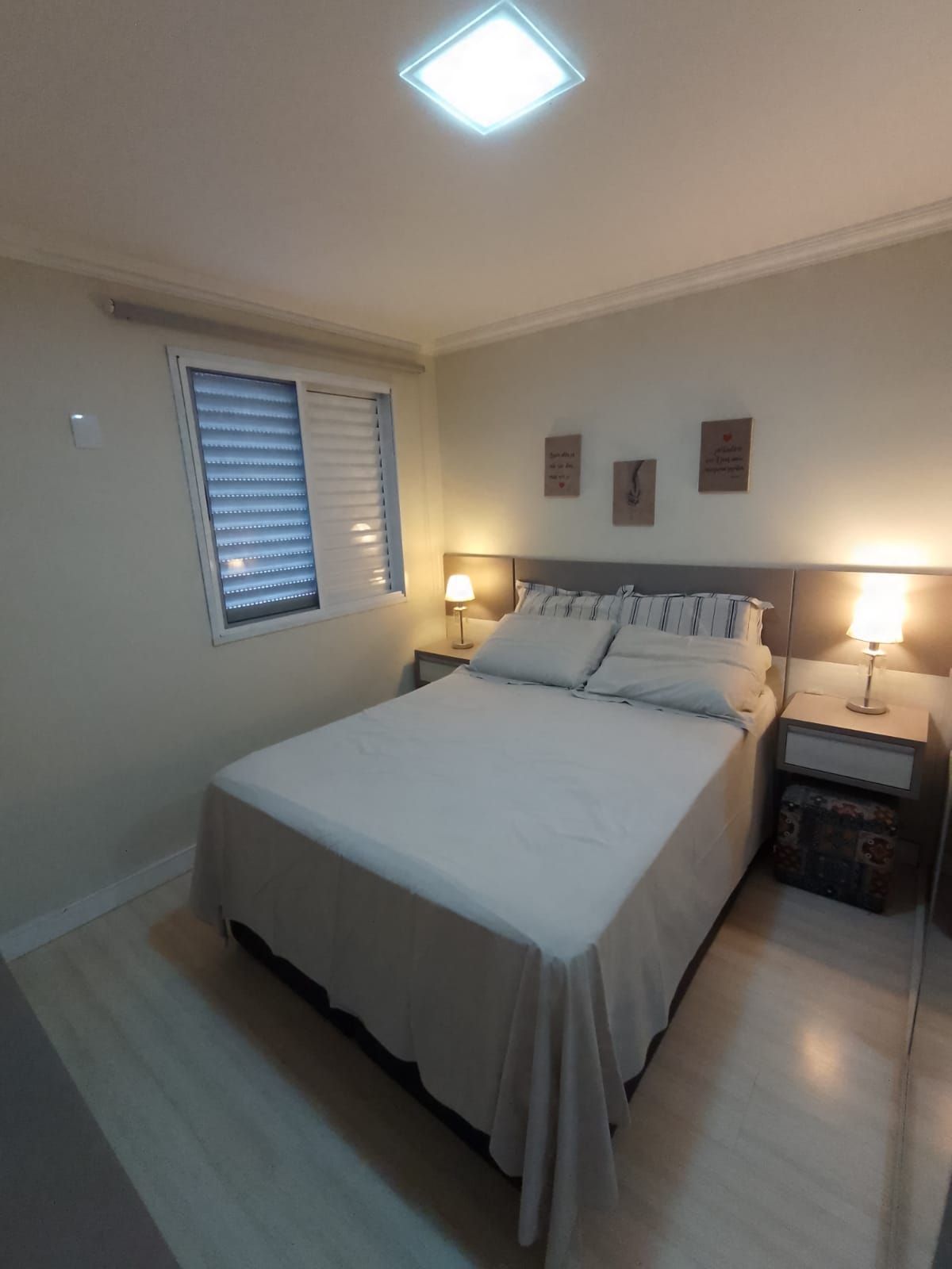 Roupeiro sob medida, sapateira sob medida, split 12.000 BTUs, dois criados mudos sob medida, cortina rolo blackout, dois abajures e base box baú casal bipartido;