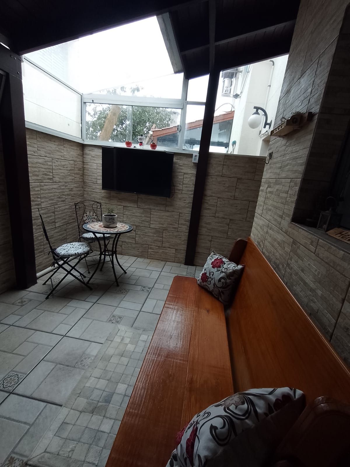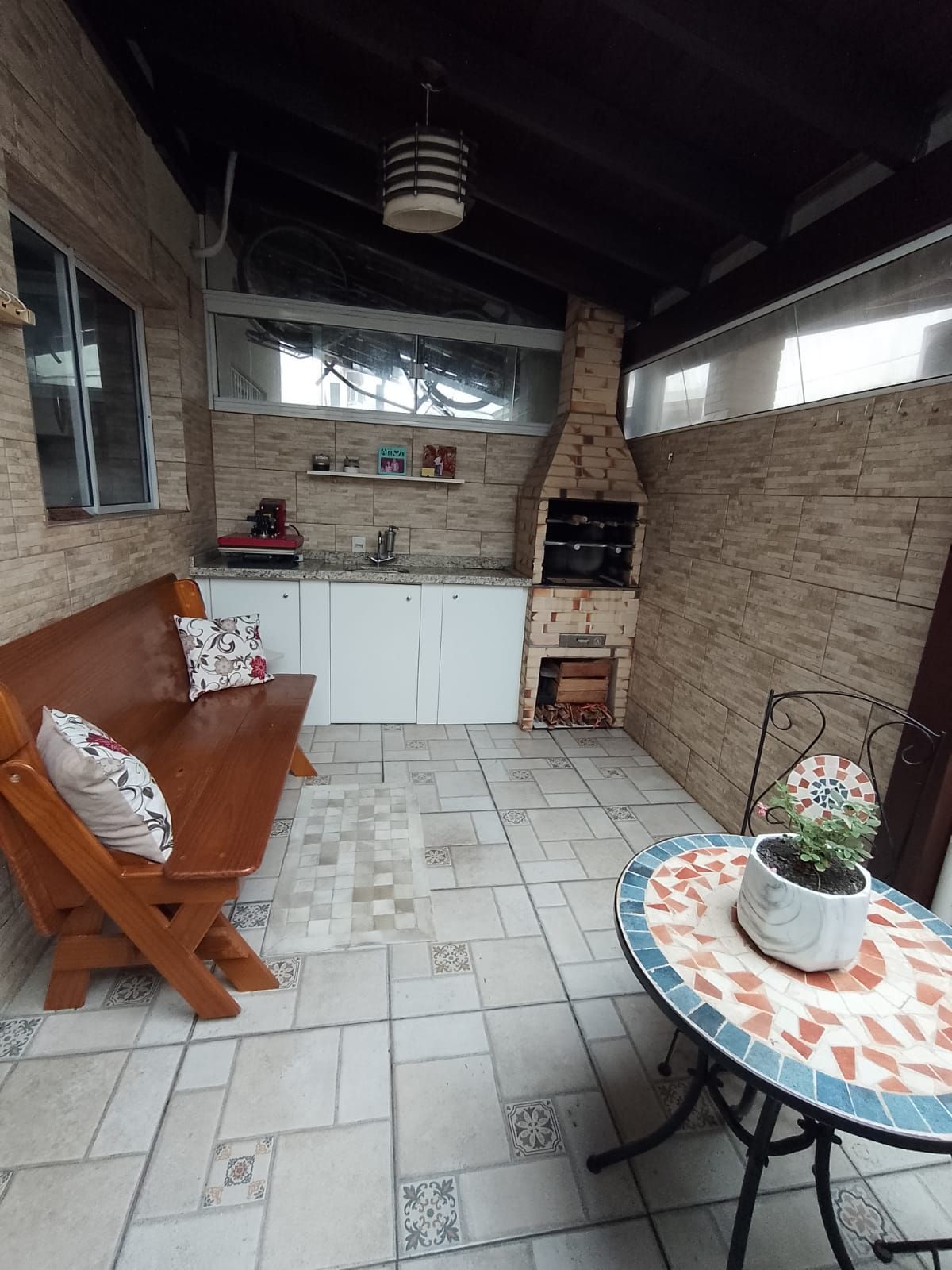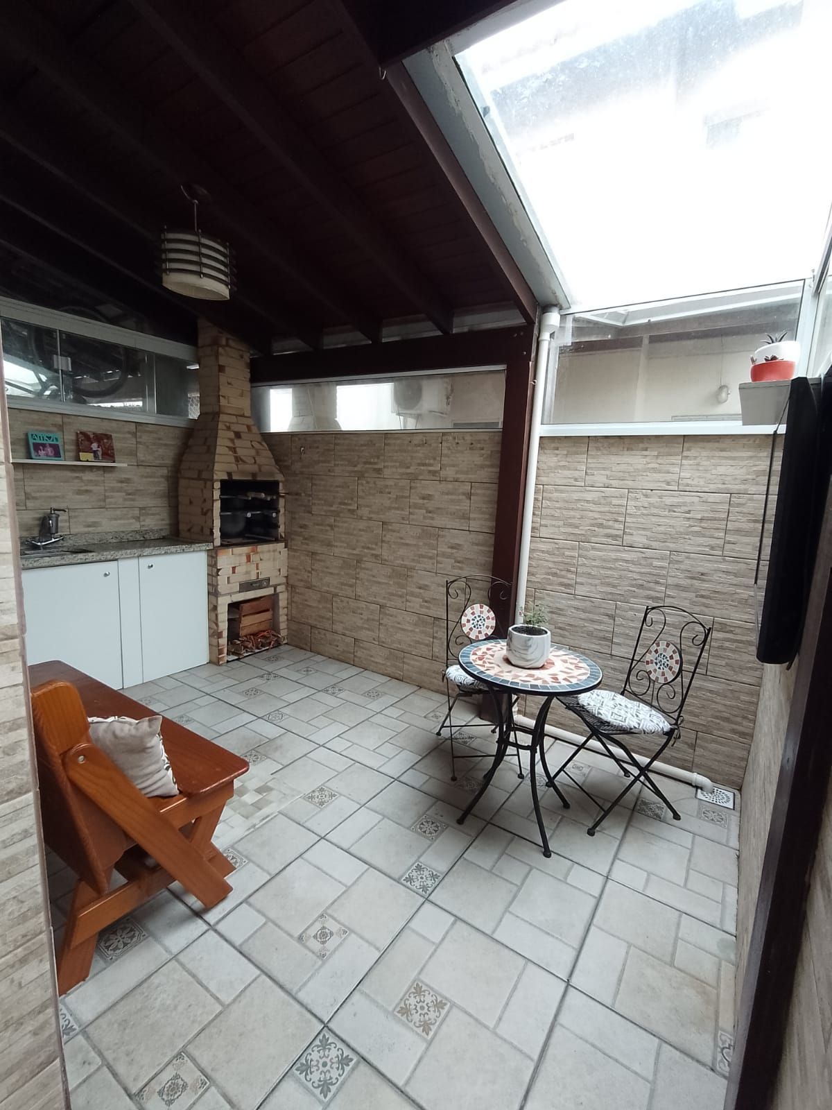 Mesa de ferro com duas cadeiras de ferro, lustre, nicho, churrasqueira, churrasqueira, televisão 42 polegadas marca LG e móvel planejado com pia de granito.