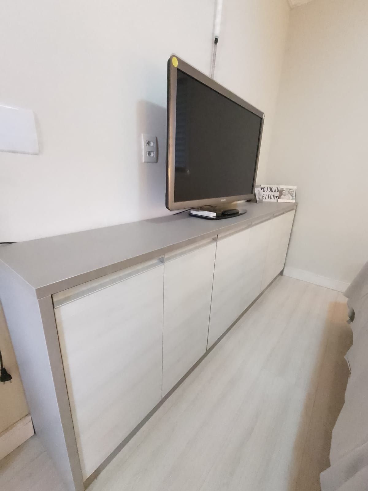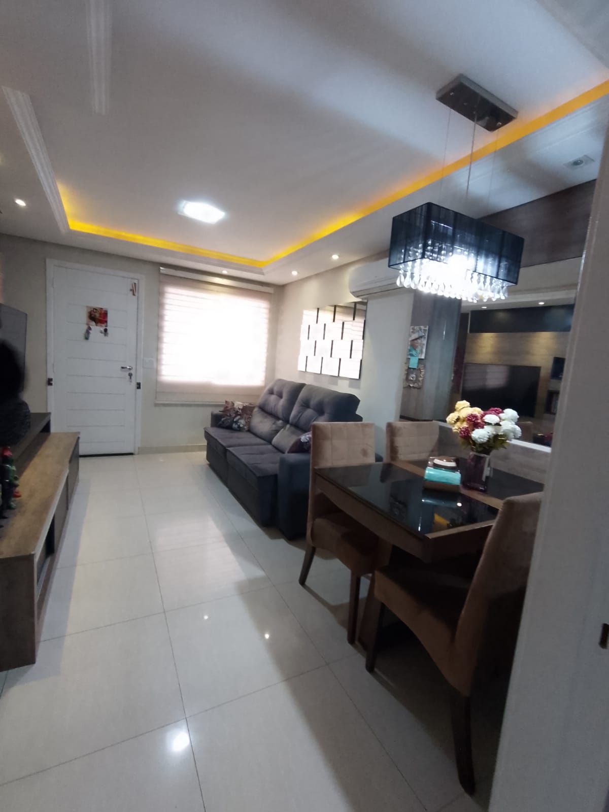 Móvel painel sob medida, mesa de jantar fixa sob medida, quatro cadeiras, lustre, sofá baú, split 9.000 BTUs e cortina rolo Double Vision;