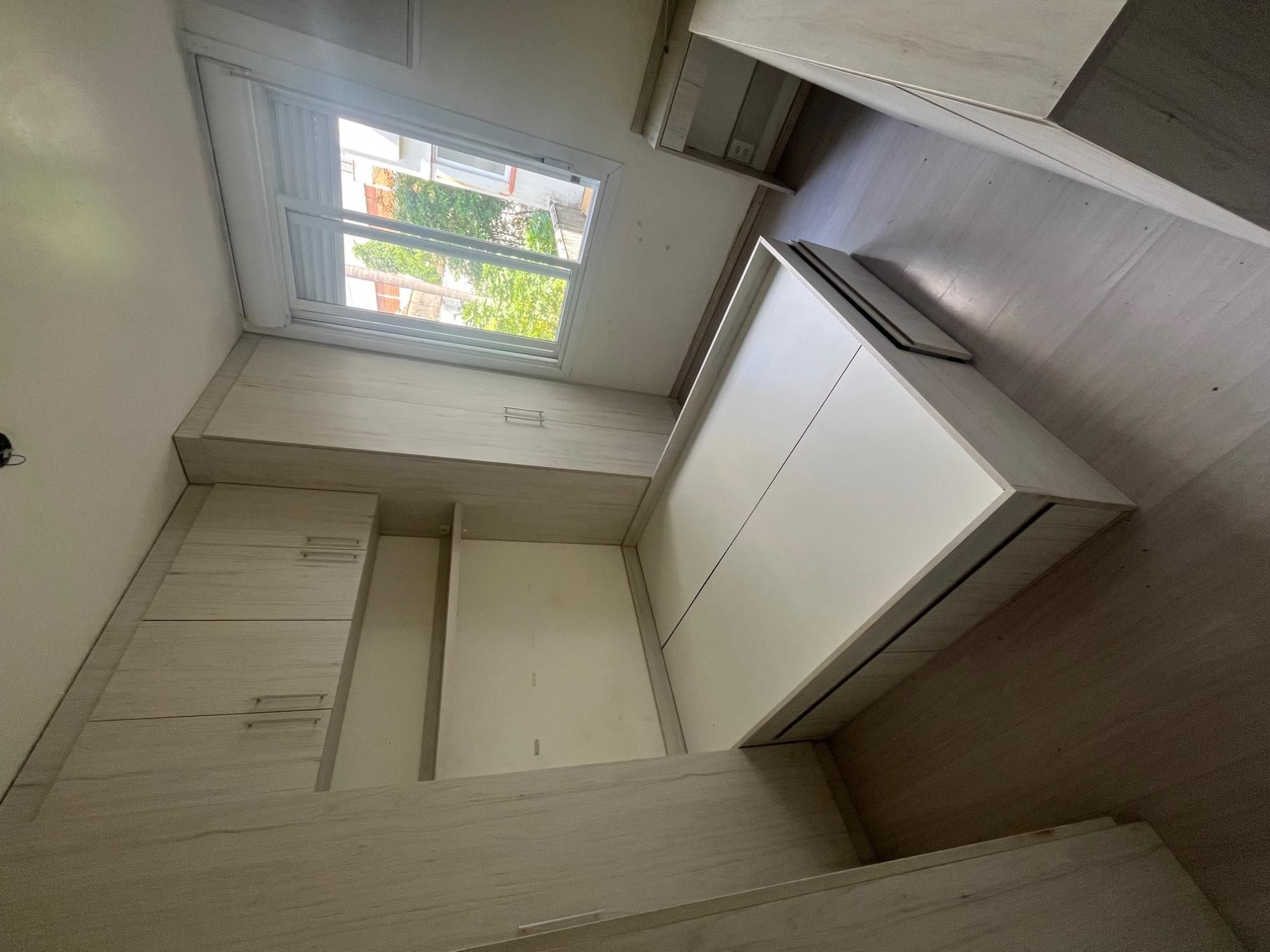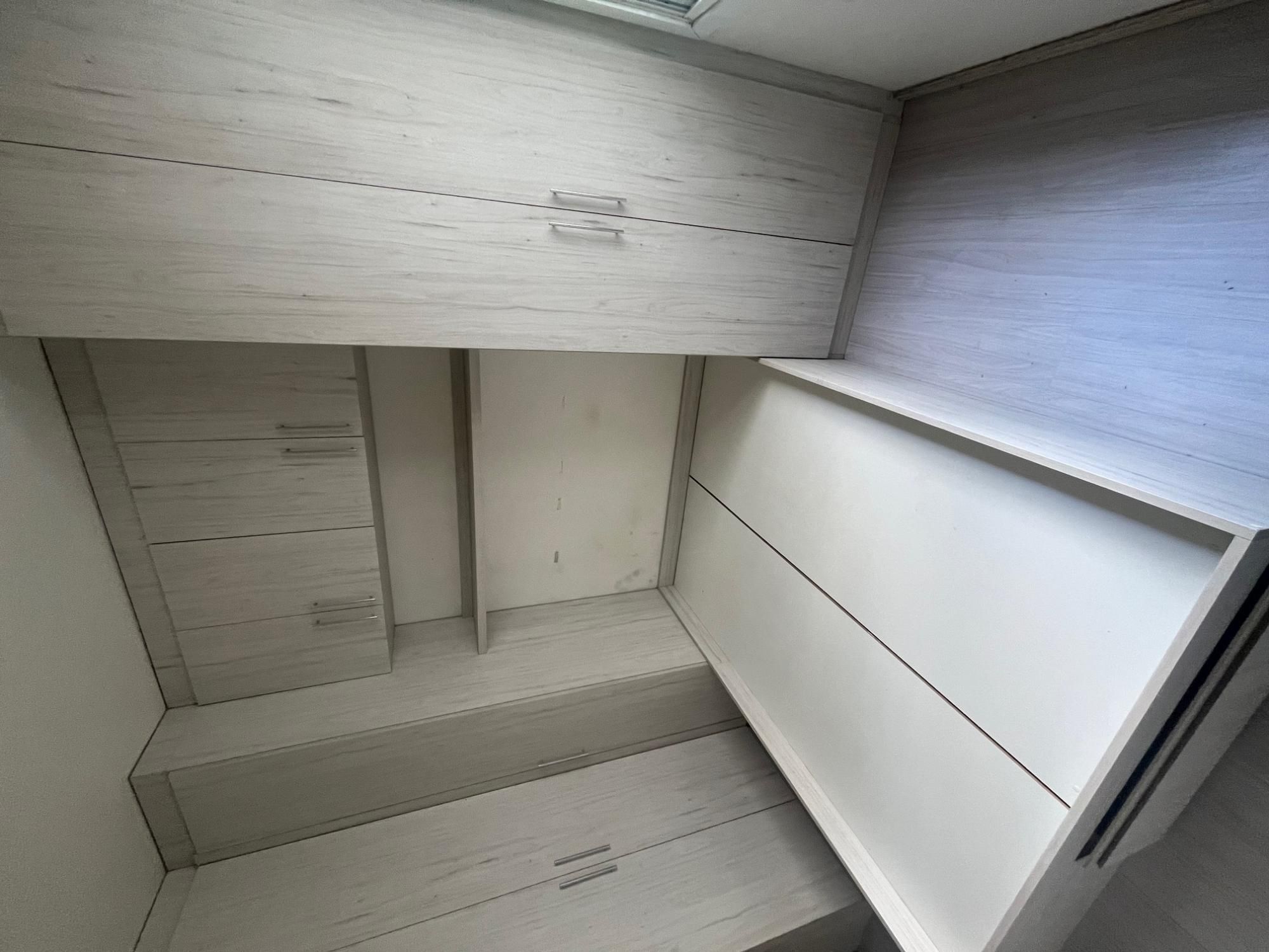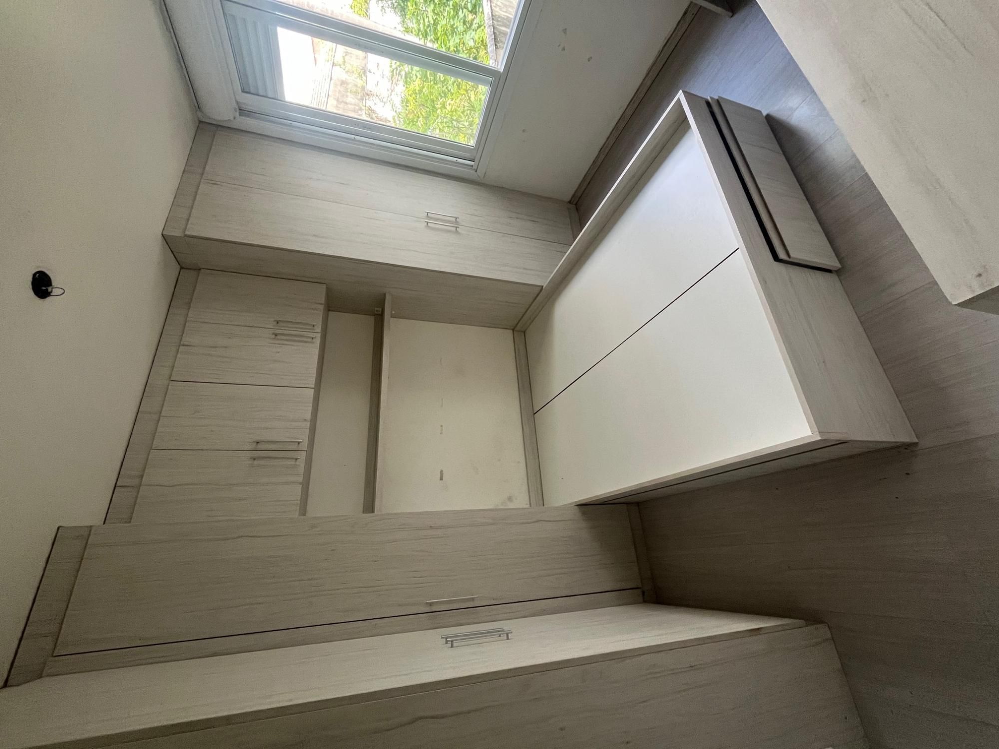 Ambiente dividido em dormitório com móveis sob medida (armários, cama e divisória)