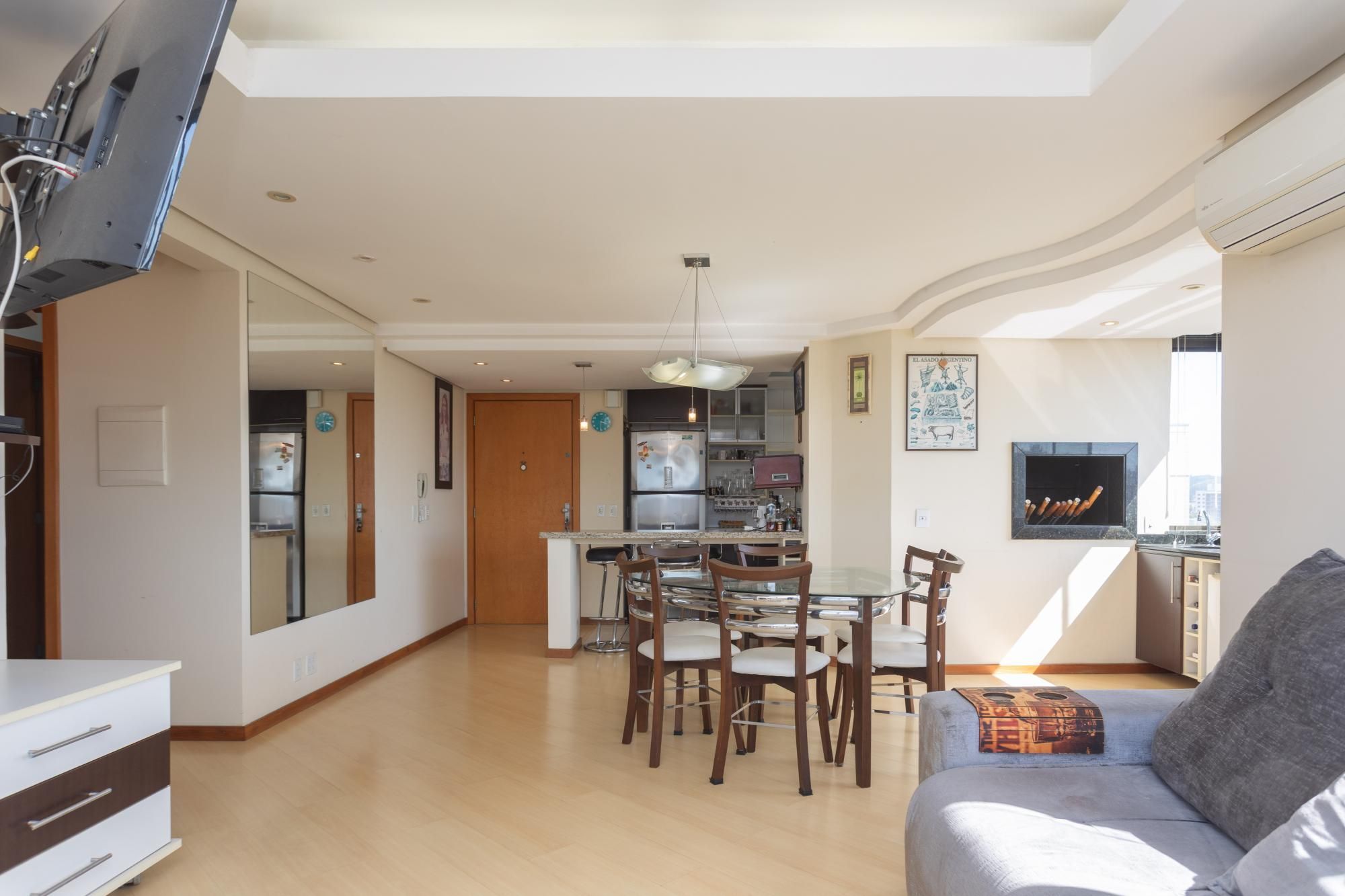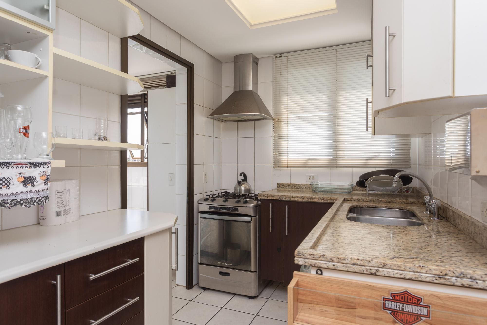 Dois dormitórios, sendo uma suíte, e um banheiro social, cozinha americana, sacada integrada ao living, pia na sacada, churrasqueira, lareira a lenha e três vagas de garagem, uma simples e outra dupla.