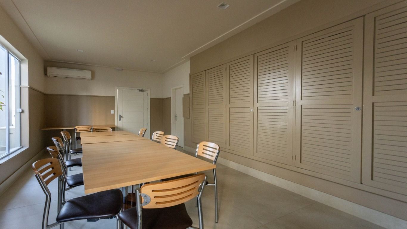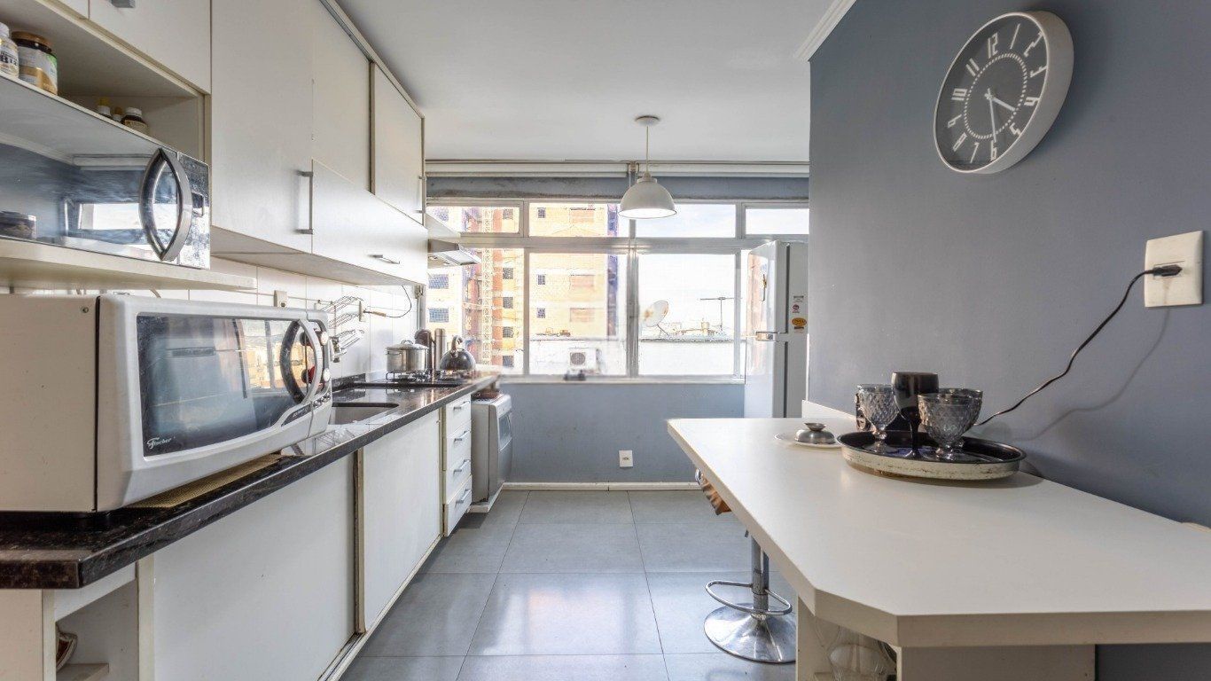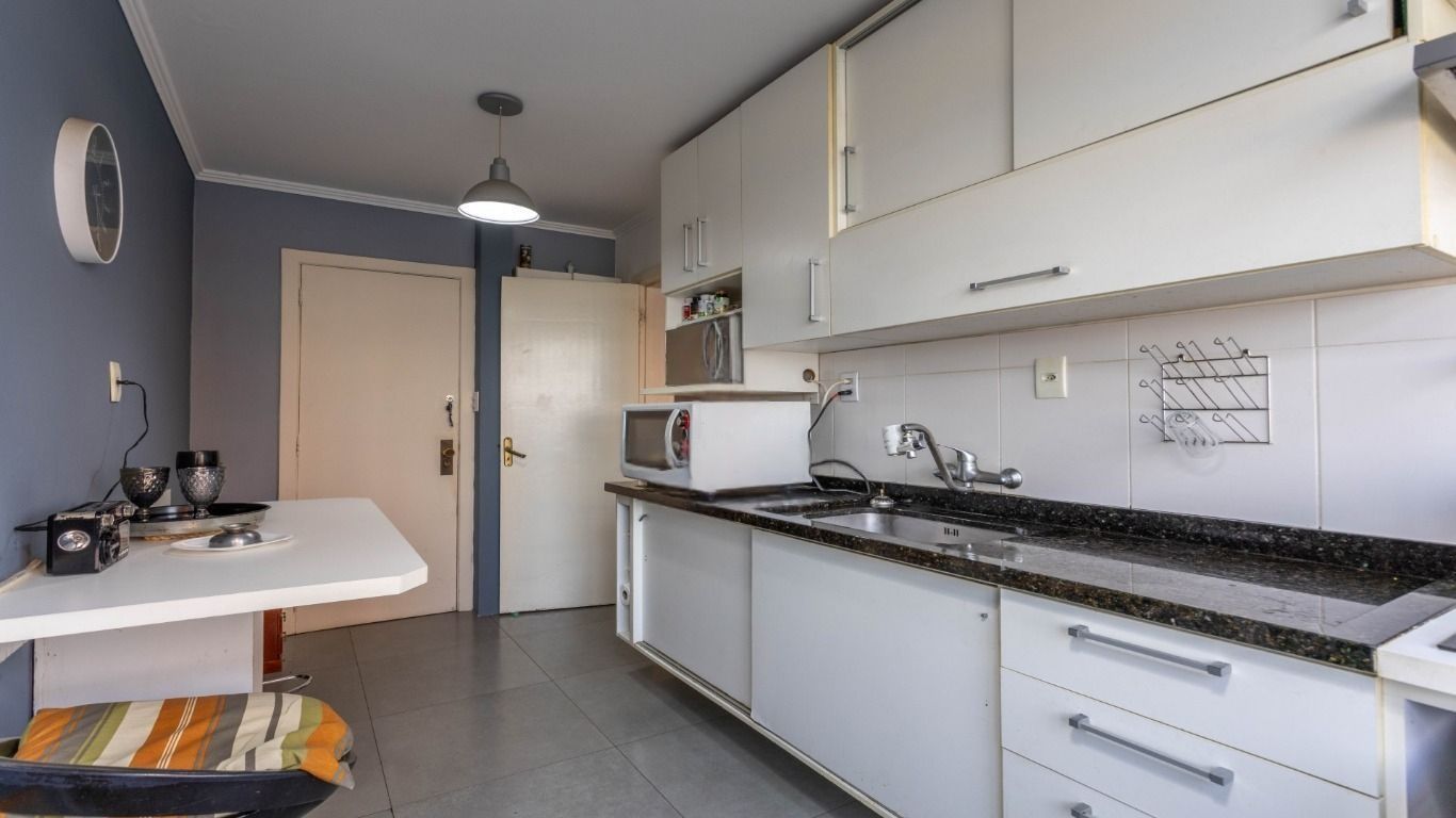 A cozinha é funcional e integrada à área de serviço, que inclui lavanderia e dependência completa de empregada, oferecendo praticidade no dia a dia.