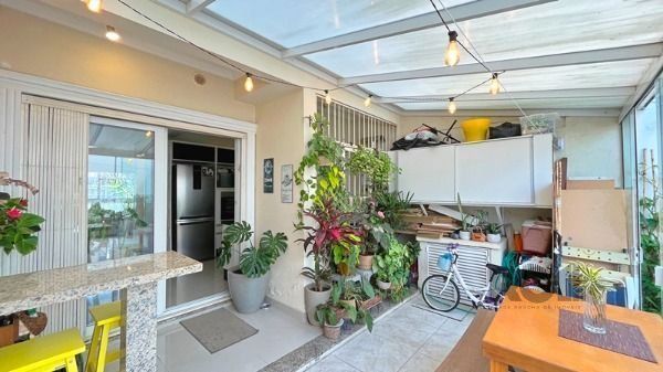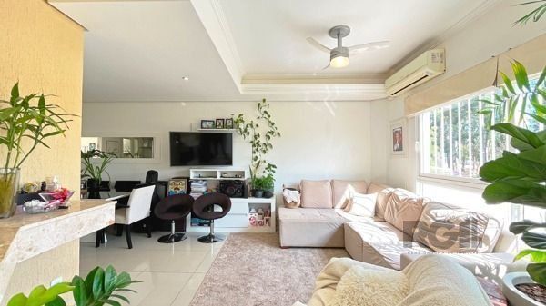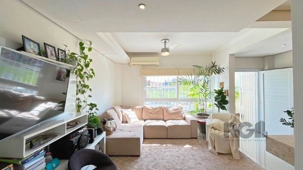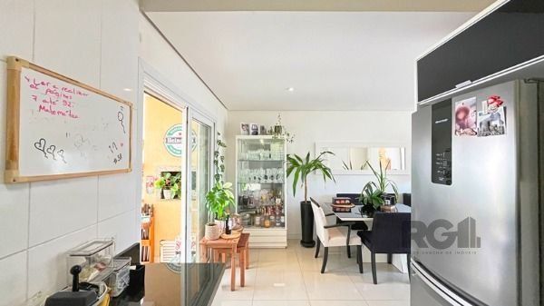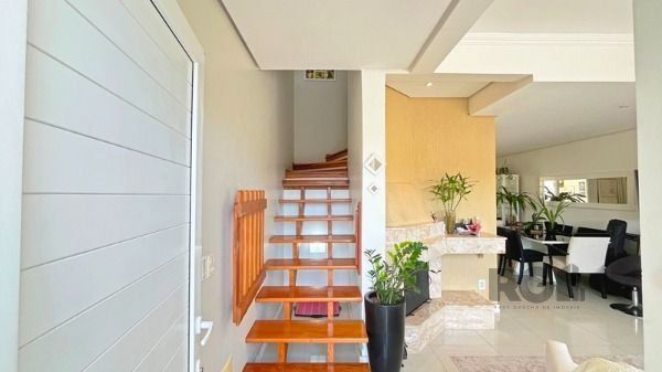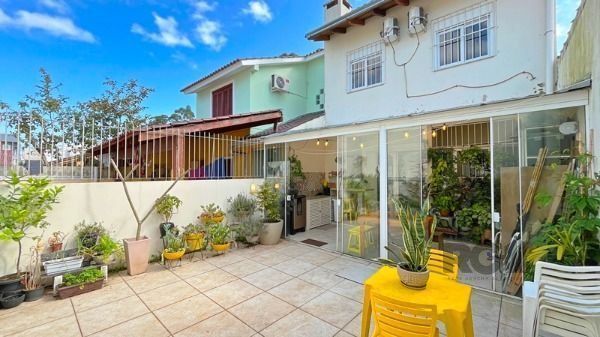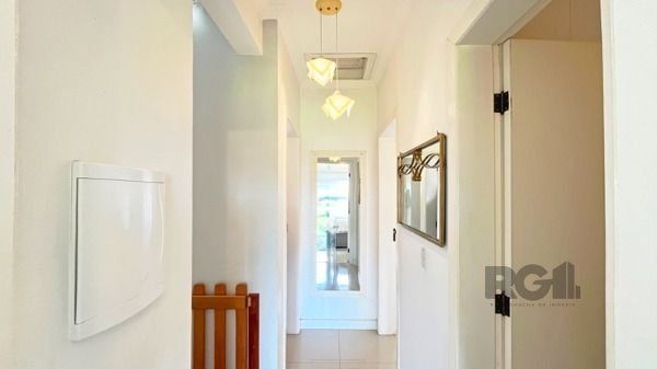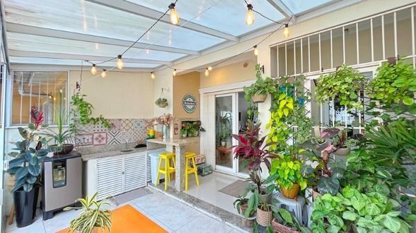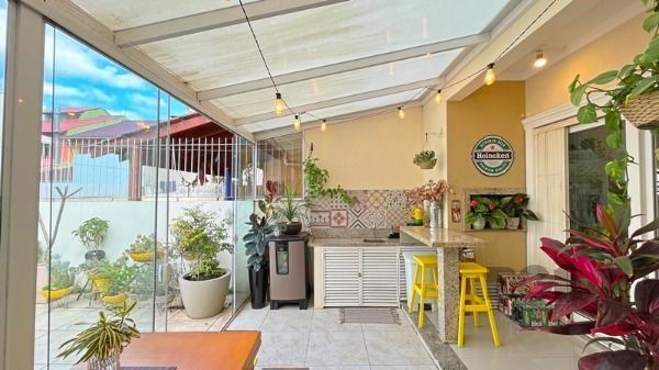 Sala 2 ambientes com lareira, cozinha com móveis planejados, lavabo, banheiro social, espera para junker, e uma linda área gourmet com churrasqueira, fechada com portas de vidro e coberta com policarbonato.