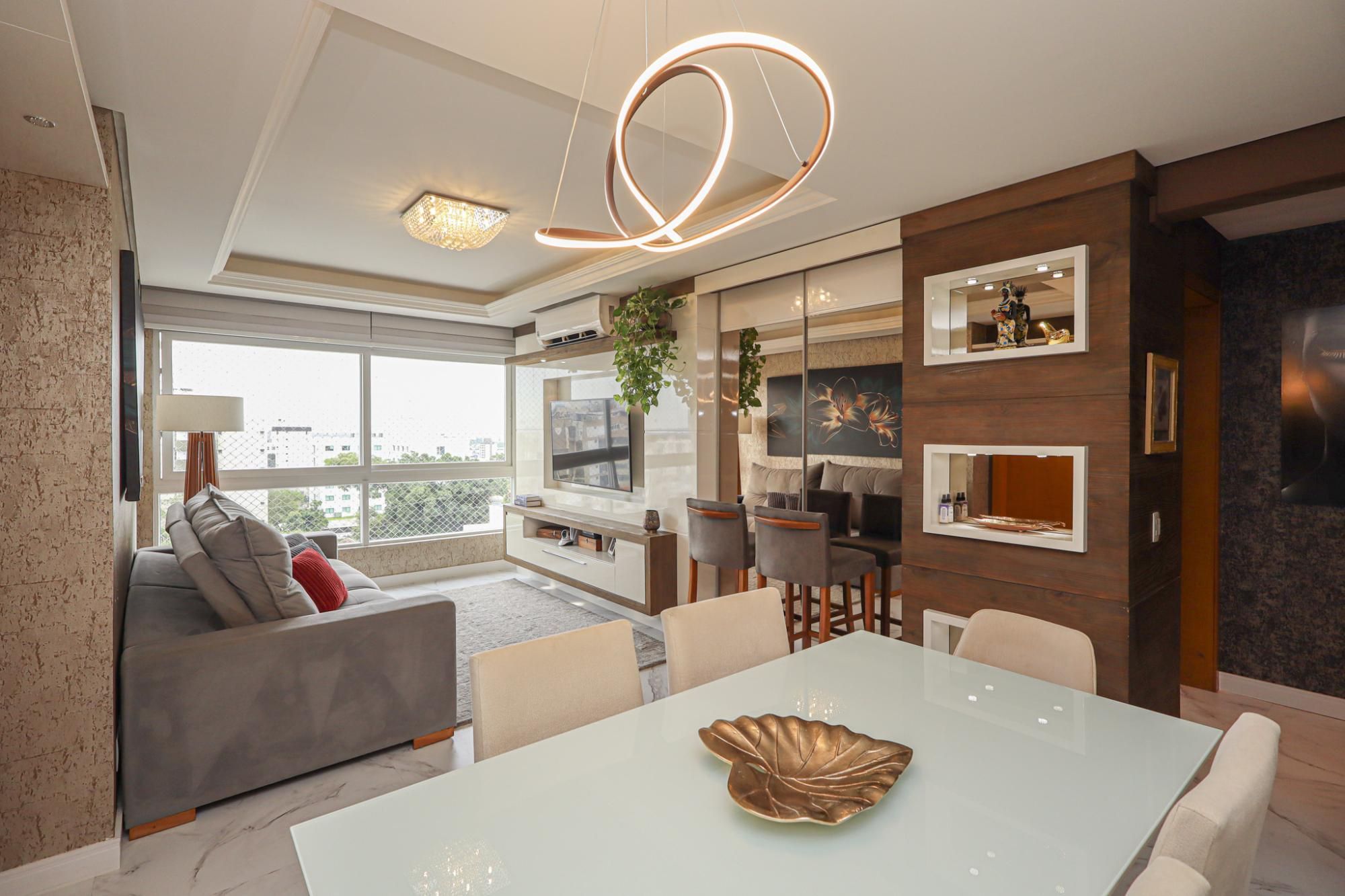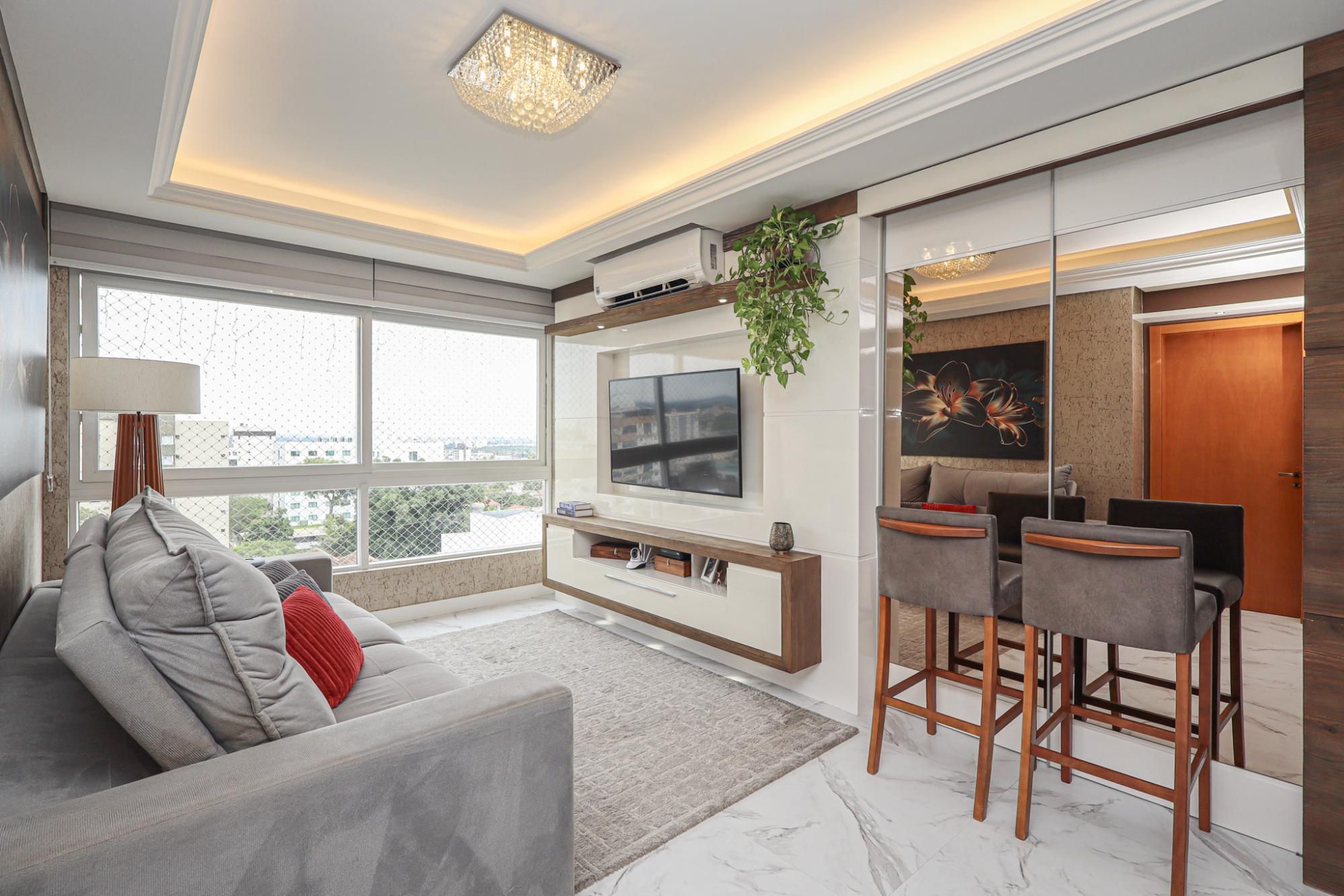 Apartamento em andar alto semimobiliado com 83 m² de área privativa com 2 dormitórios sendo 1 suíte, banheiro social, living amplo para 2 ambientes, cozinha copa montada com churrasqueira e área de serviço individual. Possui 2 vagas de garagem cobertas e escrituradas.