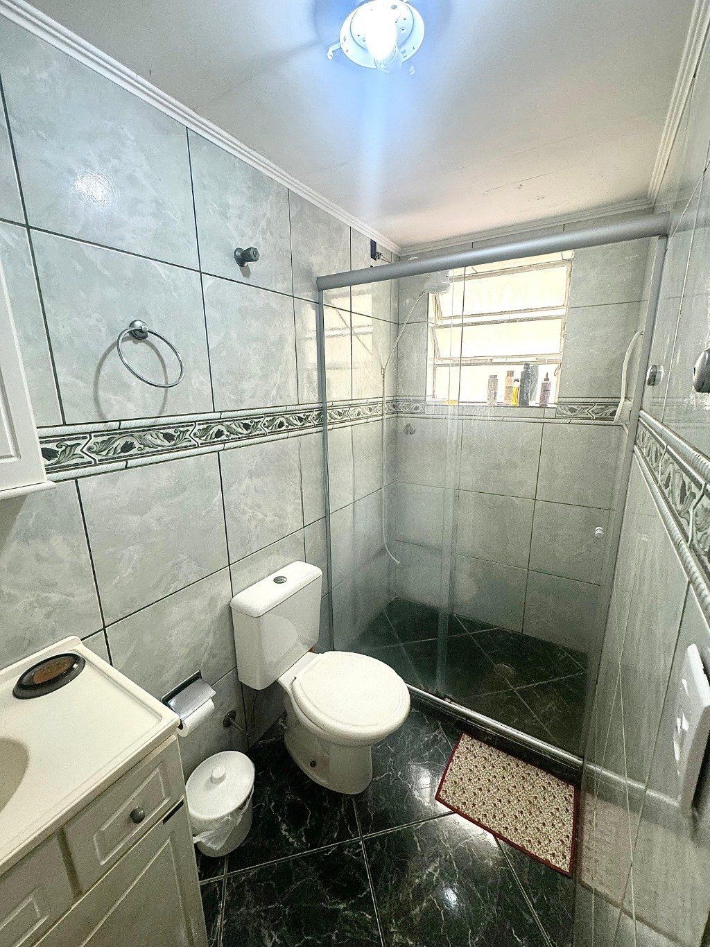 O banheiro auxiliar é totalmente revestido em cerâmica, equipado com box de vidro, armários planejados e janela com abertura para o exterior.