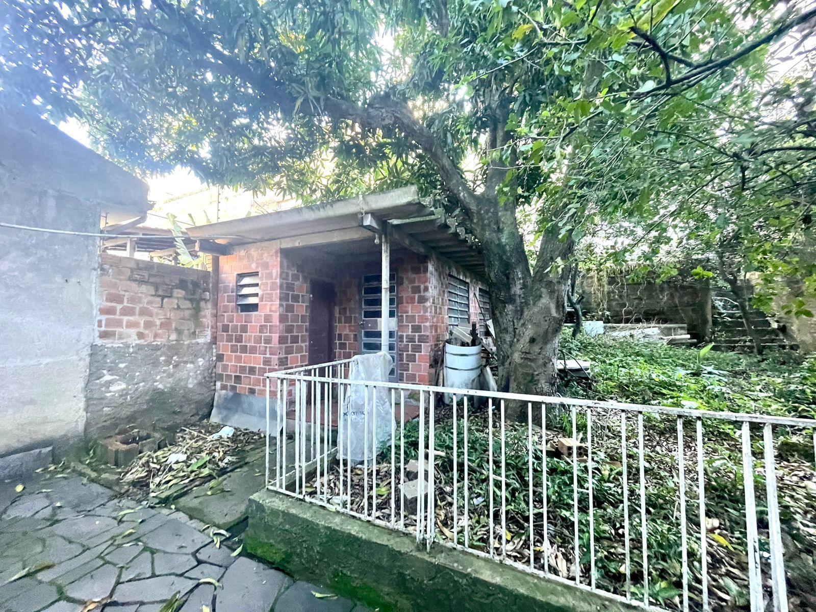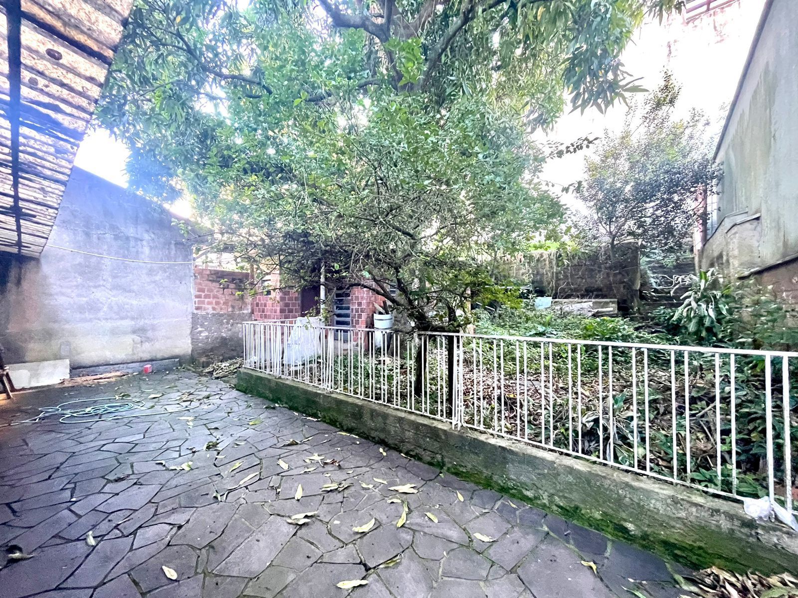 Um pátio grande com uma casa separada edícula, com coxinha e churrasqueira. Pátio grande com área verde a árvores.