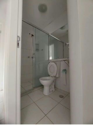 1 banheiro totalmente revestido em cerâmica, com box de vidro, armários planejados, ambiente arejado e bem iluminado.