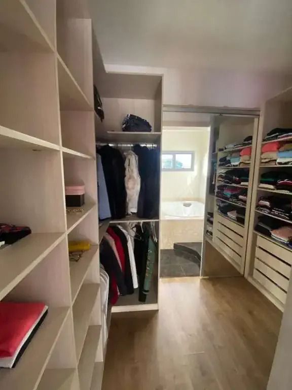 - Closet amplo com duas portas para dividir o ambiente (quarto/ closet/ banheiro), três áreas para cabides, espaço para calçados, gavetas e prateleiras amplas;