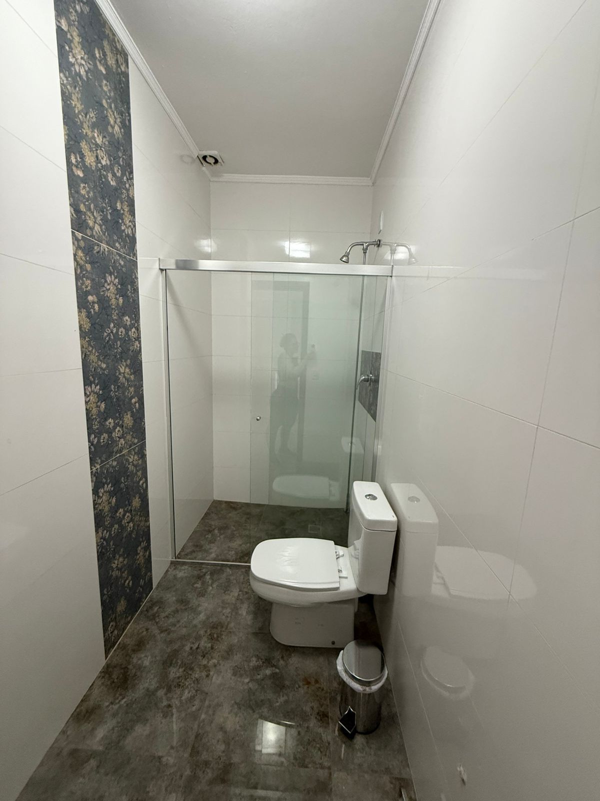 - 1 banheiro social com água quente a gás, sem mobília, apenas vaso sanitário e chuveiro;