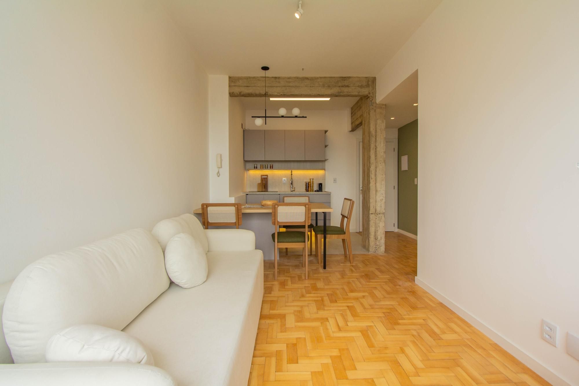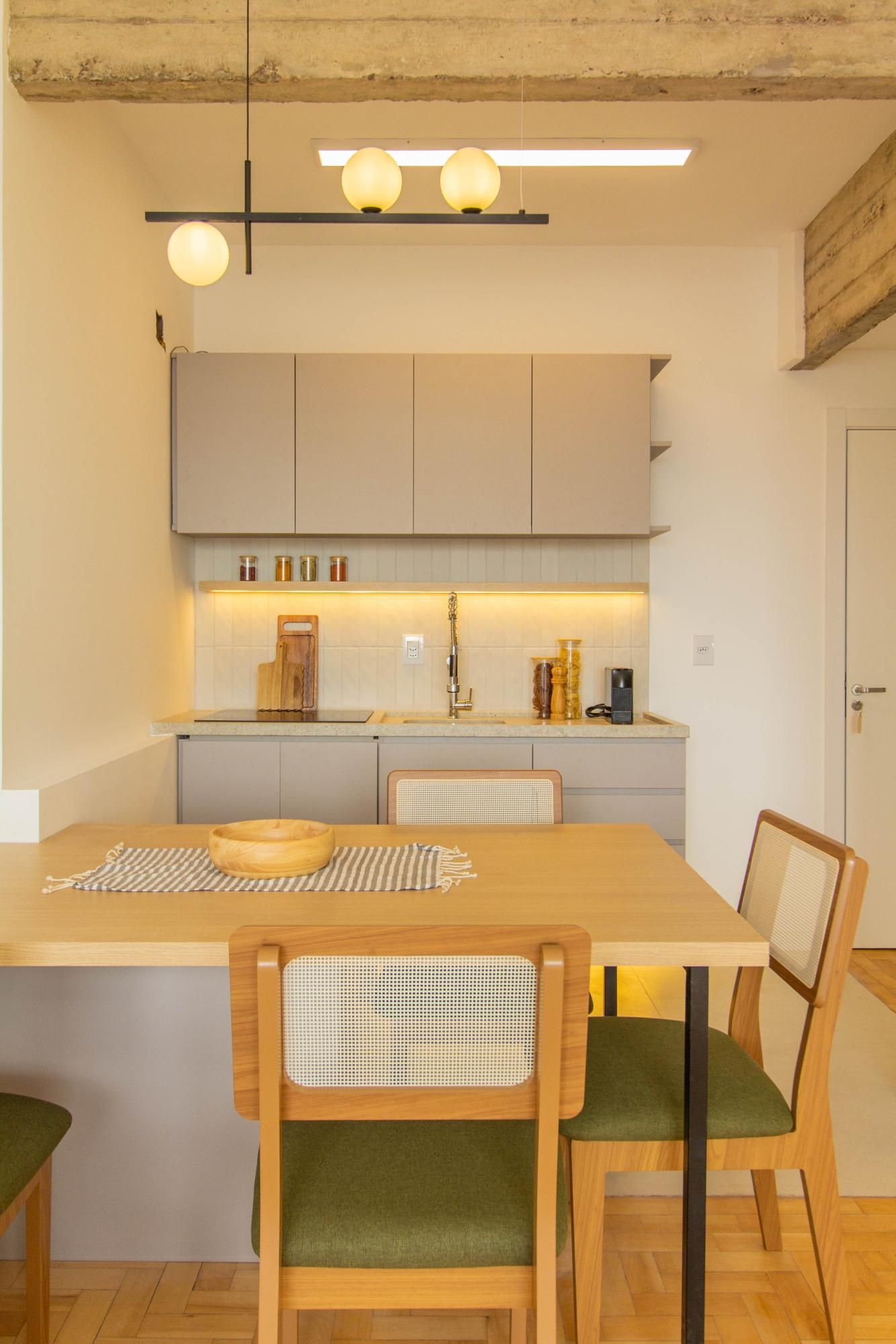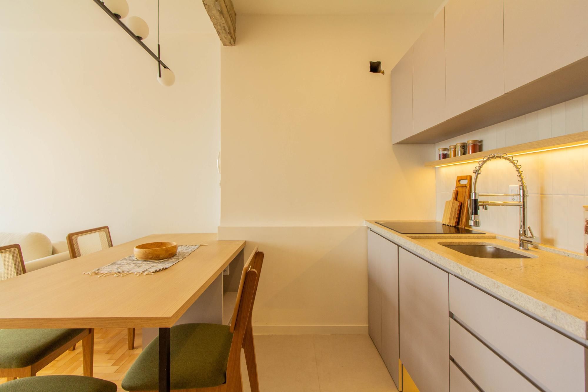 A sala, com piso em parquet, já conta com sofá e poltrona, enquanto a cozinha dispõe de mesa com cadeiras, criando um espaço pronto para viver e receber.