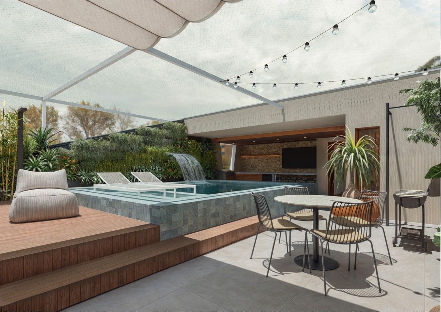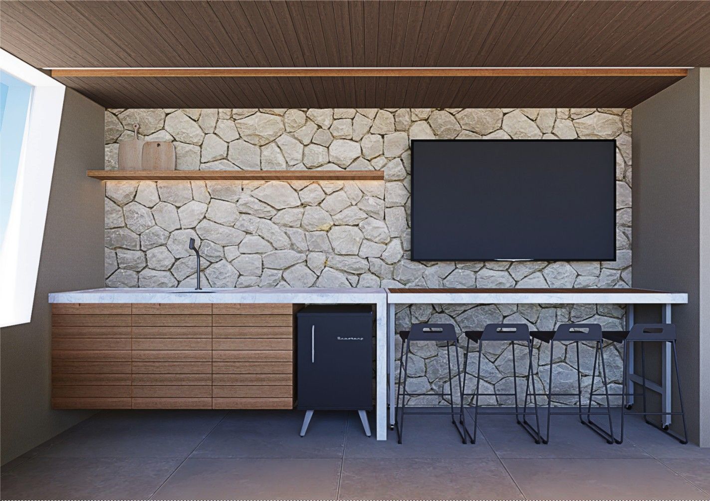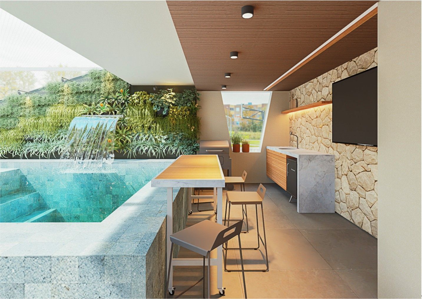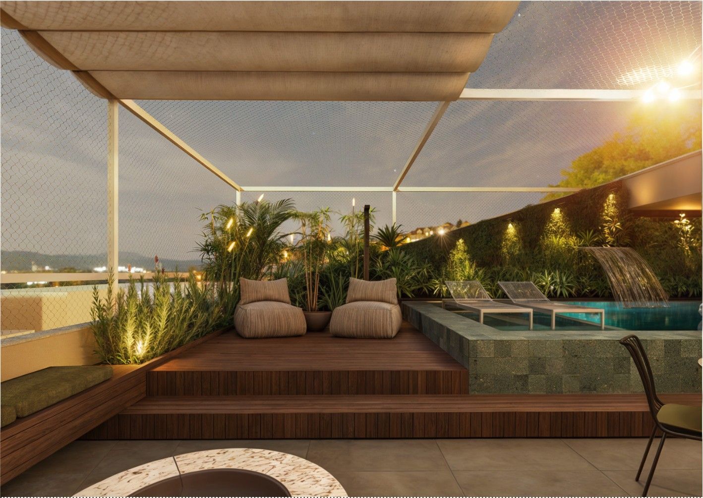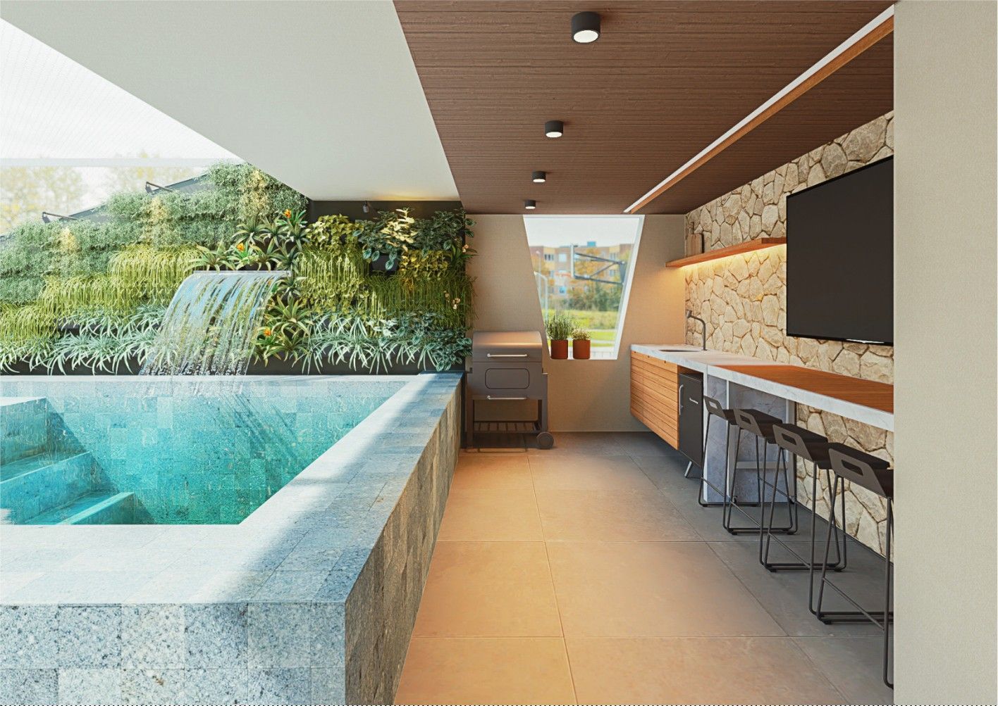 Área superior conta com piscina, churrasqueira e um amplo espaço para confraternização.