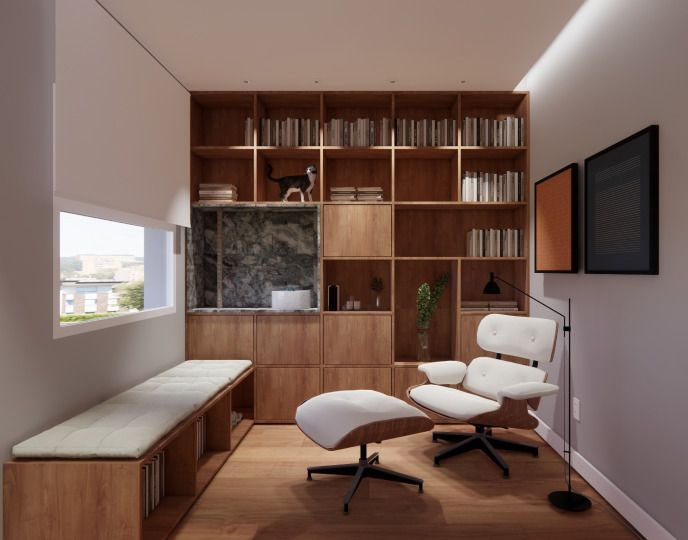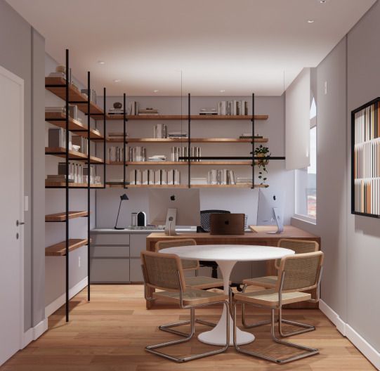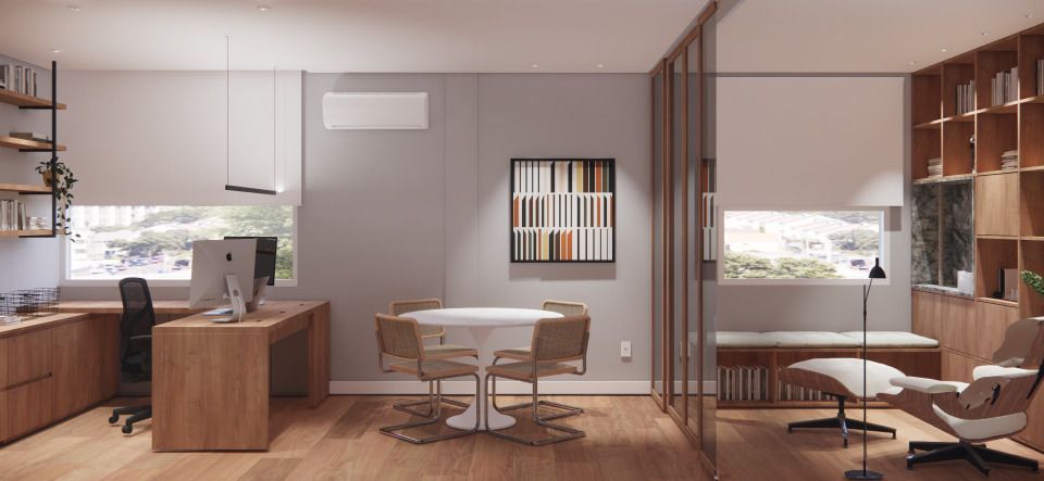 Tem 1 cozinha intima, 2 escritórios, 1 academia e dependência completa.