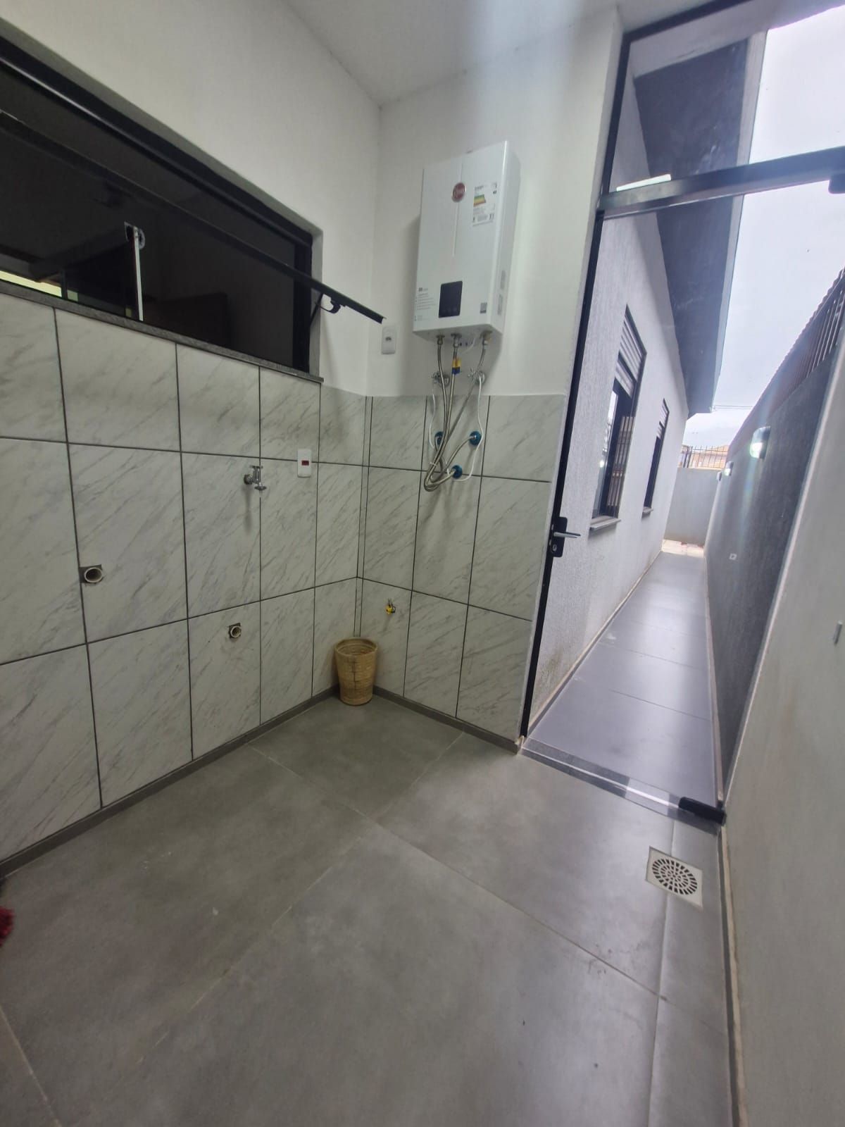 Amplo Living com lareira, cozinha,churrasqueira, uma suíte, pátio, vaga para dois carros.