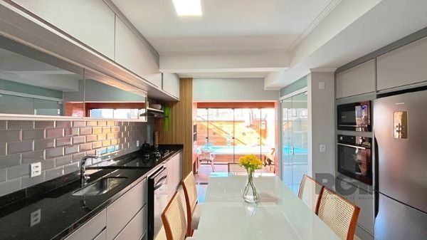 No andar térreo , 2 vagas de garagem , amplo living com dois ambientes , cozinha americana com móveis planejados, lavabo , espaço gourmet com churrasqueira , fogão a lenha , pátio com piscina.