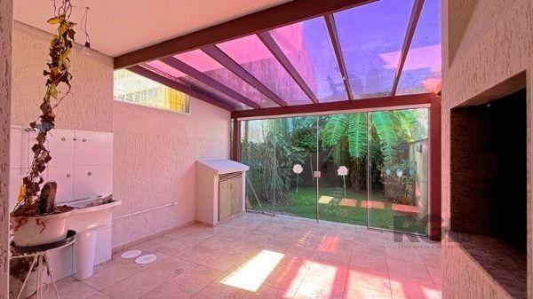 Living com lareira, lavabo e cozinha com móveis sob medida integrada à área de churrasqueira com teto em vidro temperado transparente, para dar maior luminosidade ao ambiente.