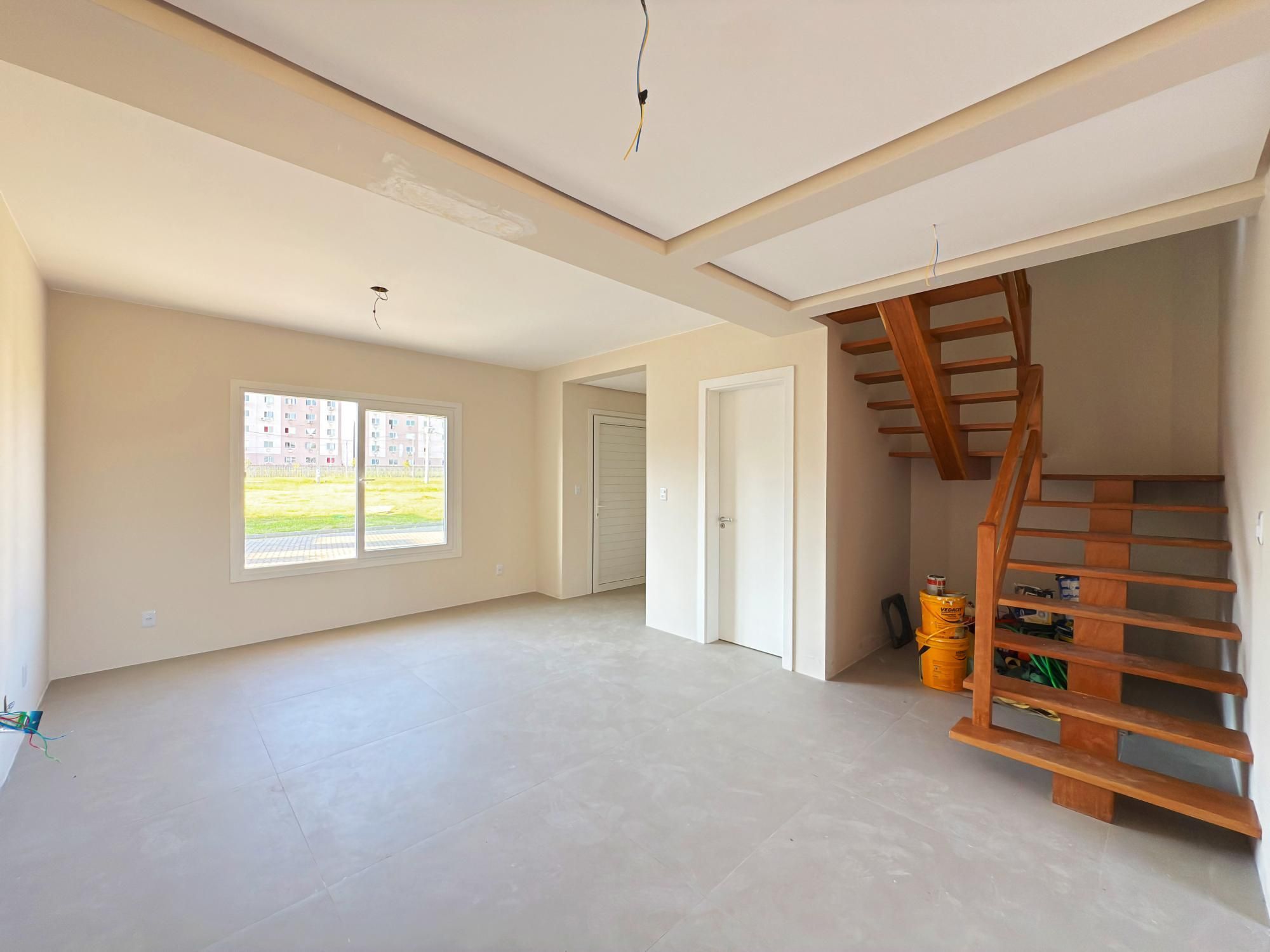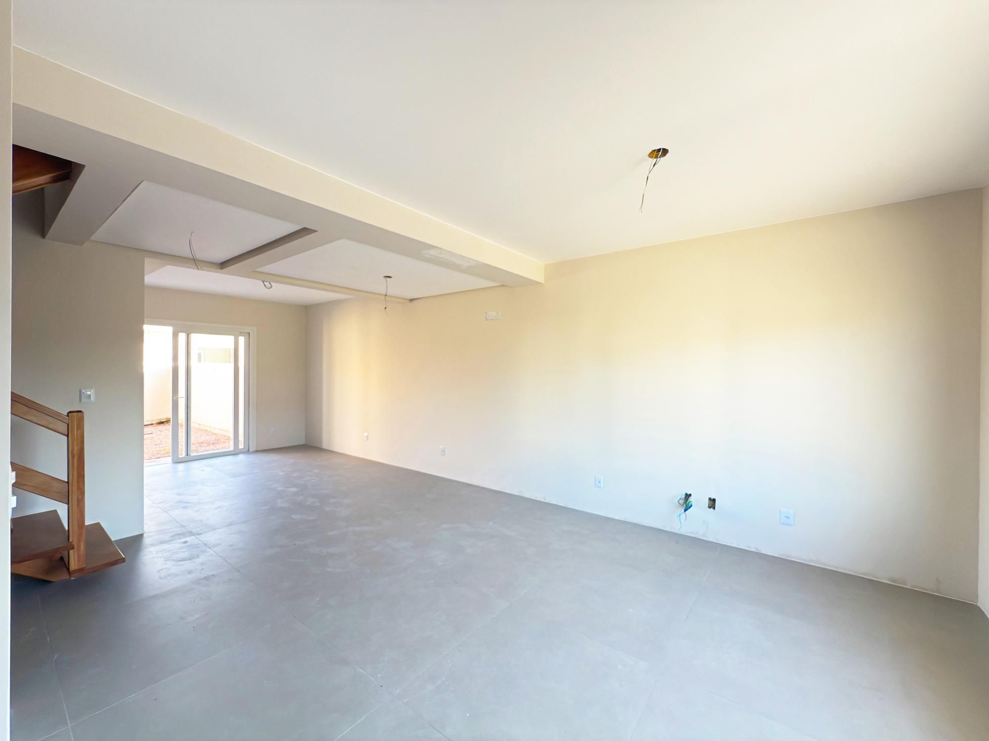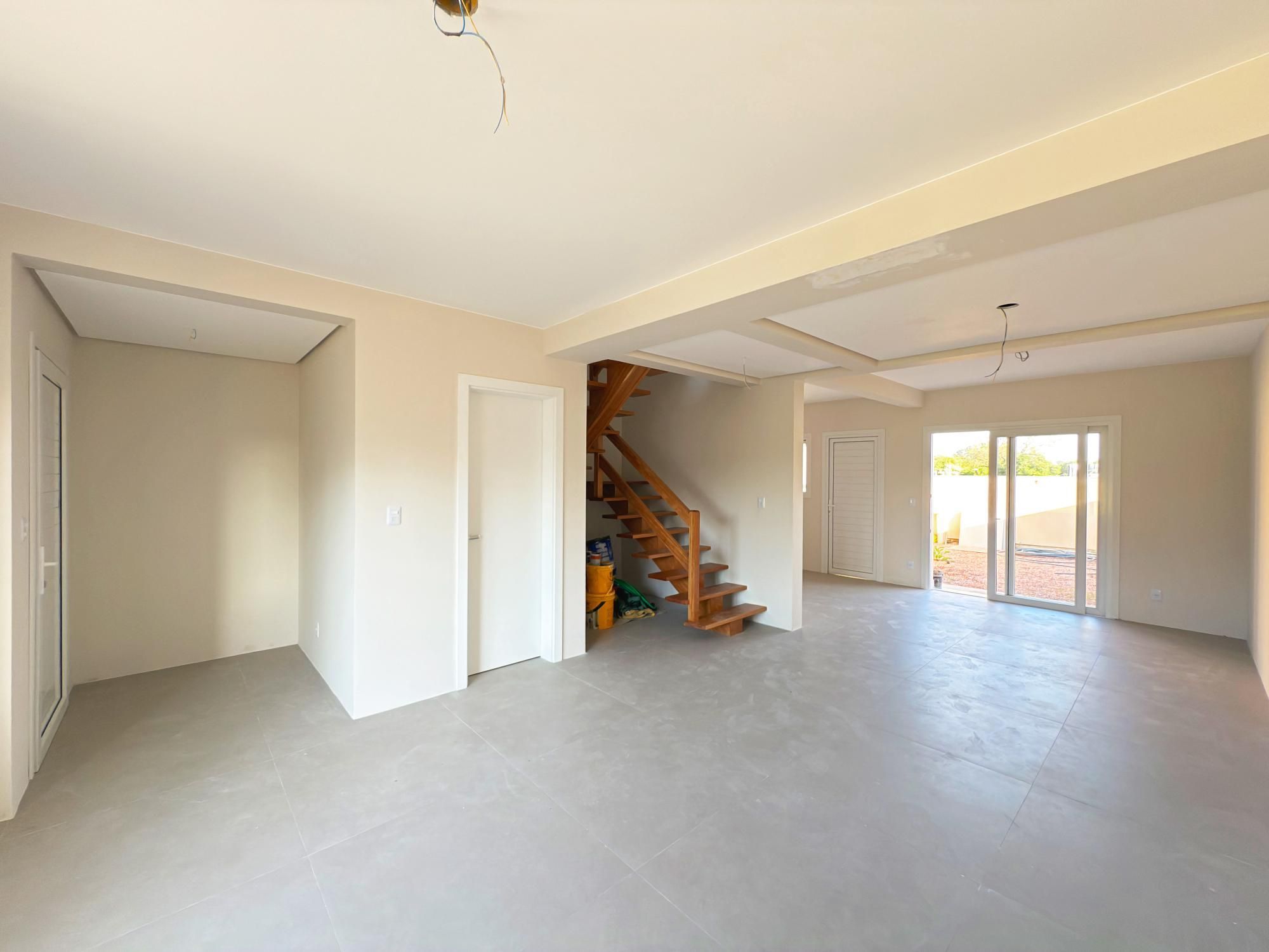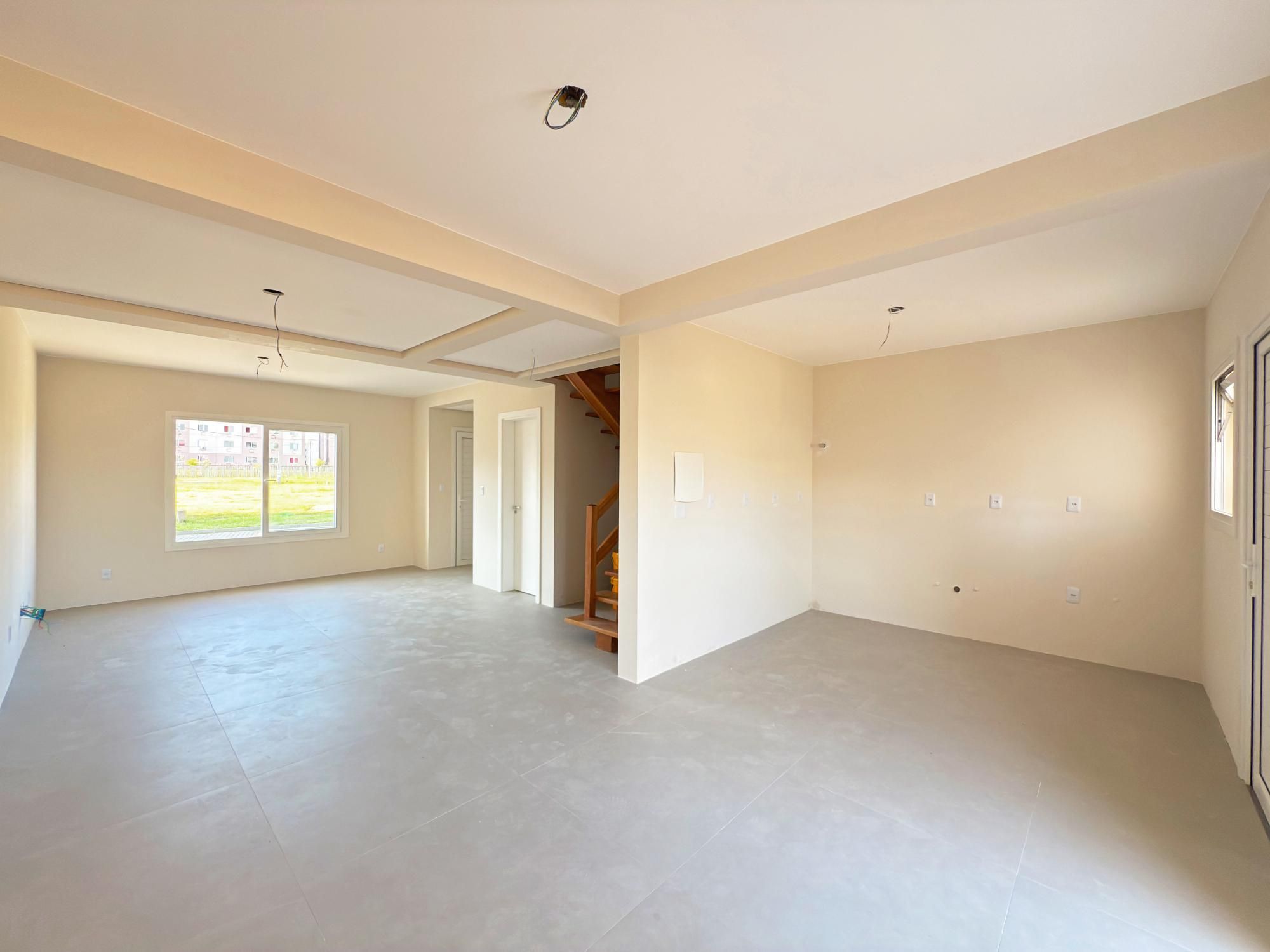 living amplo com pé direito duplo, lareira, com uma suíte, banheiro social, área de serviço, churrasqueira, duas vagas, porcelanato nos banheiros e living, laminado nos dormitórios, com pátio.