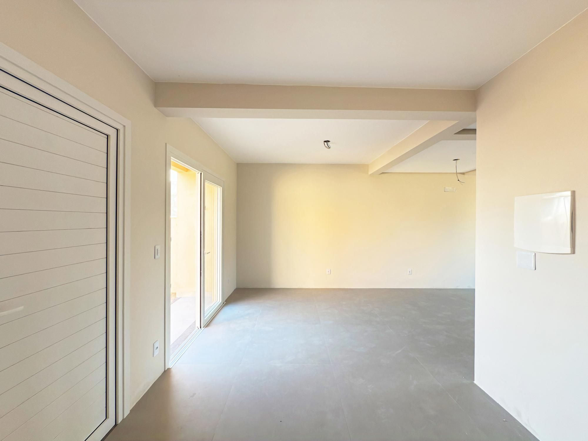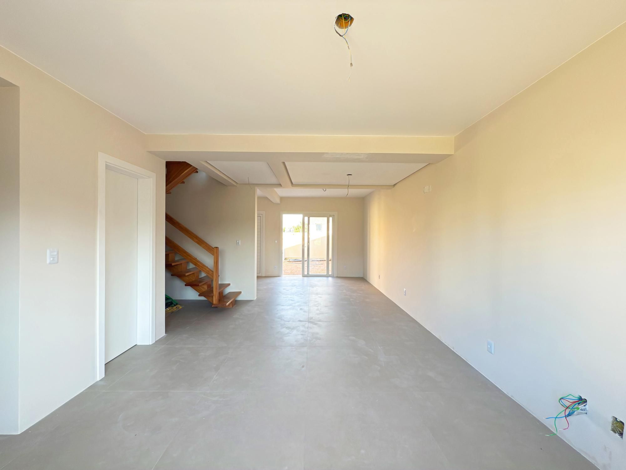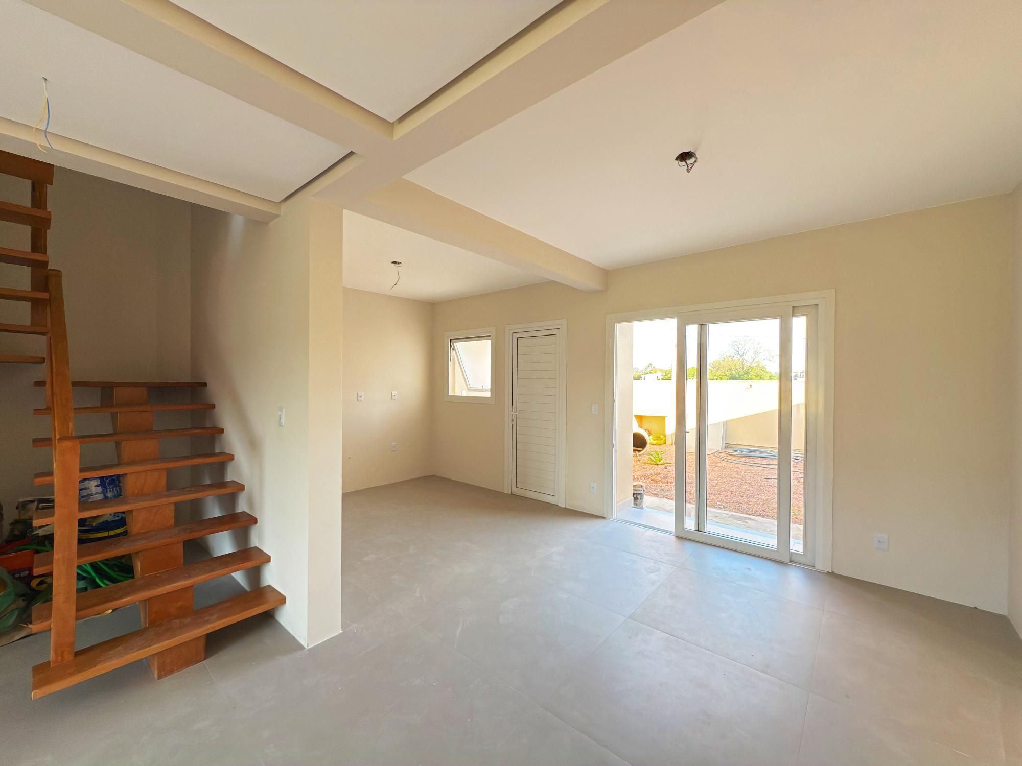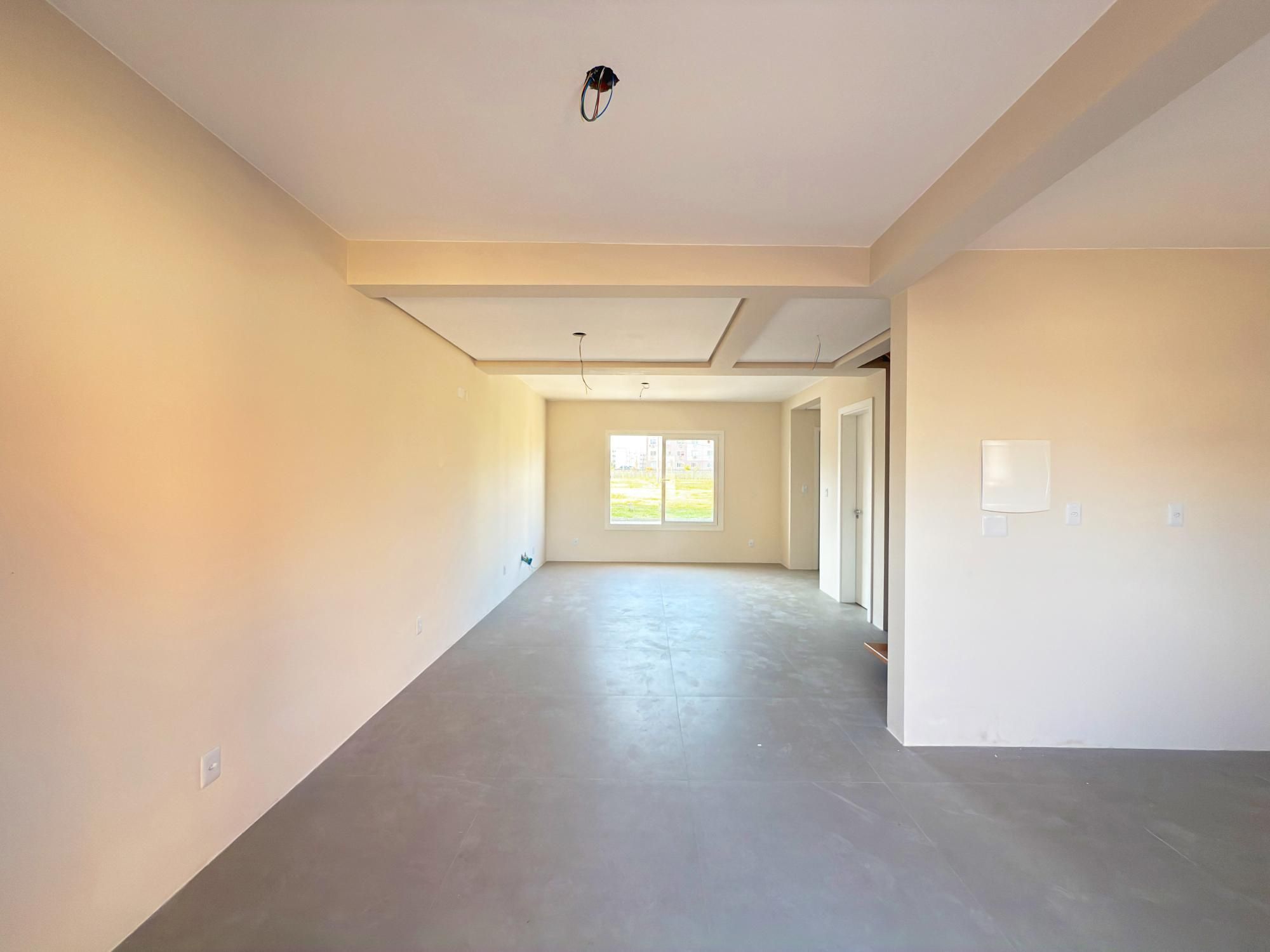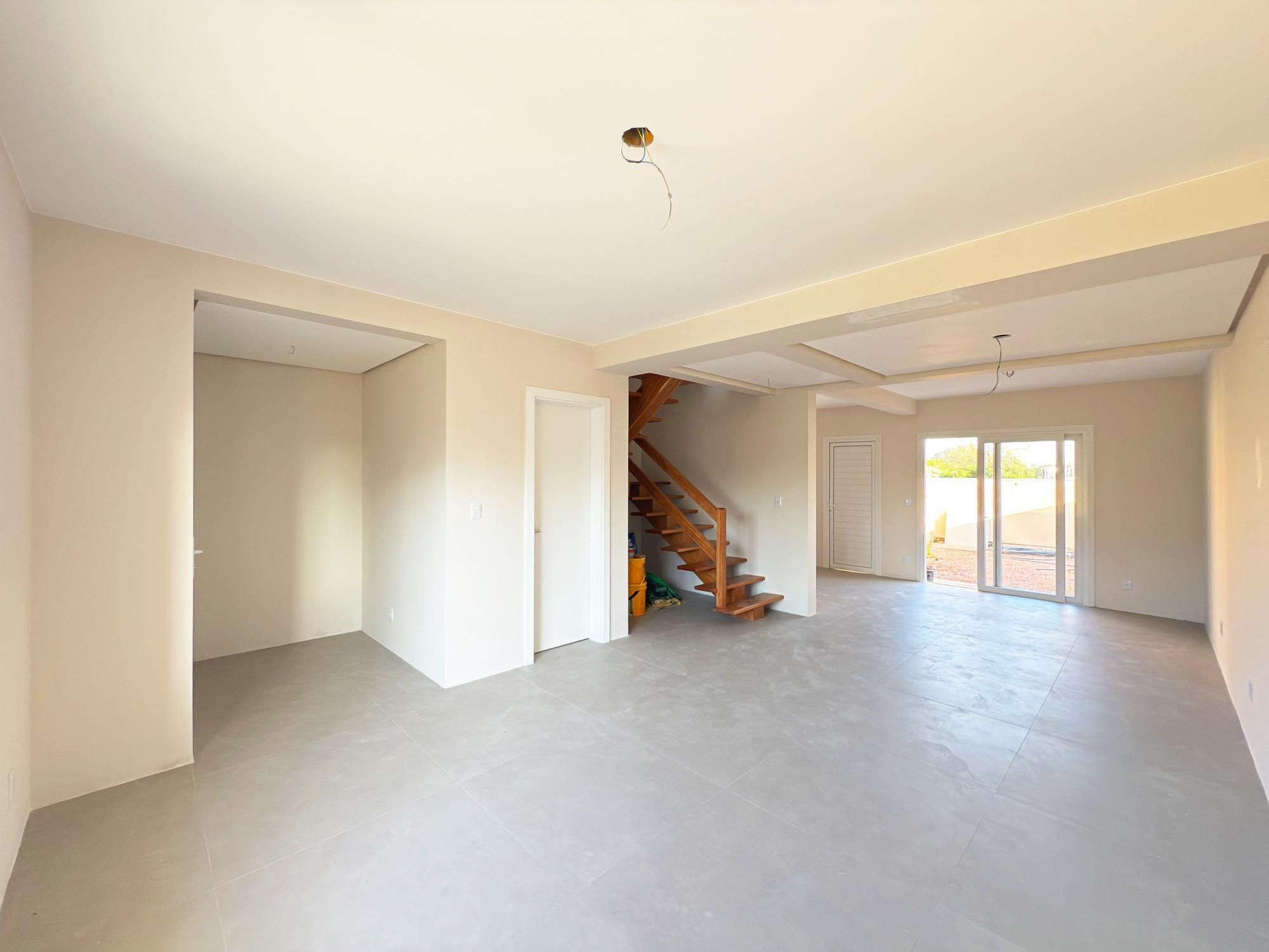 living amplo com pé direito duplo, lareira, com uma suíte, banheiro social, área de serviço, churrasqueira, duas vagas, porcelanato nos banheiros e living, laminado nos dormitórios, com pátio.