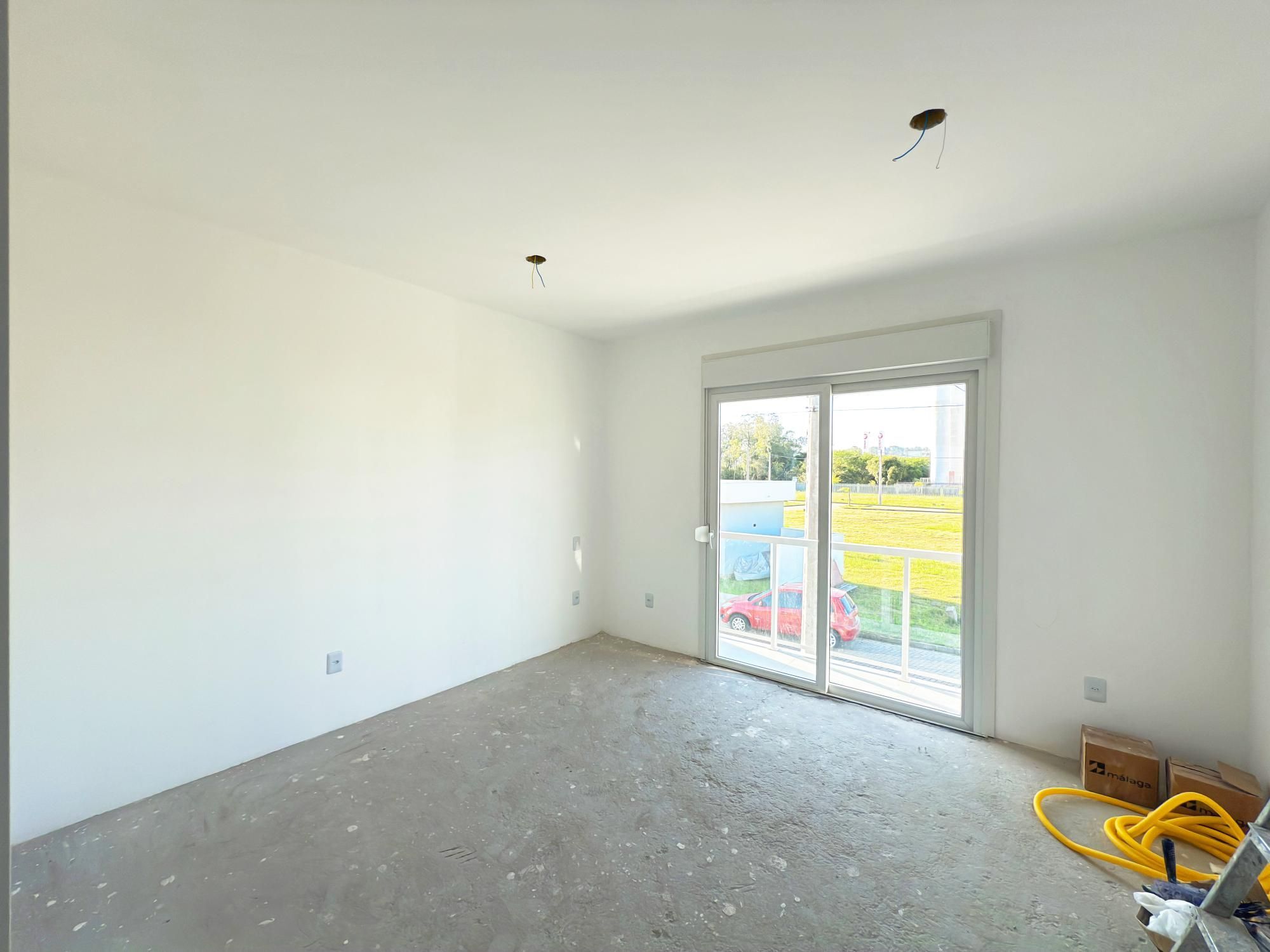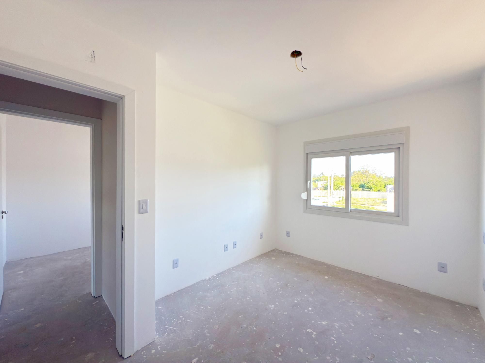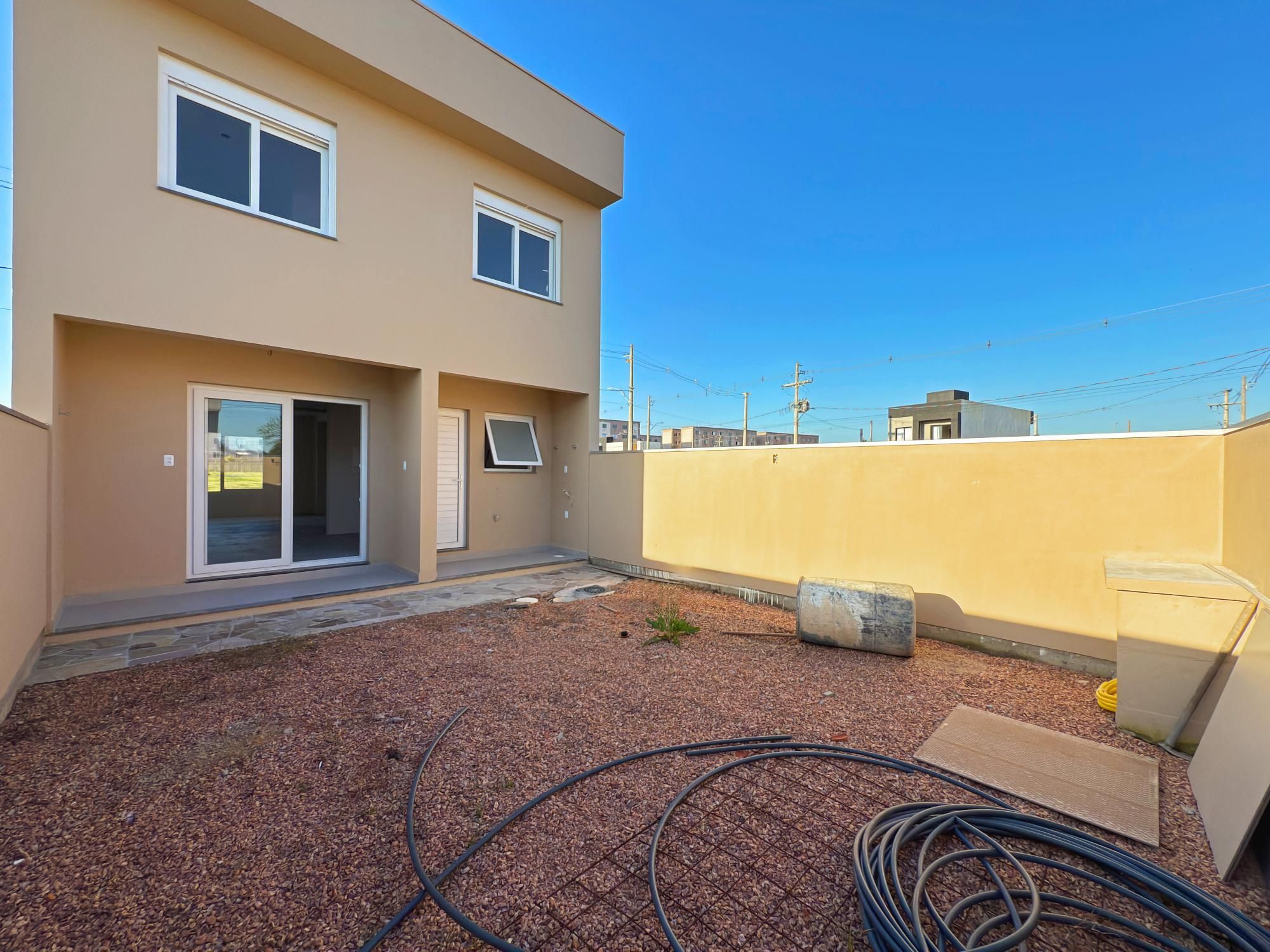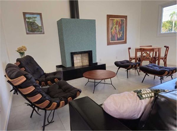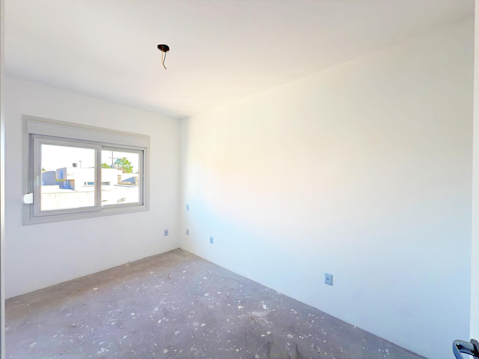 living amplo com pé direito duplo, lareira, com uma suíte, banheiro social, área de serviço, churrasqueira, duas vagas, porcelanato nos banheiros e living, laminado nos dormitórios, com pátio.