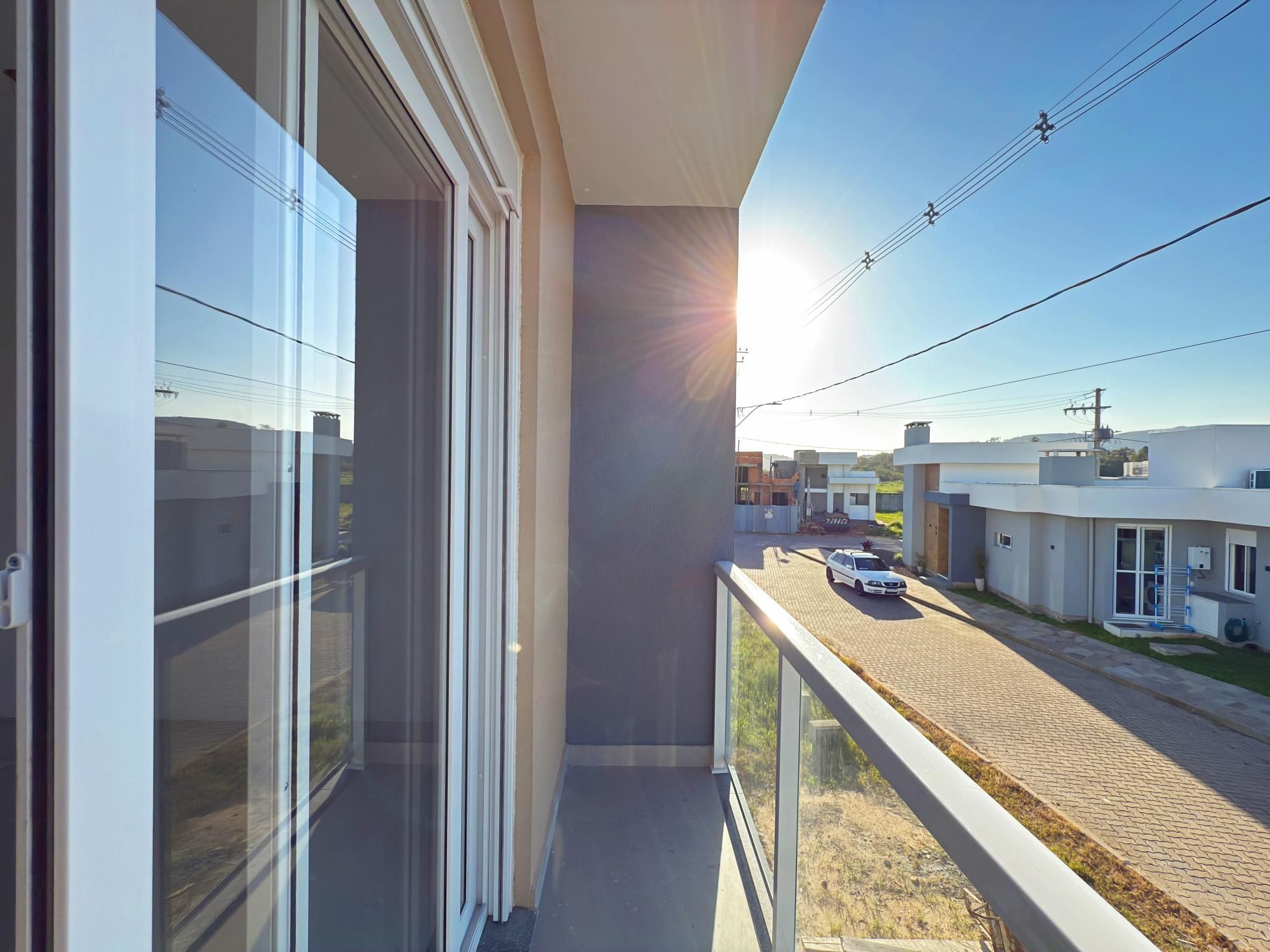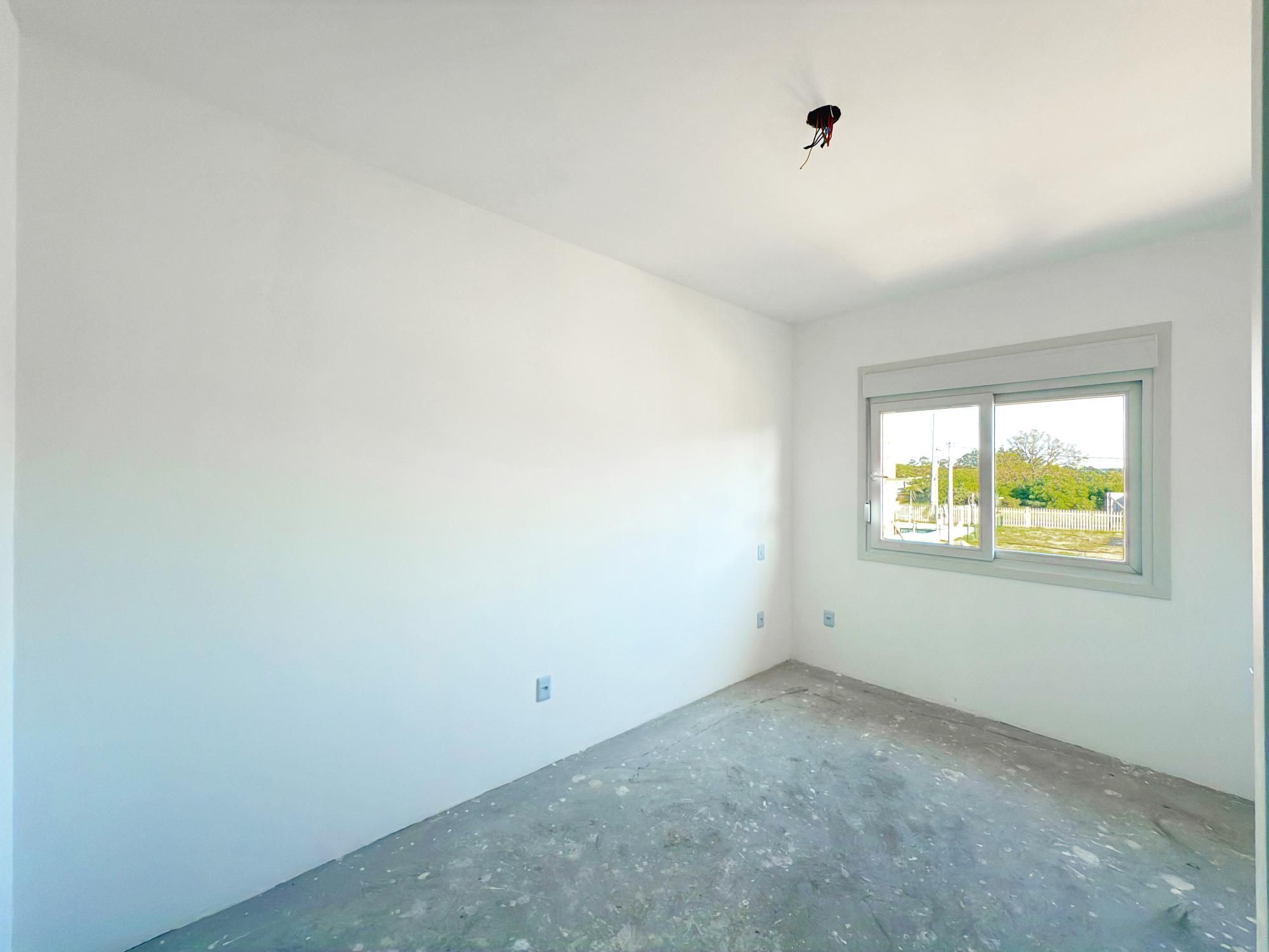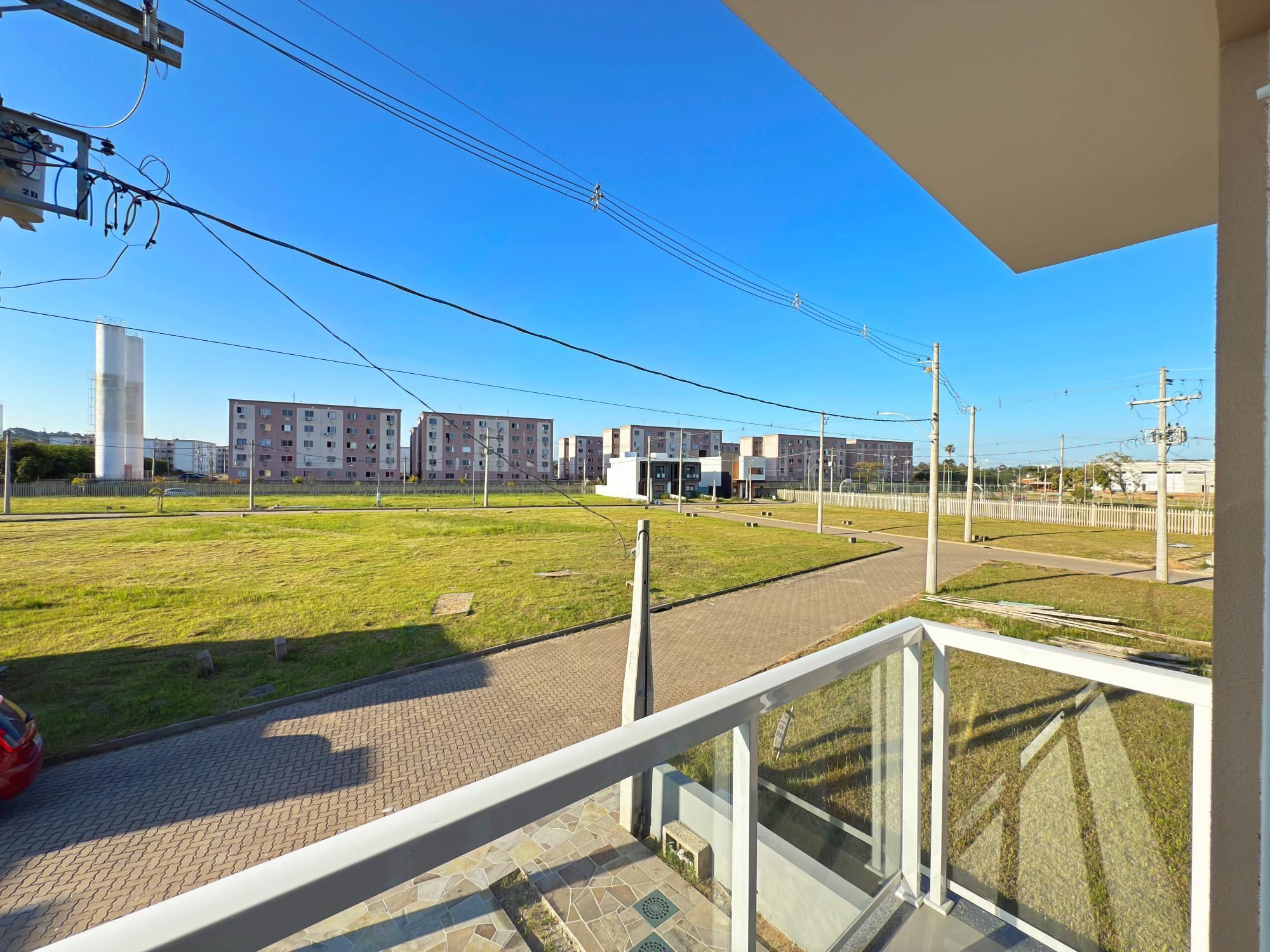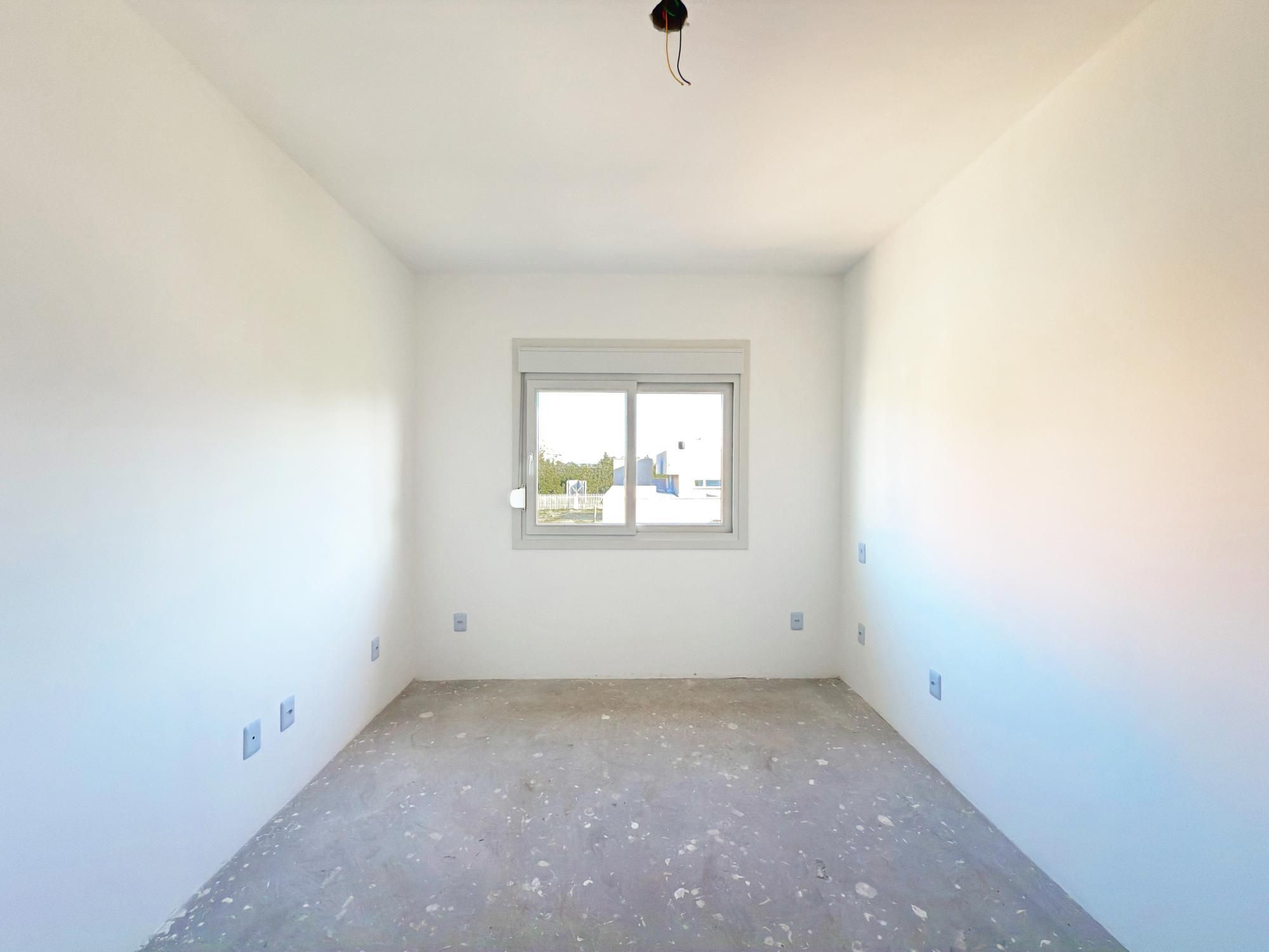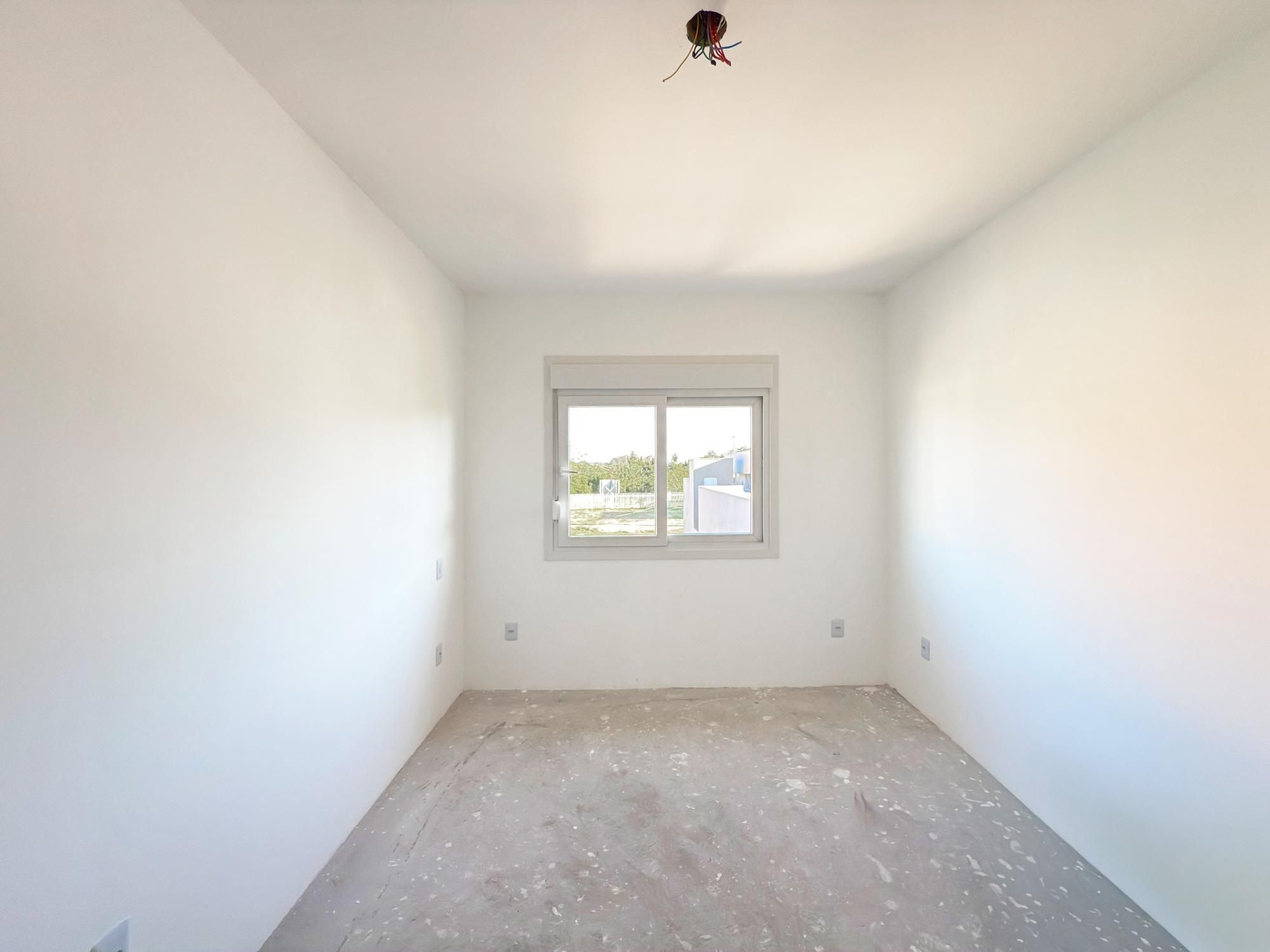 living amplo com pé direito duplo, lareira, com uma suíte, banheiro social, área de serviço, churrasqueira, duas vagas, porcelanato nos banheiros e living, laminado nos dormitórios, com pátio.