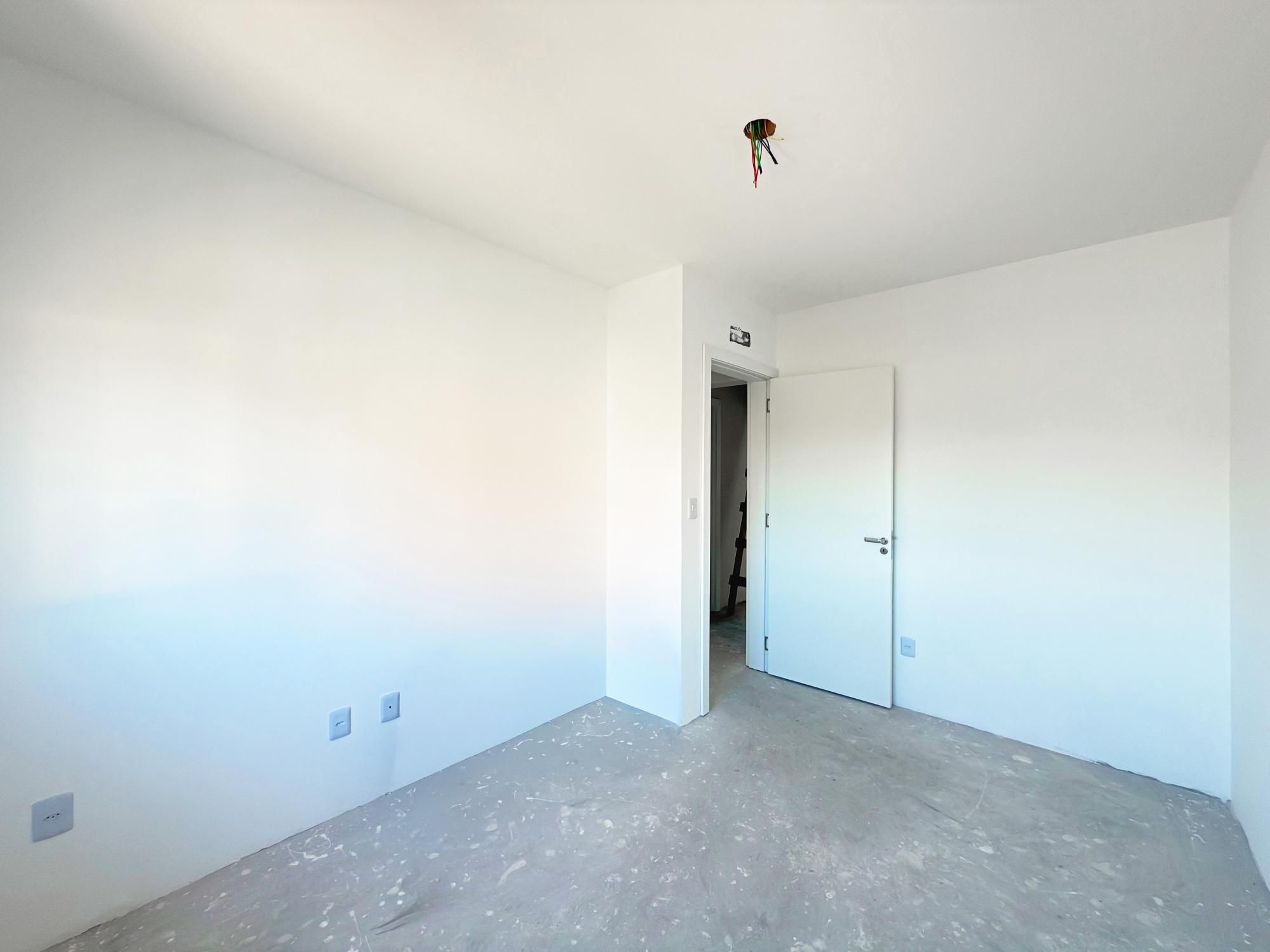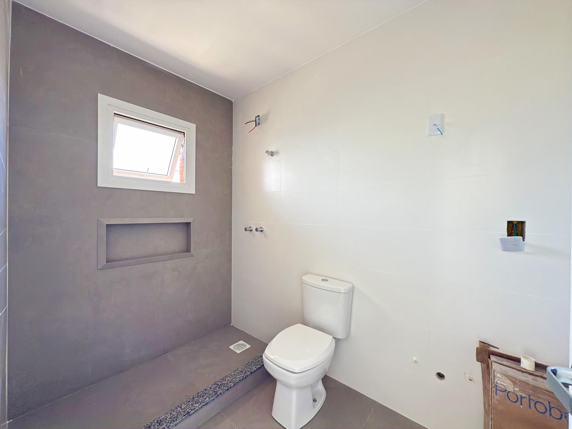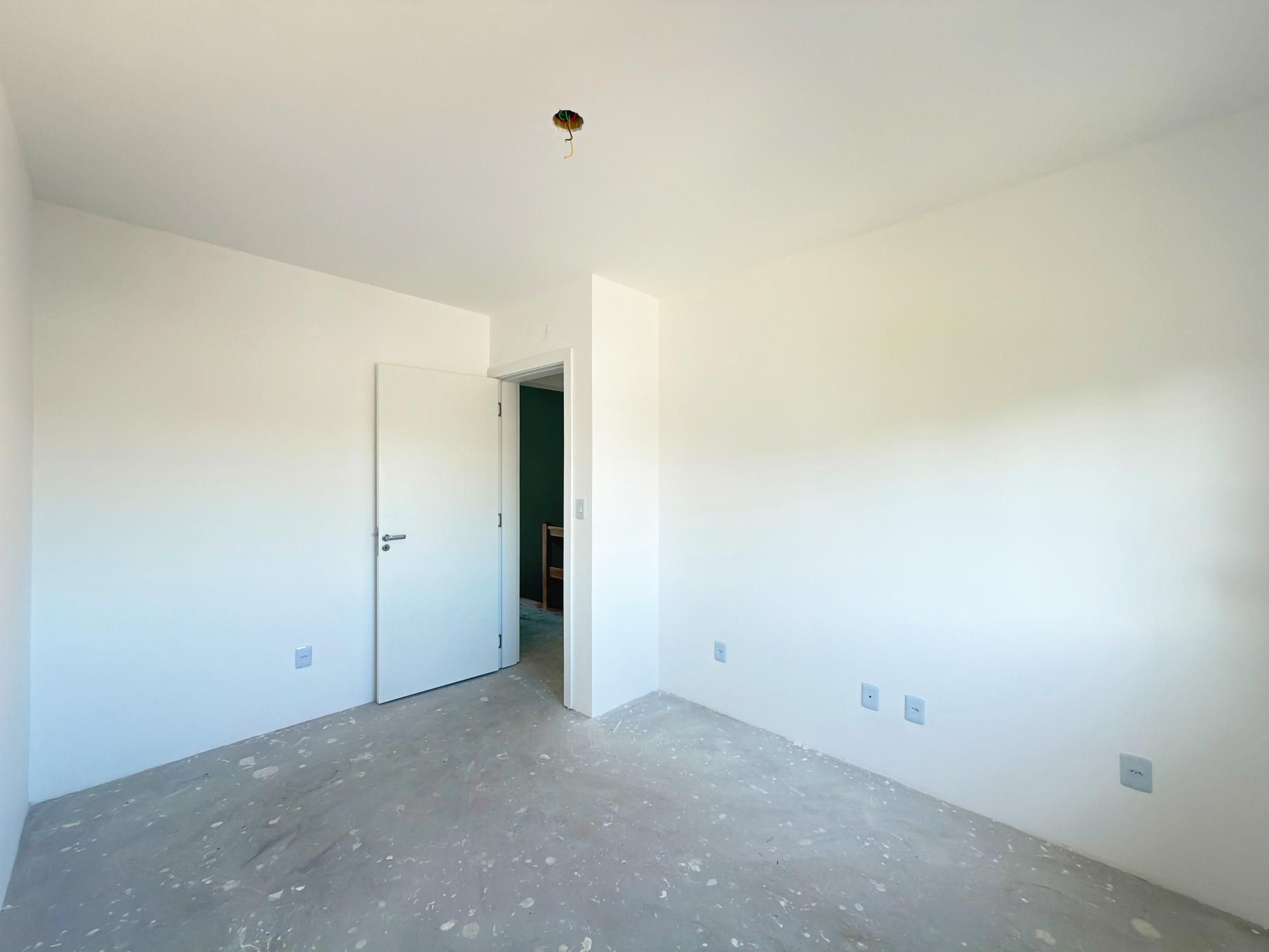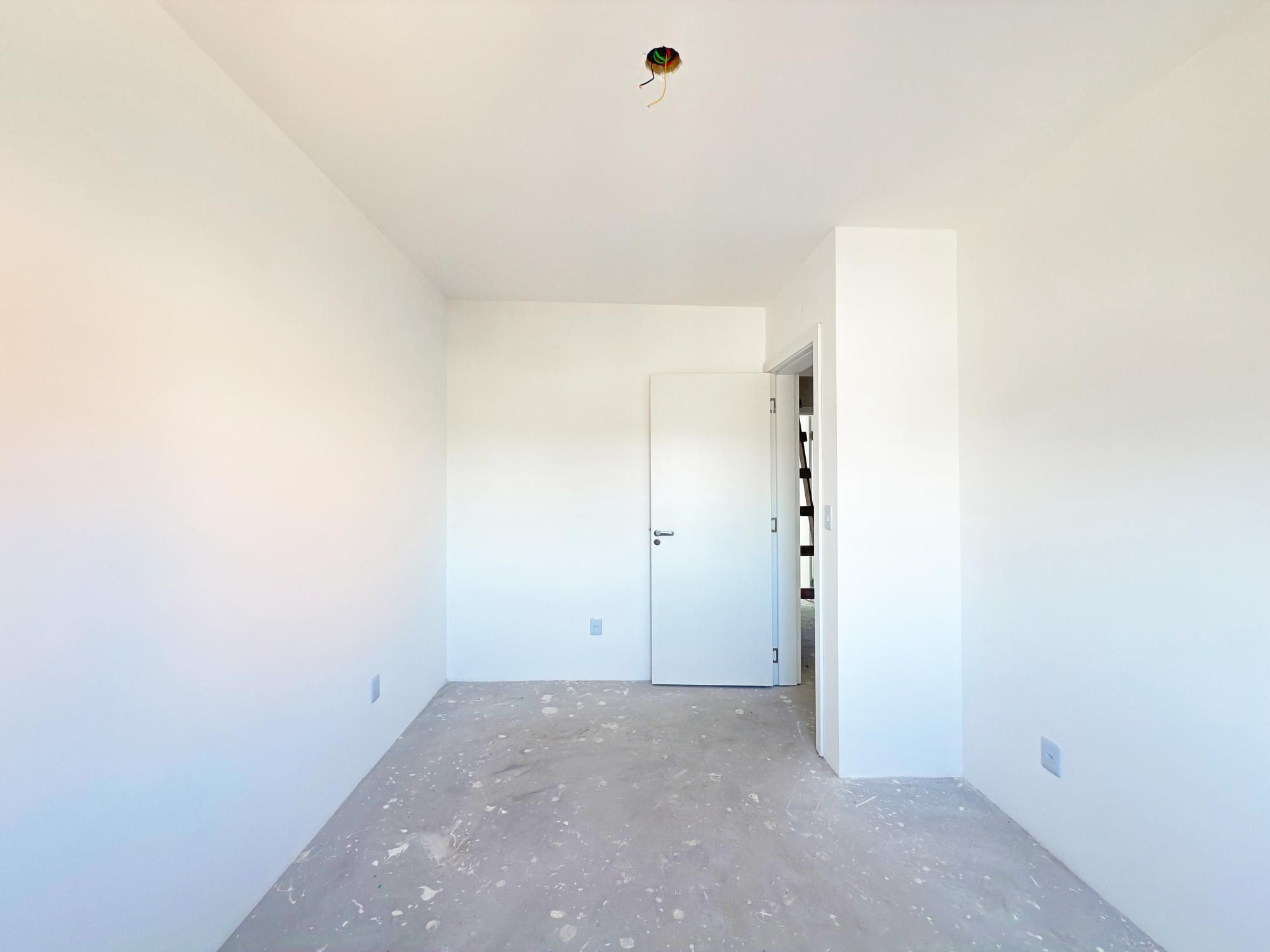 living amplo com pé direito duplo, lareira, com uma suíte, banheiro social, área de serviço, churrasqueira, duas vagas, porcelanato nos banheiros e living, laminado nos dormitórios, com pátio.