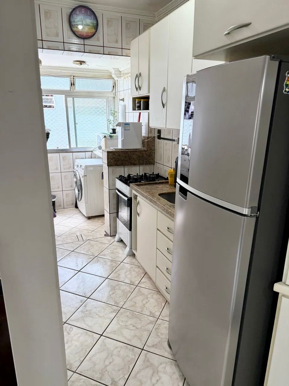 Apartamento semi mobiliado com 2 dormitórios, sala de estar e jantar com churrasqueira, banheiro social, cozinha e área de serviço separada.