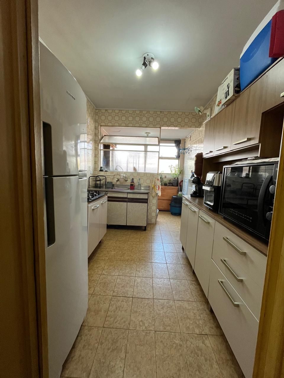 Cozinha, área de serviço com ventilação natural e projeto de churrasqueira na área de serviço.
