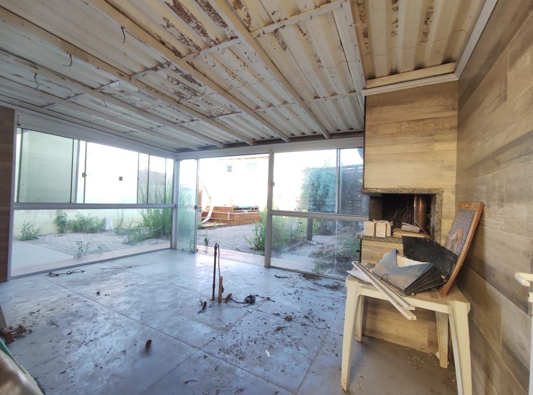 Quiosque com churrasqueira e fogão a lenha integrado à casa e fechado com vidro.