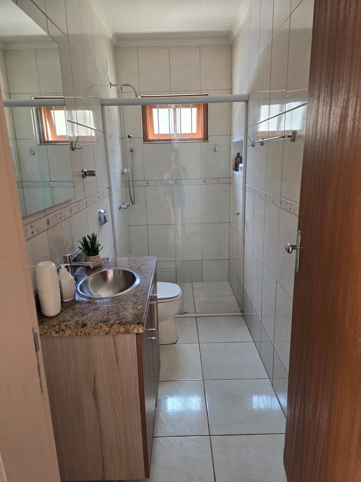 Banheiro Social: Acabamento em granito, box Blindex, ventilação natural e sistema de chuveiro a gás (Junker).