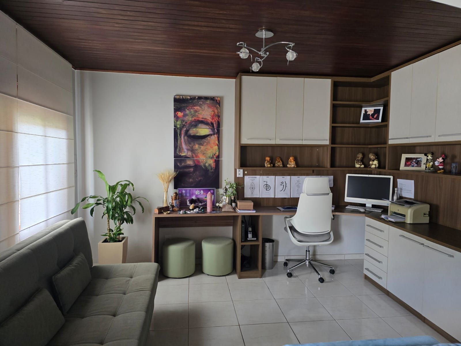 Área Social: Living em dois ambientes com elegante desnível, composto por sala de TV com painel ripado e um espaçoso home office/biblioteca totalmente equipado com bancada em "L" e armários aéreos. Conta com ar-condicionado Split de 18.000 BTUs e cortinas completas.