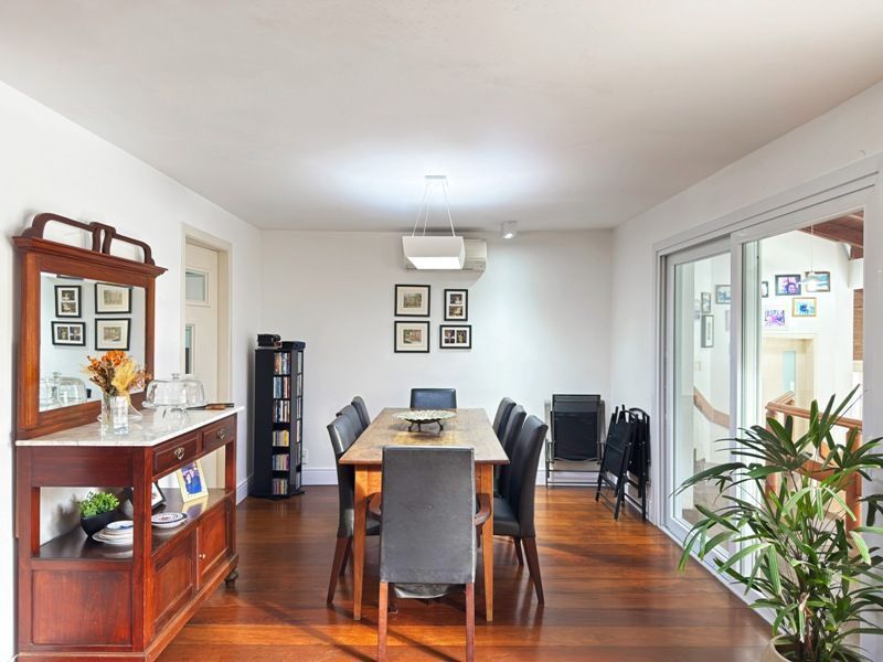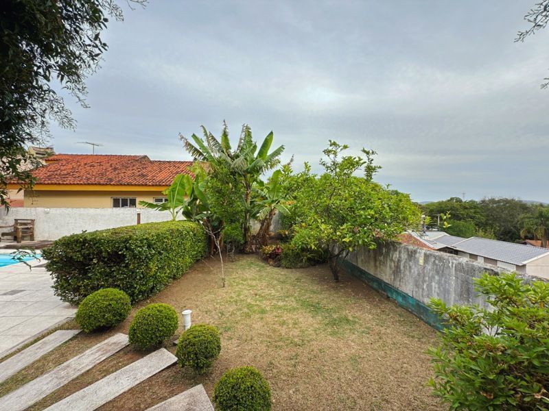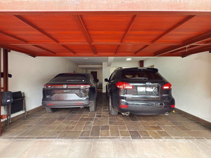 Garagem fechada para 4 carros e condição de estacionar mais 2 em área descoberta em frente a casa no pátio frontal, totalizando 6 vagas.