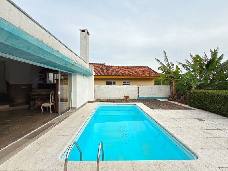 Espaçoso salão de festas e espaço gourmet construído em quase toda a largura do terreno com banheiro auxiliar completo e portas de correr envidraçadas (vidro temperado) que abertas se integram ao pátio com piscina aquecida (aquecimento solar).