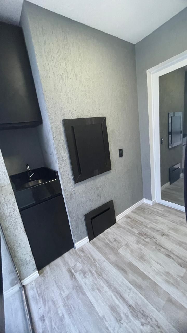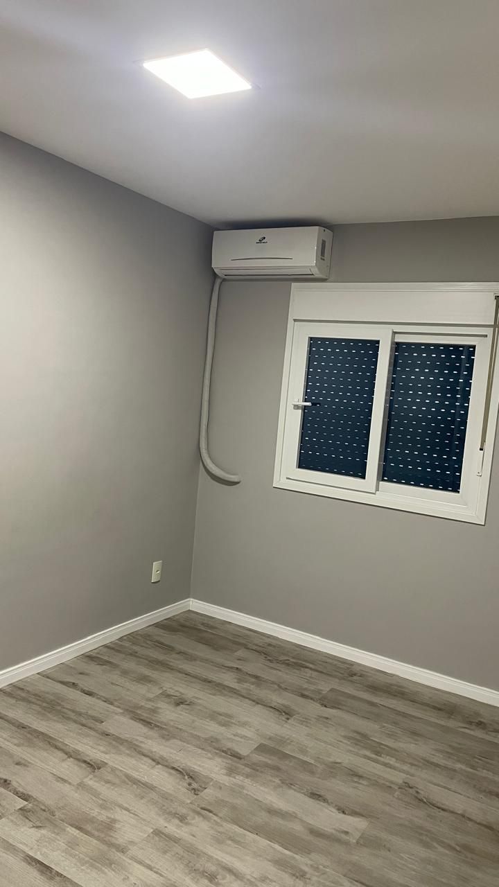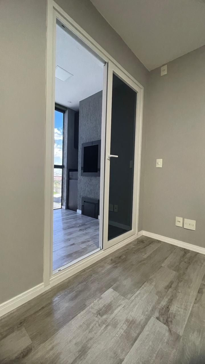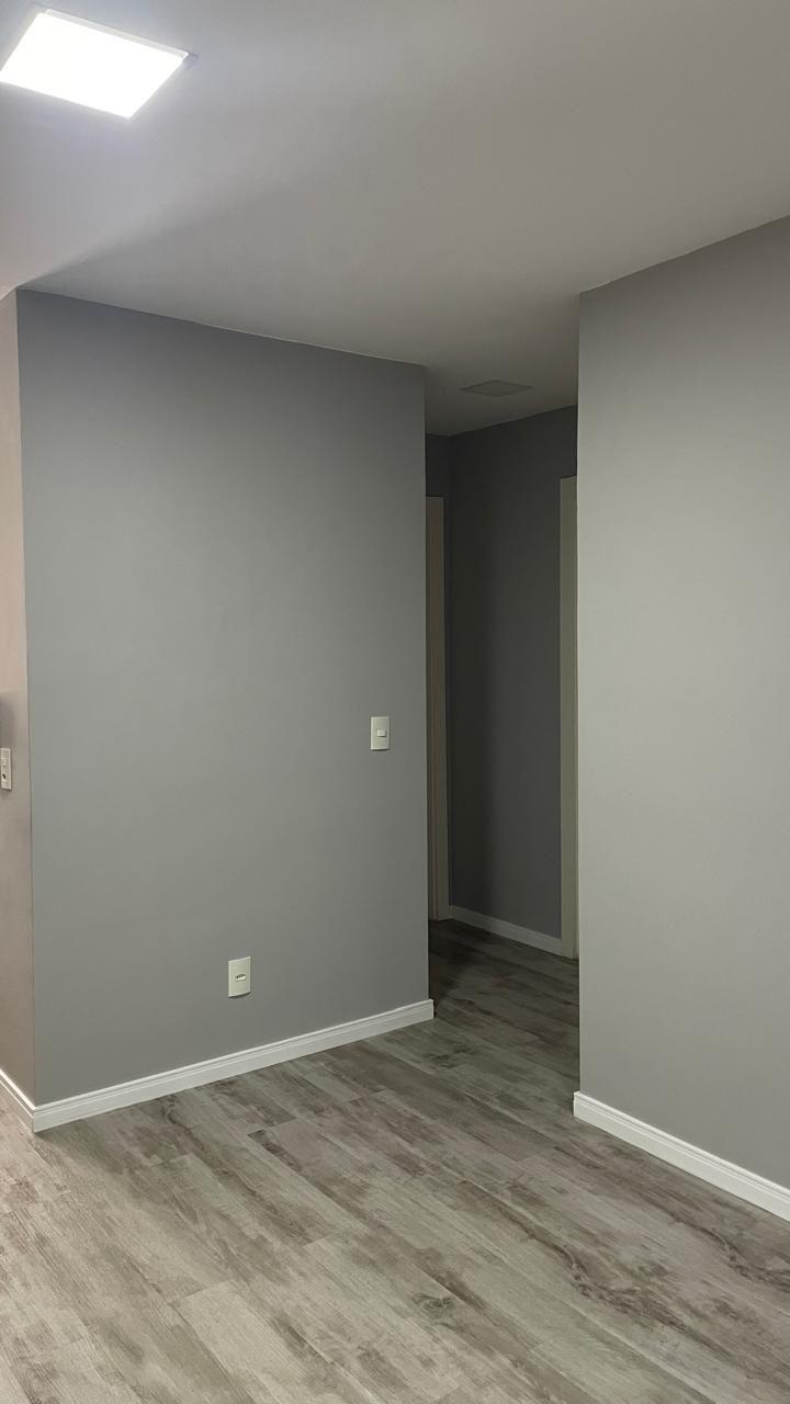 Piso vinílico cinza novo em todo apartamento com rodapés de poliestireno branco de 10cm.