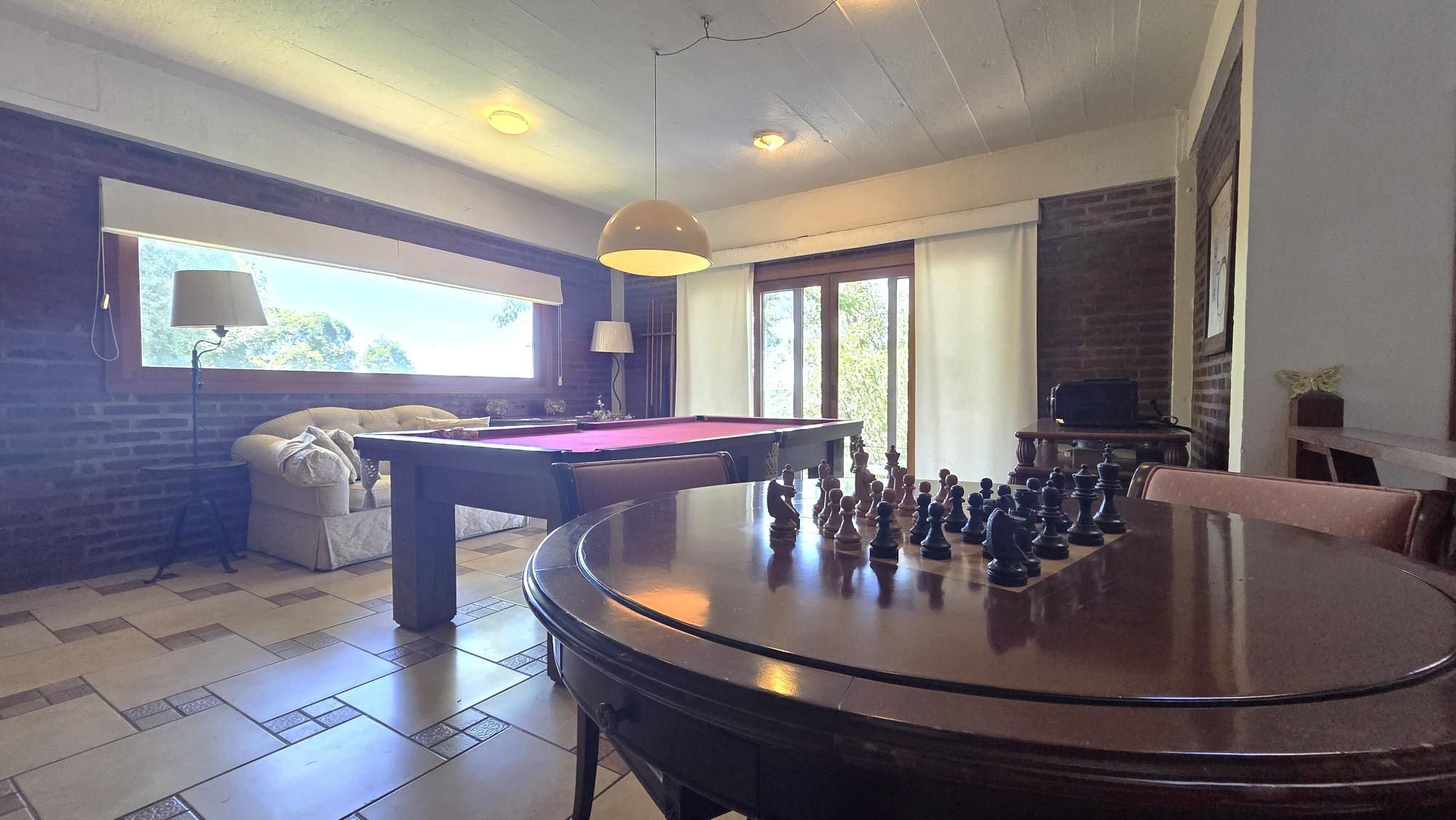 Nos andares inferiores, a casa oferece sala de jogos com mesa de sinuca, lavanderia, pátio interno fechado com claraboia, além de depósito / adega. Na área externa, um belo espaço de lazer com piscina, churrasqueira e área para mesas.