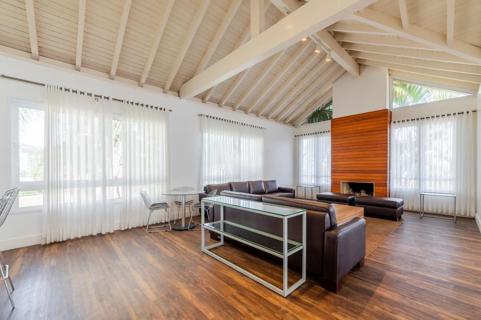 A casa conta, no pavimento térreo, com hall de entrada, um lavabo charmoso, living amplo com 2 ambientes (sala de estar com lareira e sala de jantar), cozinha planejada, área de serviço fechada e área externa aberta. A casa conta com espaço previsto para a instalação de elevador.