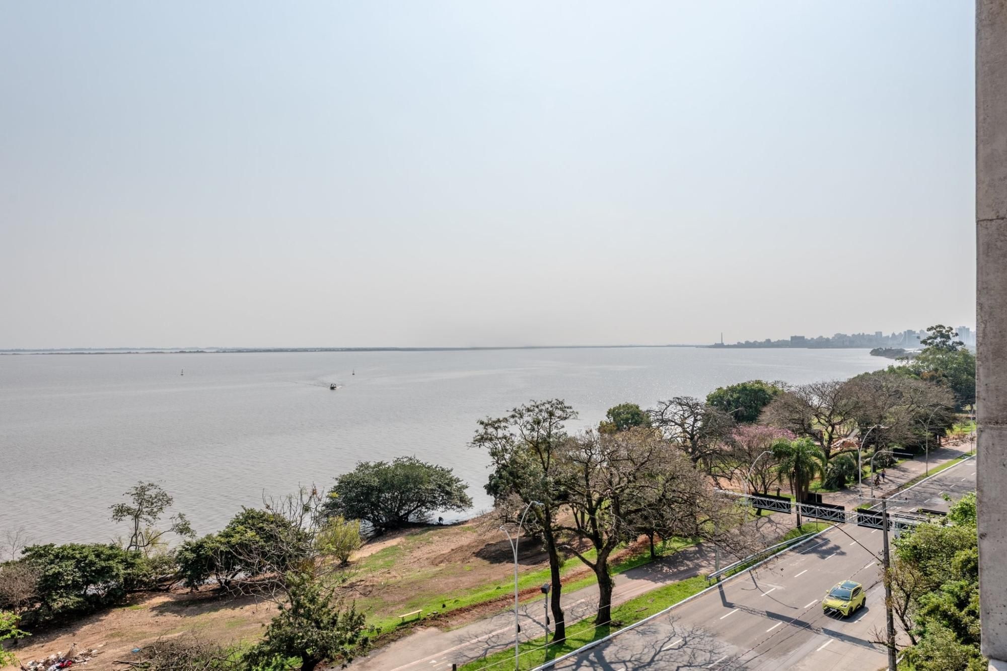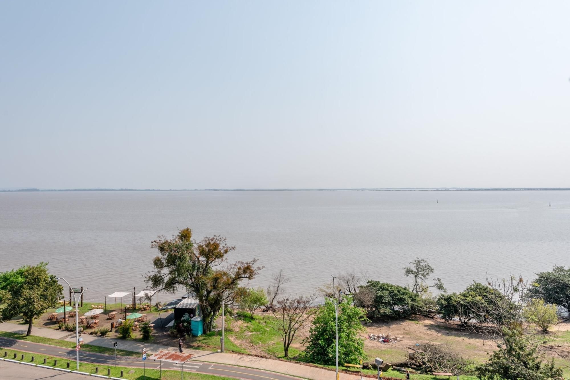 À frente, as águas tranquilas do Guaíba, seus barcos e um dos mais belos entardeceres do Brasil — até onde a vista alcança.