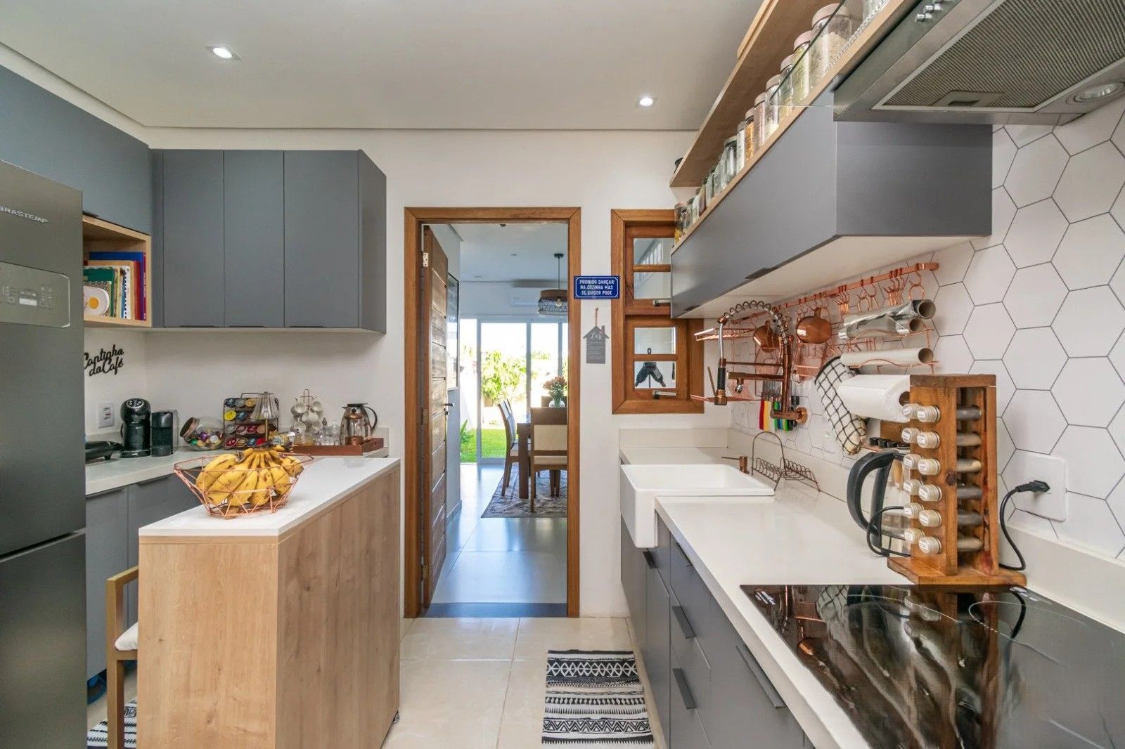 O imóvel possui pátio frontal com paisagismo e portão de vidro automatizado. No térreo, conta com sala de estar com móvel sob medida e espera para lareira, cozinha moderna e planejada com bancada em quartzo, lavabo, lavanderia com móveis planejados, sala de jantar com churrasqueira e amplo pátio nos fundos, ideal para lazer, pets e possibilidade de piscina.