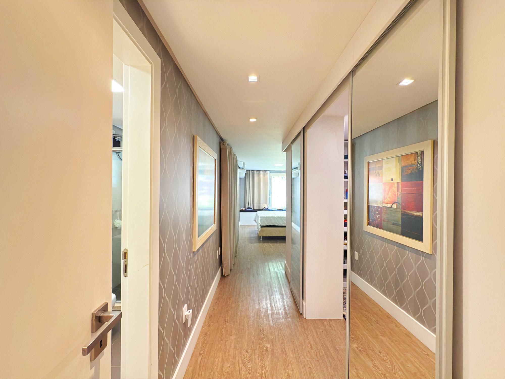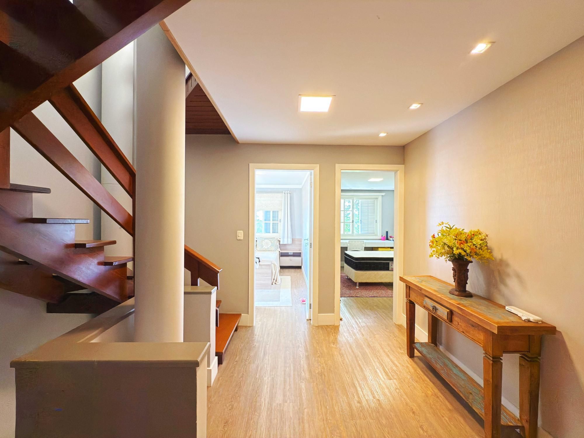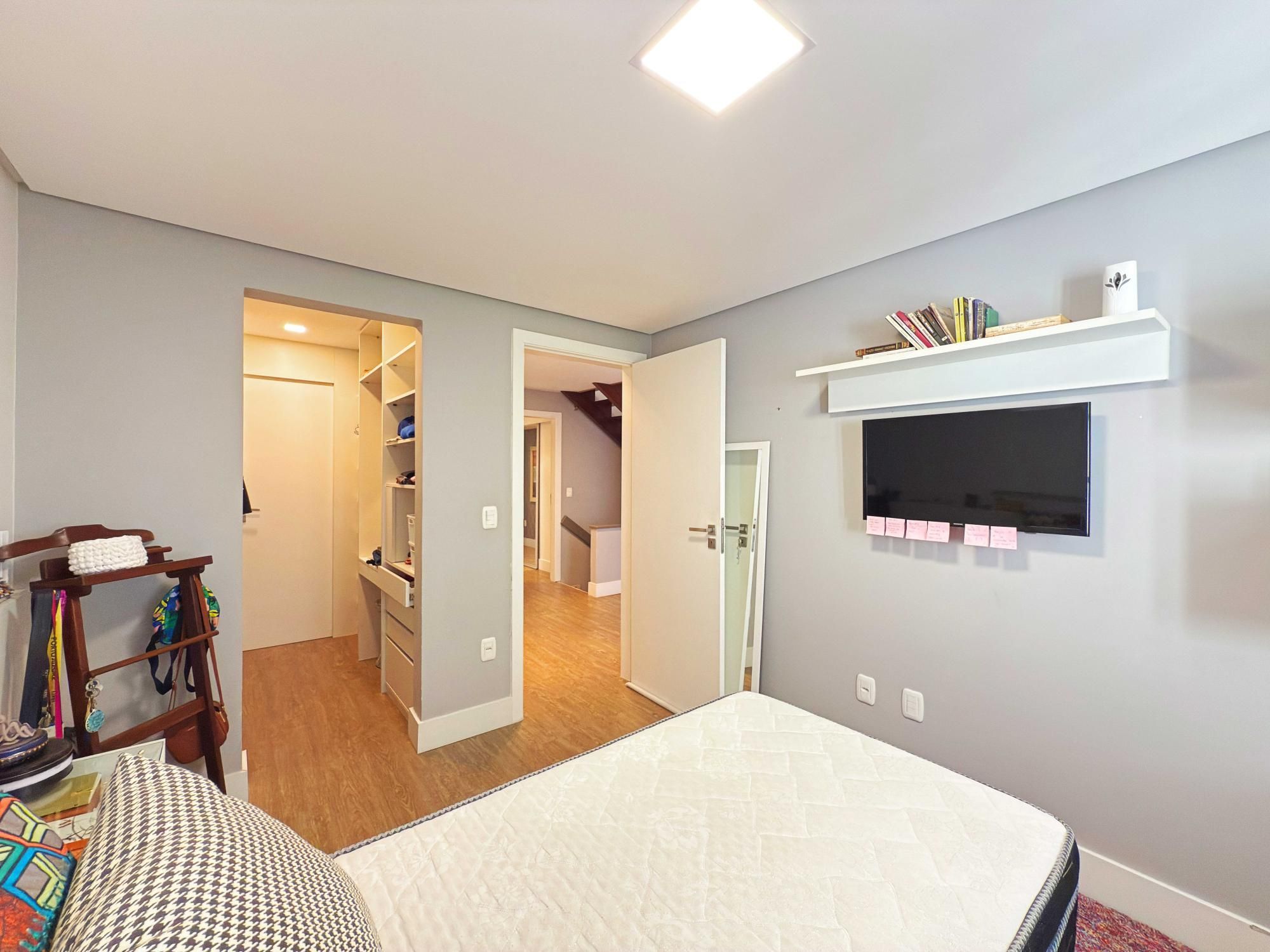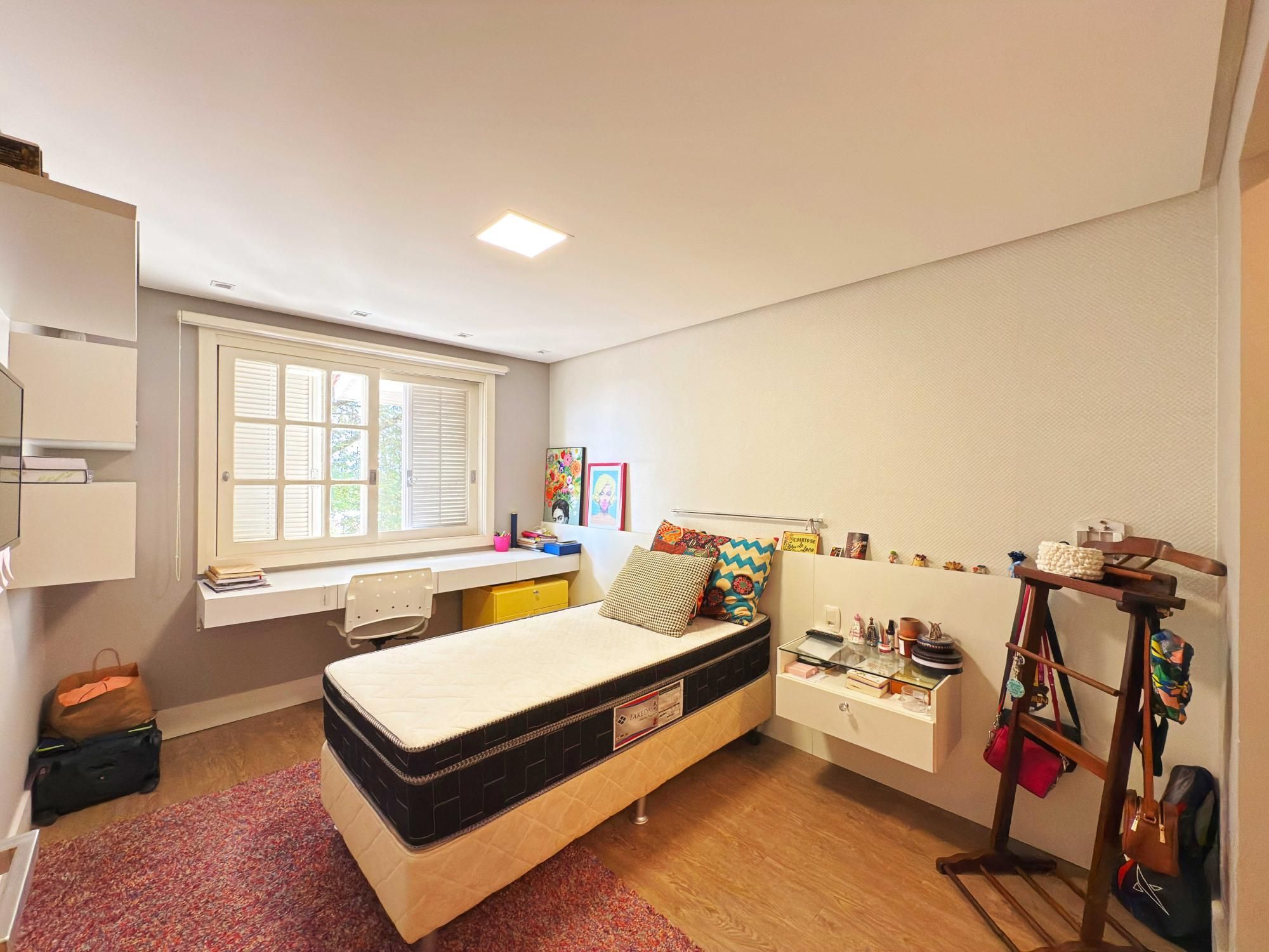 Parte íntima composta de 03 dormitórios, sendo um deles suíte de casal com closet e outra suíte de solteiro também com closet, sacada e banheiro social que atende o outro dormitório de solteiro. Opção de criar o 4º dormitório no sótão onde tem amplo terraço.