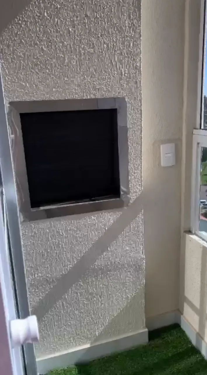 Sacada com churrasqueira e fechada em vidro, proporcionando segurança e conforto.