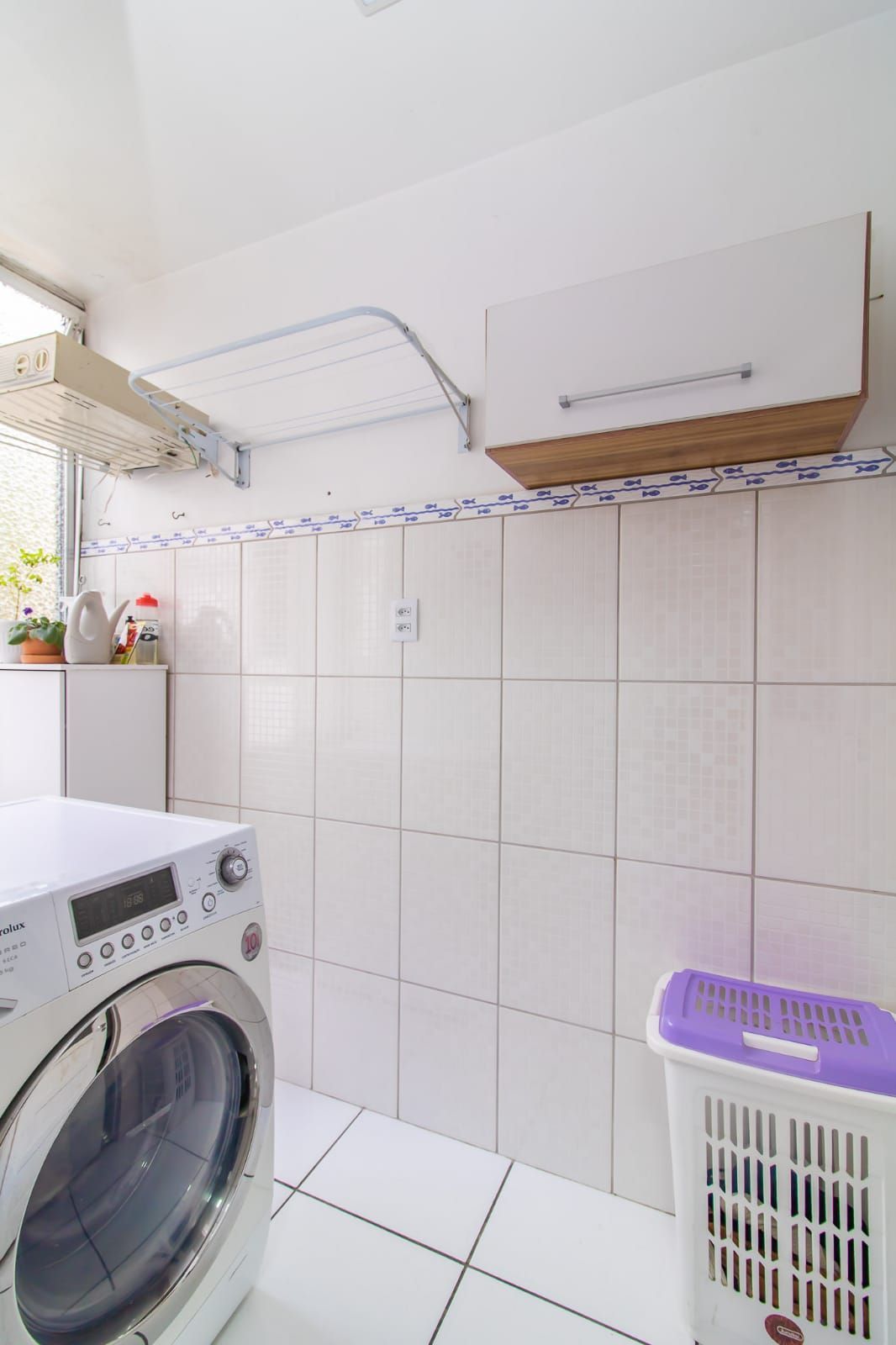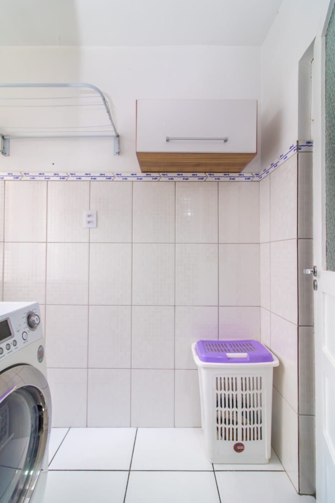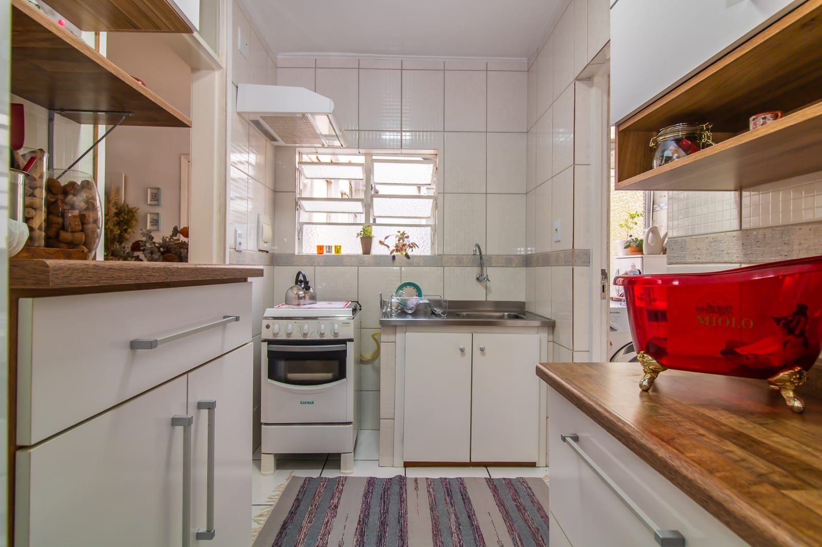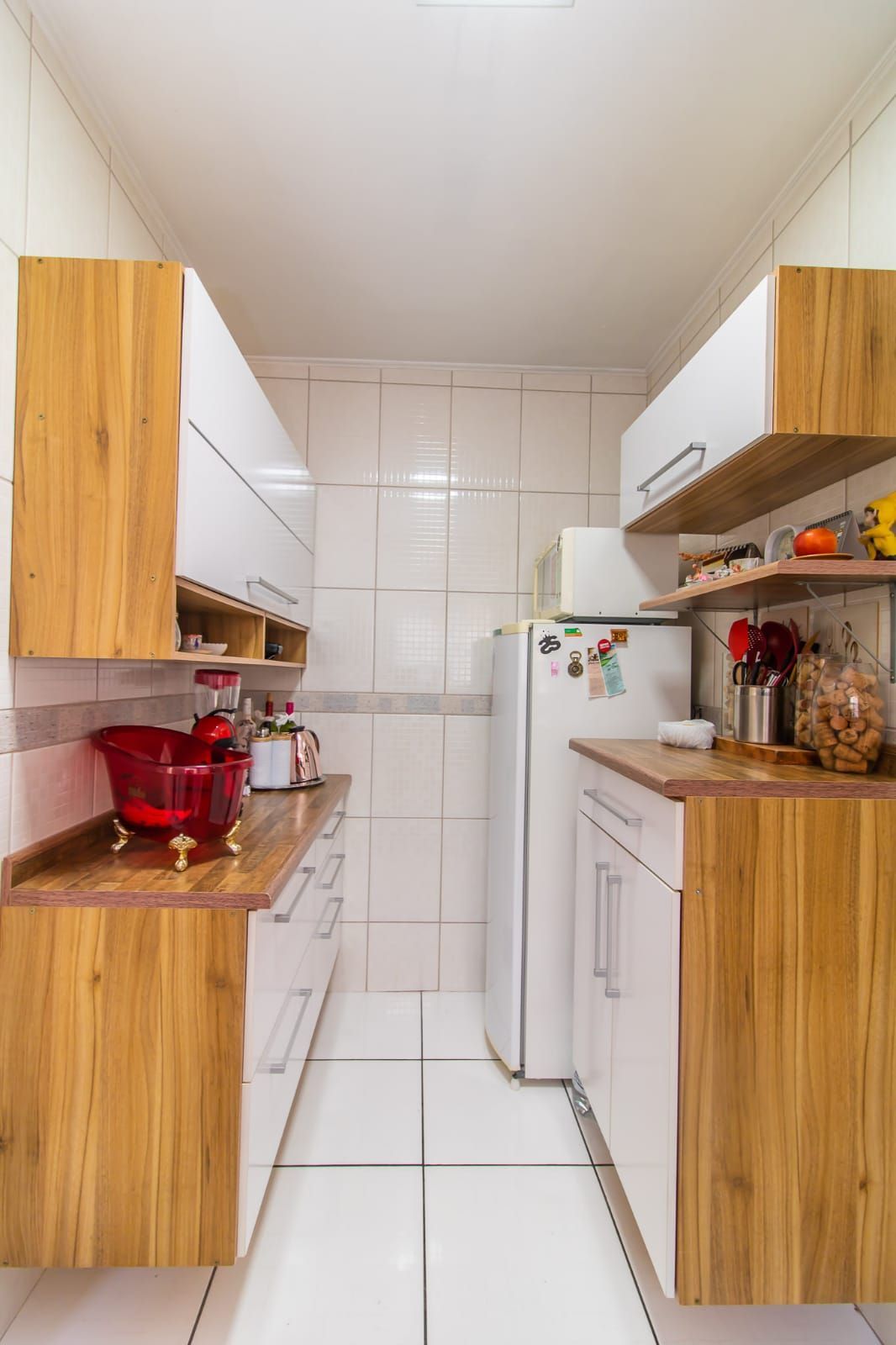 Cozinha clara, prática e bem distribuída, armários planejados, boa circulação e funcionalidade, janela com entrada de luz natural acima da pia e acesso à área de serviço separada com banheiro auxiliar.