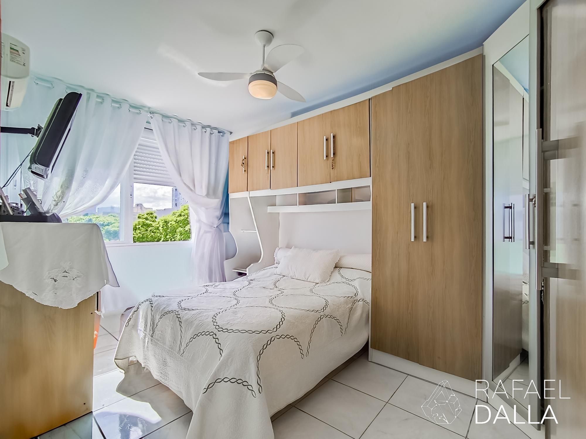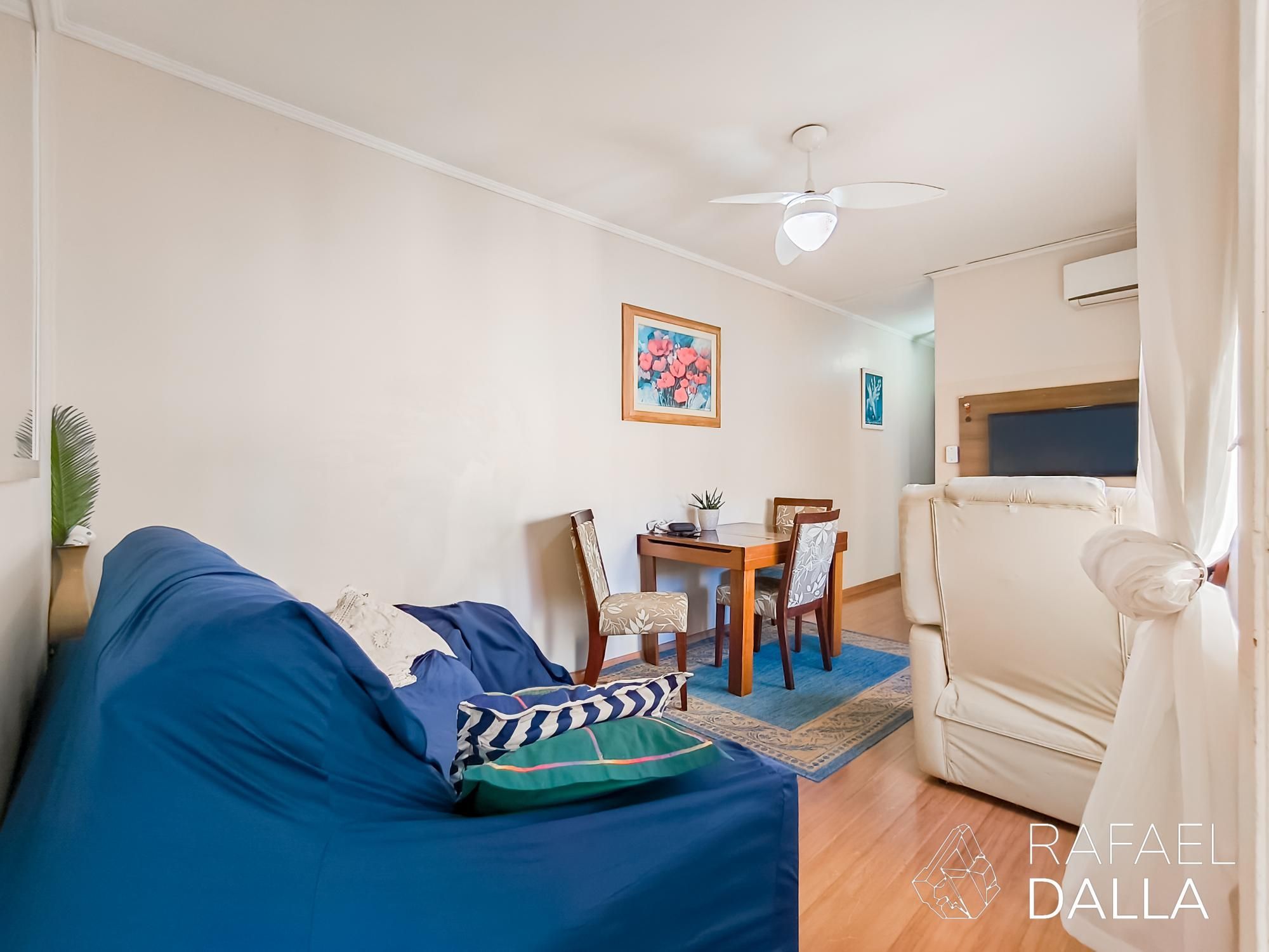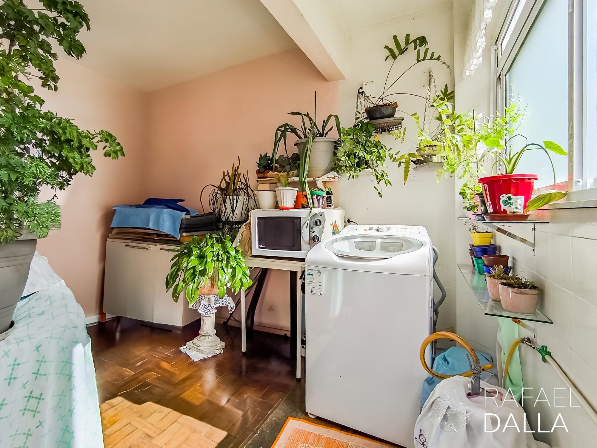 Apartamento com cerca de 80m² privativos, distribuído em dois dormitórios amplos, living para dois ambientes, banheiro social com ventilação natural e banheiro auxiliar. A cozinha tem bom tamanho e ligação com a antiga dependência de empregada, hoje transformada em uma área de serviço funcional. A vista dos quartos é permanente, voltada para o sol da manhã e para a Escola Olinto de Oliveira, garantindo luminosidade e vista definitiva. O piso é laminado e o imóvel está em ótimo estado de conservação. Prédio pequeno, com poucas unidades e baixo custo condominial.