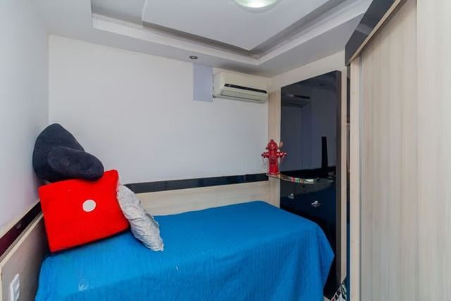 Cozinha em porcelanato, com móveis planejados, além de área de serviço integrada com churrasqueira. Banheiro com móveis planejados, box de vidro e ventilação natural. Possui 2 dormitórios com bom acabamento, luminárias e janelas amplas.