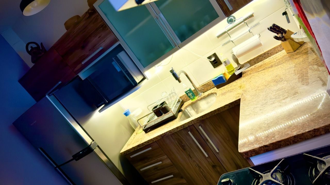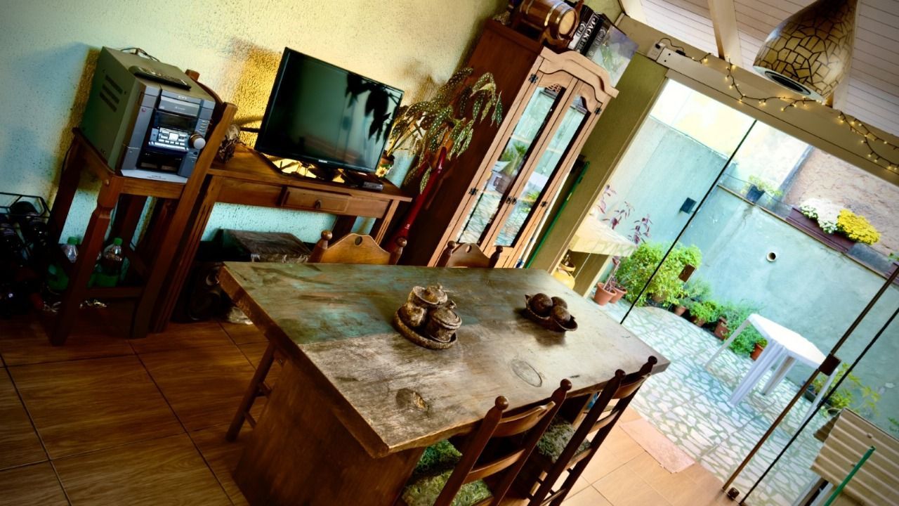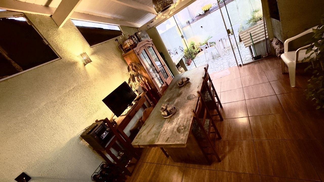 Andar inferior - Sala ampla, lavabo, cozinha funcional com integração com um espaço gourmet com churrasqueira e decoração rústica, ideal para momentos de lazer.
