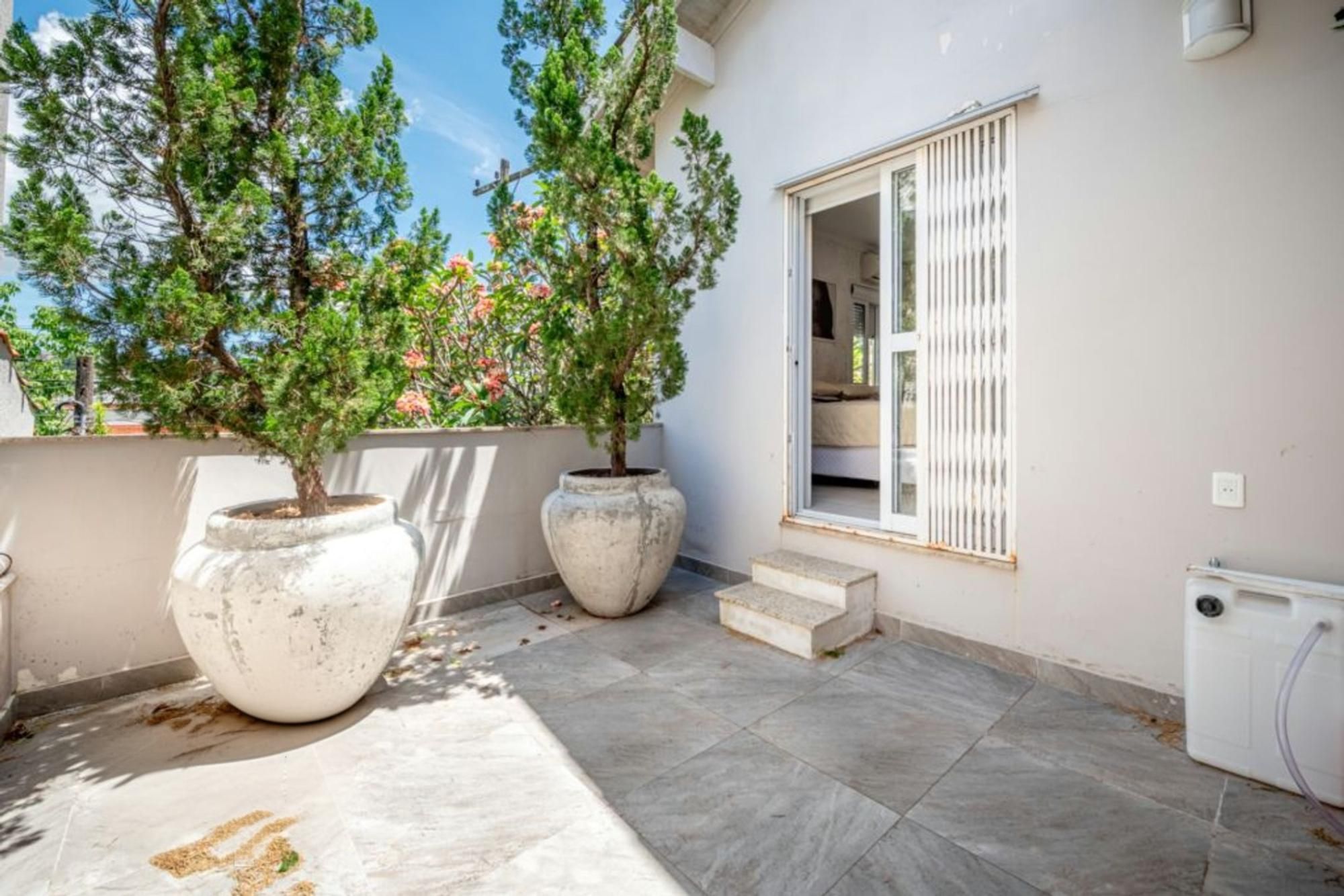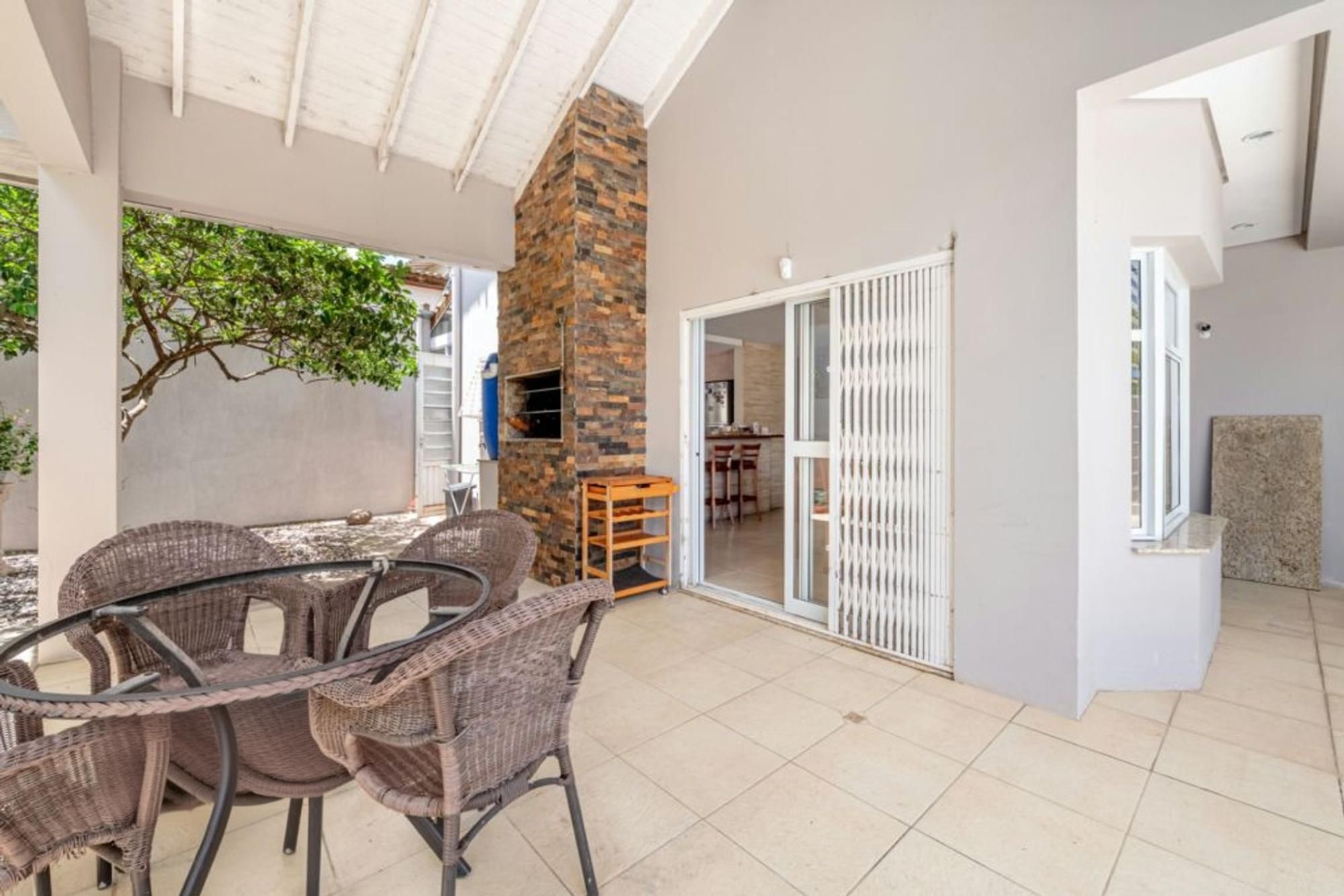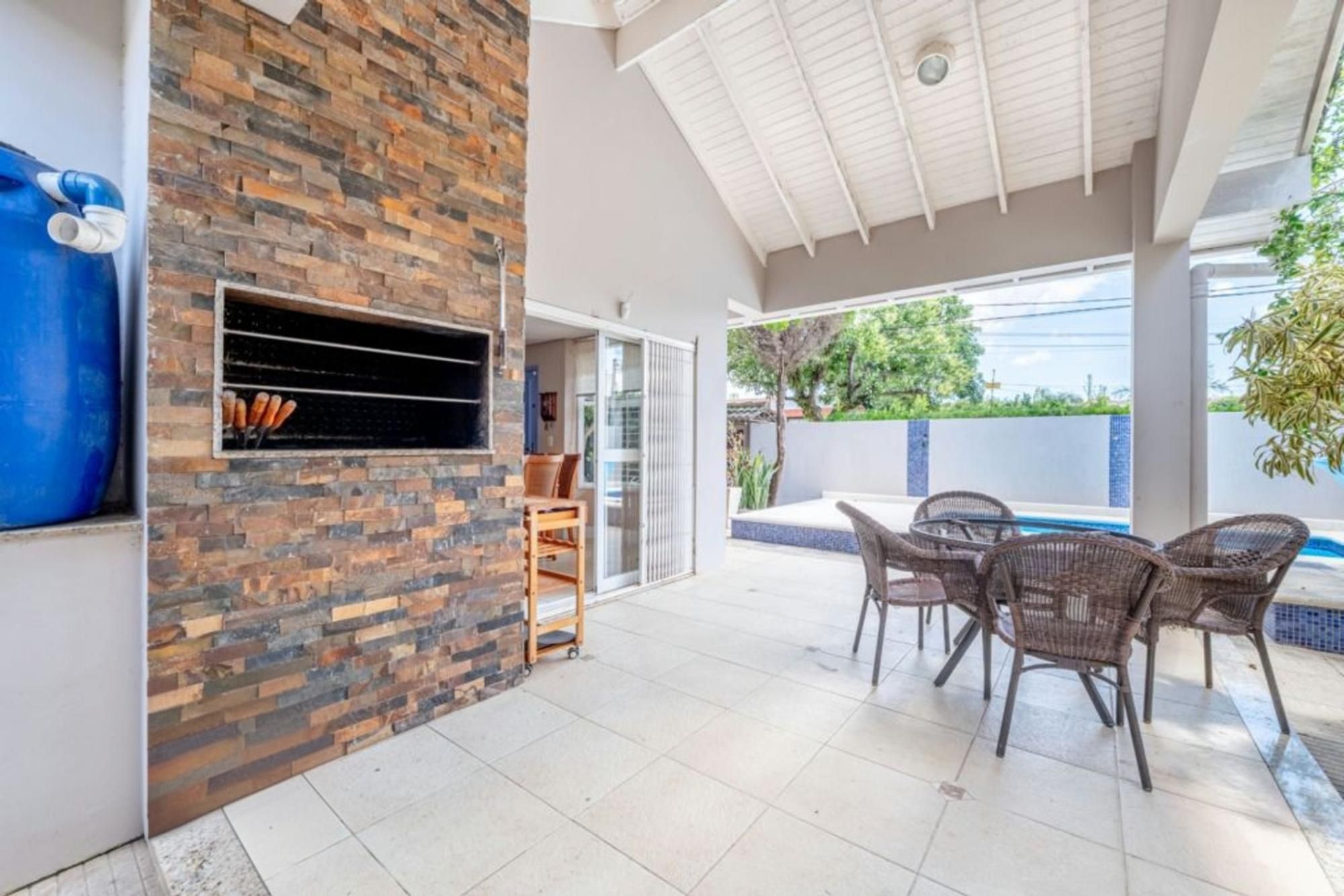 Área externa com piscina privativa e churrasqueira, ideal para lazer. Garagem coberta para até 2 carros.