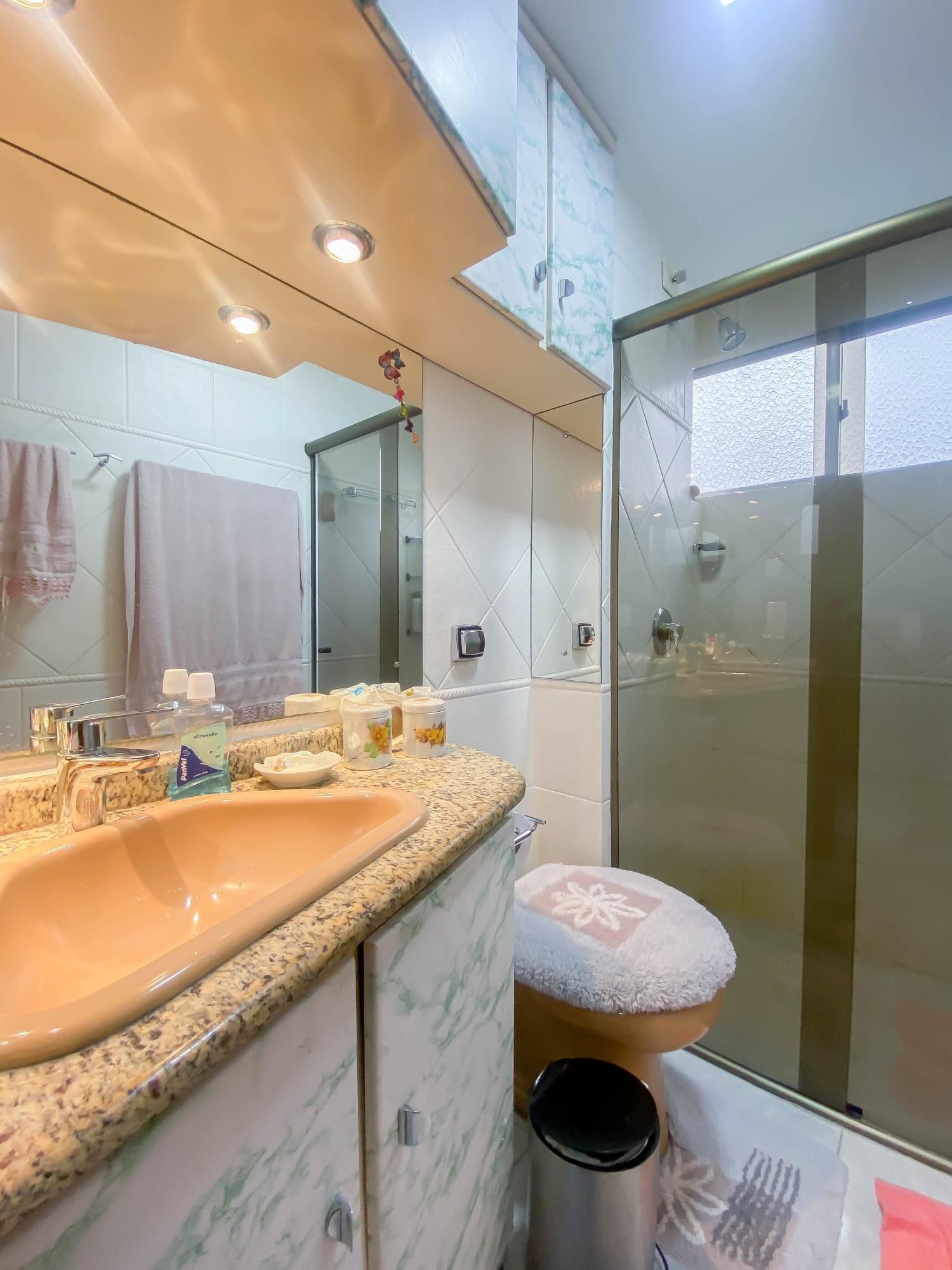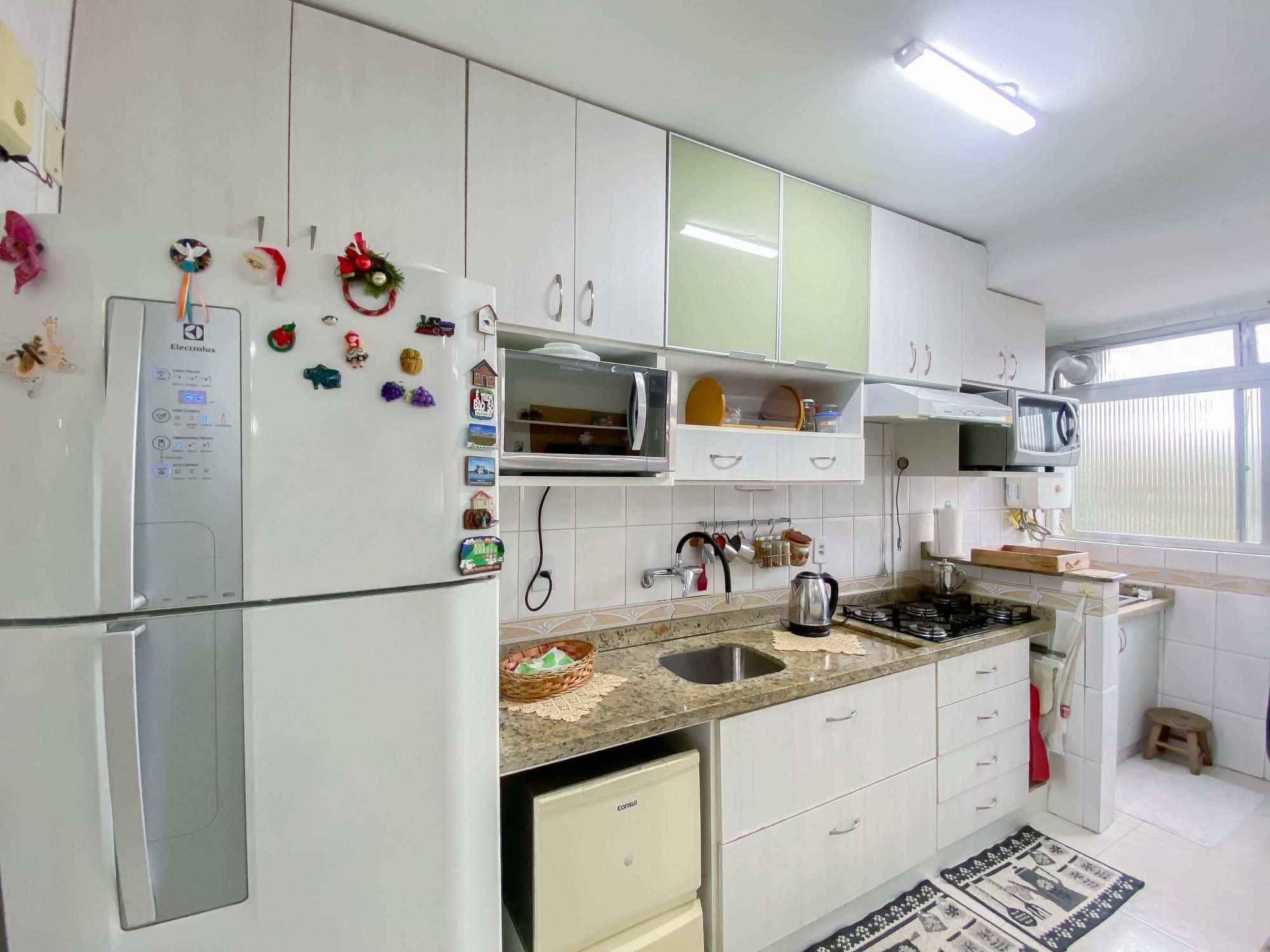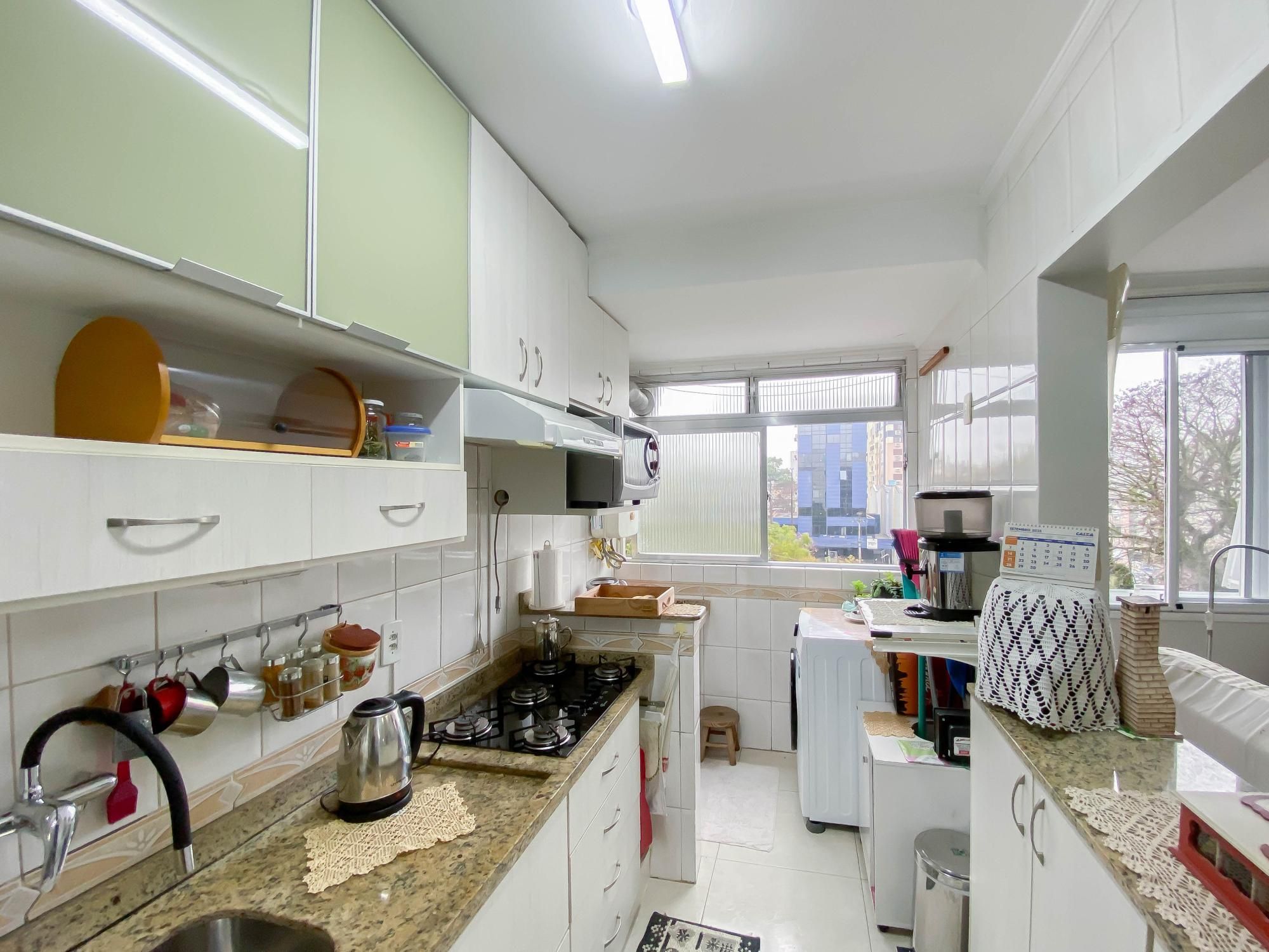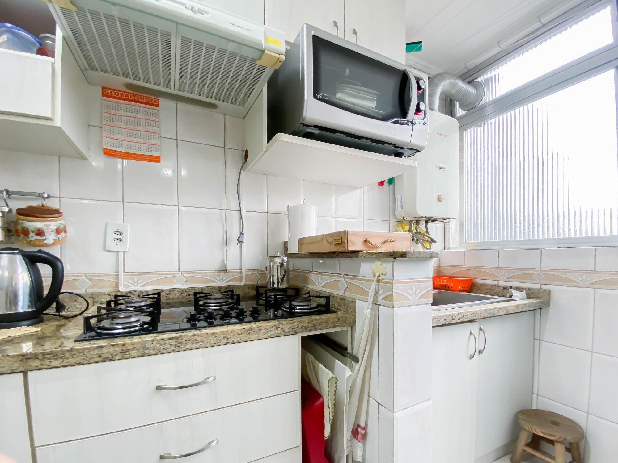 A cozinha é um destaque à parte: totalmente equipada com móveis planejados, balcão em granito e espaço funcional para eletrodomésticos. O banheiro possui box de vidro e bancada em granito.