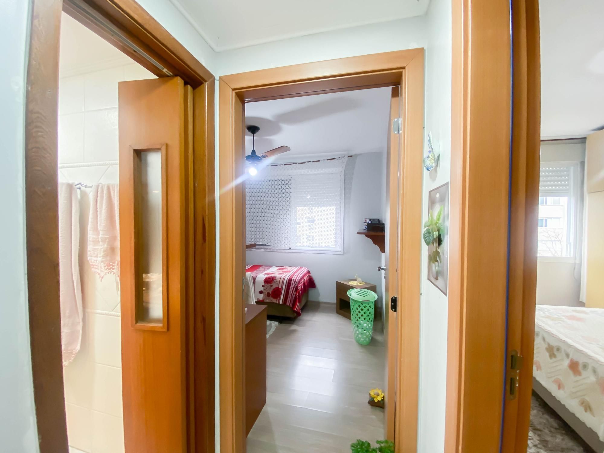 Dormitórios com guarda-roupas e estantes sob medida, otimizando o espaço;