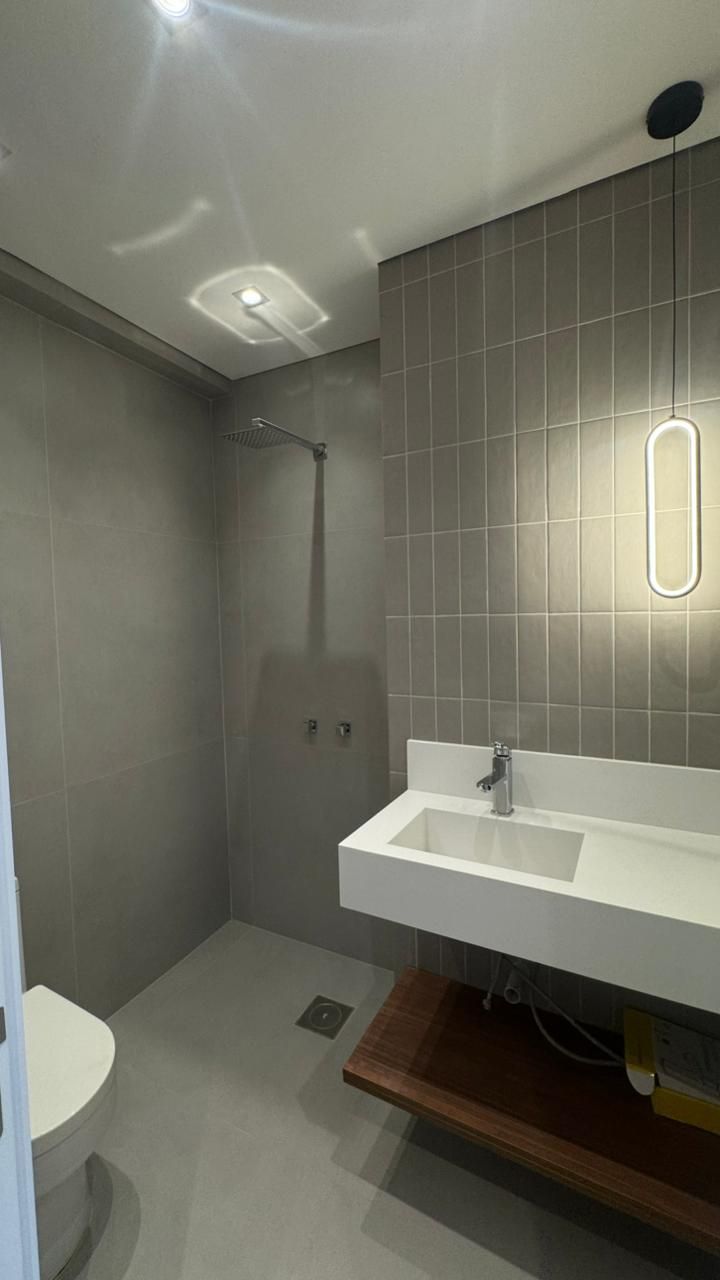 O living conta com parede em pedra estilo travertino, trazendo elegância ao ambiente. A cozinha é em conceito aberto, equipada com móveis sob medida, bancada em pedra branca e fogão por indução, além do pé-direito alto, proporcionando sensação de amplitude.