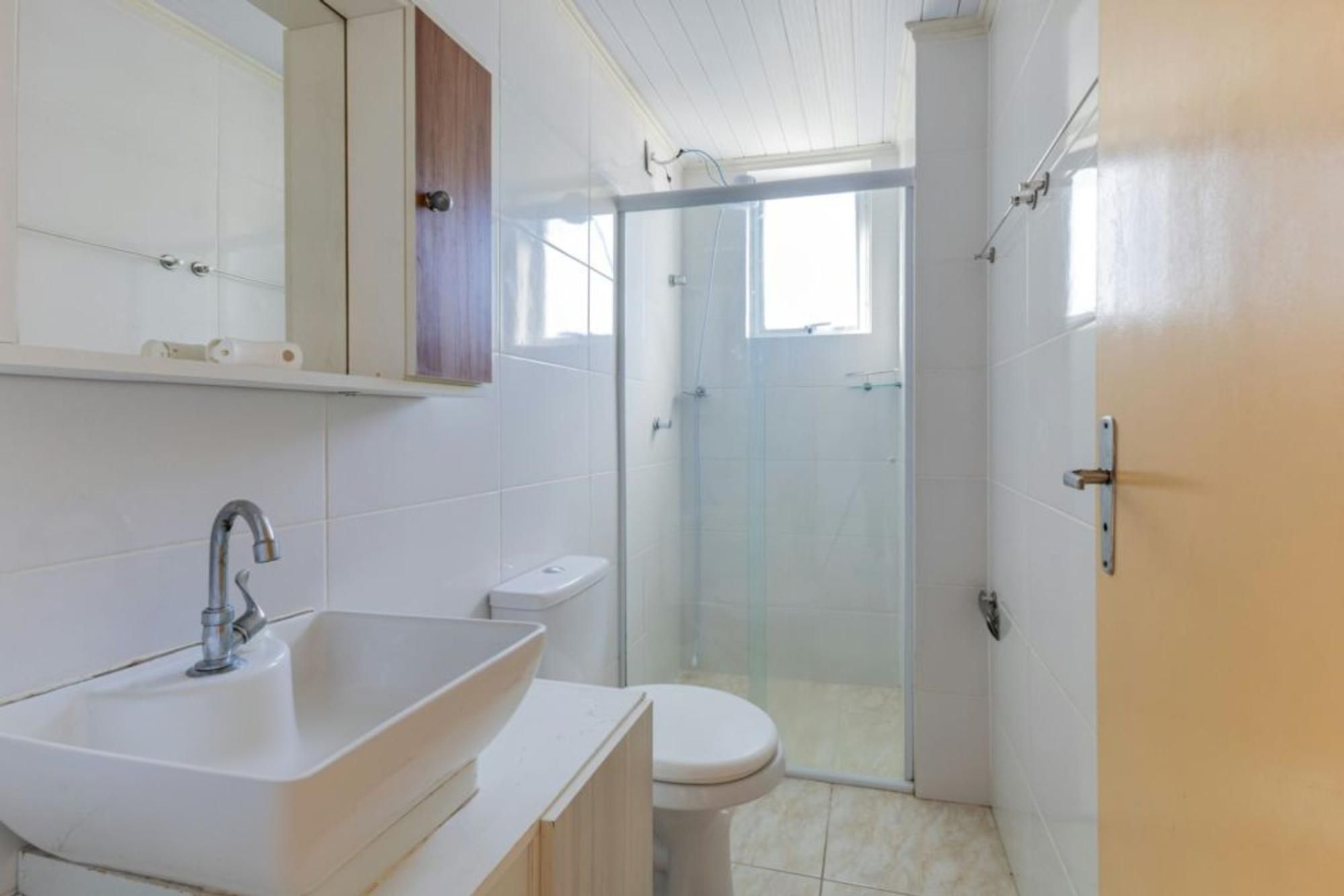 Banheiro principal arejado e iluminado, com móveis planejados, armários de pia e aéreo, box de vidro, totalmente revestido em cerâmica e com janela para ventilação natural.